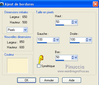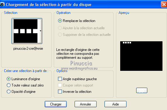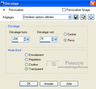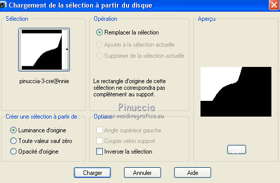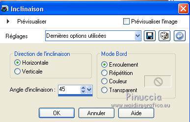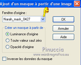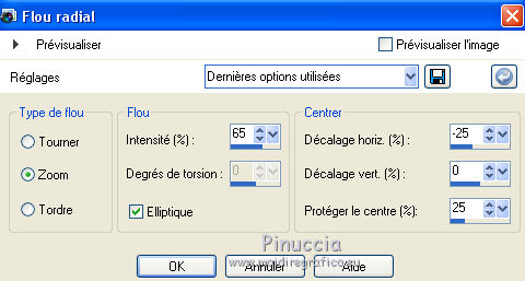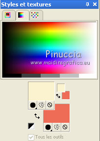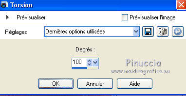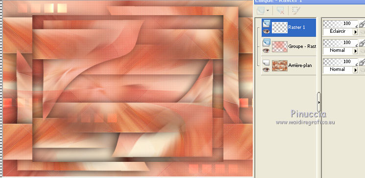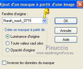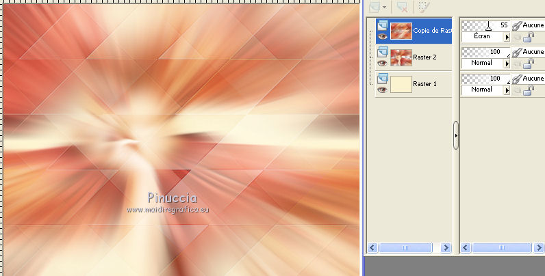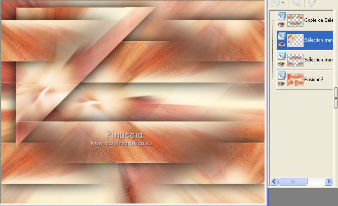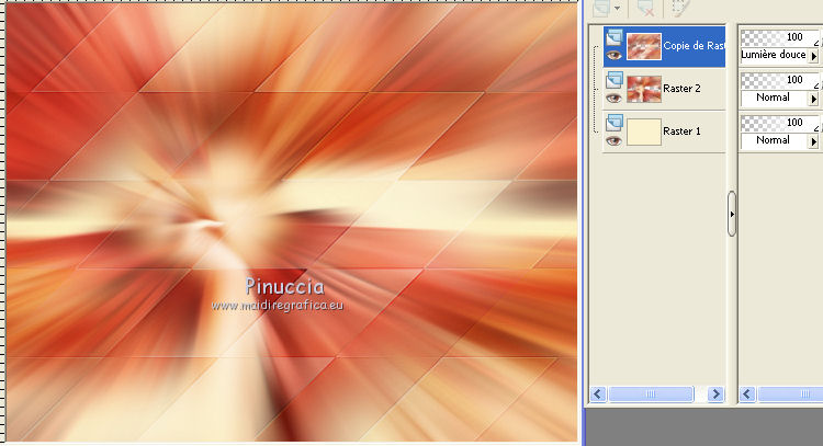 Merci beaucoup Annie pour ce superbe cadeau. Ce tutoriel a été créé avec CorelX6 et traduit avec CorelX12, mais il peut également être exécuté avec les autres versions. Suivant la version utilisée, vous pouvez obtenir des résultats différents. Depuis la version X4, la fonction Image>Miroir a été remplacée par Image>Renverser horizontalement, et Image>Renverser avec Image>Renverser verticalement . Dans les versions X5 et X6, les fonctions ont été améliorées par la mise à disposition du menu Objets. Avec la nouvelle version X7, nous avons encore Image>Miroir et Image>Renverser/Retourner, mais avec nouvelles différences. Voir les détails à ce sujet ici Certaines dénominations ont changées entre les versions de PSP. Les plus frequentes dénominations utilisées: ![]() Traduction en italien ici Vos versions ici Nécessaire pour réaliser ce tutoriel: Matériel ici Merci pour le tube Syl et pour les masques Narah. Garder le nom du tube. Le © appartient à l'artiste original. Garder le crédit de ceux qui ont créé le tube. Modules Externes: consulter, si nécessaire, ma section des filtres ici Filters Unlimited 2.0 ici It@lian Editors Effect - Mosaico ici Mura's Meister - Perspective Tiling ici Carolaine and Sensibility - CS-LDots ici VM Natural - Sparkle ici MV's Plugins - Panowarp ici Alien Skin Eye Candy 5 Impact - Perspective Shadow ici ![]() Placer le preset En cliquant sur le preset une ou deux fois (selon vos réglages) automatiquement il se placera directement dans le dossier Settings de Alien Skin Eye Candy. pourquoi un ou deux clic voir ici Placer les sélections dans le dossier Sélections. Ouvrir les masques dans PSP et les minimiser avec le reste du matériel. 1. Ouvrir une nouvelle image transparente 650 x 500 pixels. 2. Placer en avant plan la couleur claire #fbf3cf, et en arrière plan la couleur foncée #ee6c56. ![]() 3. Remplir l'image transparente avec la couleur d'avant plan.4. Calques>Nouveau calque raster. Sélections>Sélectionner tout. 5. Activer le tube SvB(883)Beauty. Sélectionner le watermark avec l'outil Sélection , rectangle,![]() Sélections>Inverser. Édition>Copier, et minimiser le tube: on va s'en servir plus tard. Revenir sur votre travail et Édition>Coller dans la sélection. Sélections>Désélectionner tout. 6. Effets>Effets d'image>Mosaïque sans jointures, par défaut. ![]() 7. Réglage>Flou>Flou radial. ![]() 8. Calques>Dupliquer. Image>Miroir. 9. Effets>Modules Externes>It@lian Editor Effect - Mosaico. ![]() 10. Effets>Effets géométriques>Inclinaison. ![]() 11. Effets>Effets de bords>Accentuer davantage. 12. Placer le calque en mode Lumière douce. ![]() 13. Calques>Dupliquer. Image>Miroir. Calques>Fusionner>Fusionner le calque de dessous. 14. Placer le calque en mode Écran et réduire l'opacité à 55%. ![]() 15. Effets>Effets de bords>Accentuer davantage. 16. Calques>Fusionner>Calques visibles. 17. Activer l'outil Sélection ![]() (peu importe le type de sélection, parce que avec la sélection personnalisée vous obtenez toujours un rectangle), cliquer sur Sélection personnalisée ![]() et setter ces paramètres. ![]() Sélections>Transformer la sélection en calque. Sélections>Désélectionner tout. 18. Effets>Effets d'image>Mosaïque sans jointures, comme précédemment. 19. Effets>Effets 3D>Ombre portée, couleur noire. ![]() 20. Calques>Dupliquer. Image>Renverser. 21. Vous positionner sur le calque du bas de la pile. 22. Sélections>Charger/Enregistrer une sélection>Charger à partir du disque. Chercher et charger la sélection pinuccia-1-cre@nnie. ![]() Sélections>Transformer la sélection en calque. Sélections>Désélectionner tout. 23. Effets>Effets 3D>Ombre portée, comme précédemment. 24. Image>Rotation libre - 45 degrés à gauche. ![]() 25. Effets>Effets d'image>Décalage. ![]() 26. Calques>Agencer>Déplacer vers le haut. ![]() 27. Effets>Effets de distorsion>Torsion. ![]() 28. Calques>Dupliquer. Image>Renverser. Image>Miroir. 29. Calques>Fusionner>Calques visibles. 30. Édition>Copier. 31. Sélections>Sélectionner tout. 32. Image>Ajouter des bordures, symétrique décoché, couleur d'avant plan. ![]() 33. Sélections>Inverser. Édition>Coller dans la sélection. 34. Image>Renverser. 35. Effets>Effets 3D>Ombre portée, comme précédemment. Sélections>Désélectionner tout. 36. Calques>Nouveau calque raster. Remplir avec la couleur d'arrière plan.37. Calques>Nouveau calque de masque>A partir d'une image. Ouvrir le menu deroulant sous la fenêtre d'origine et vous verrez la liste des images ouverts. Sélectionner le masque Narah_mask_0715. ![]() Calques>Fusionner>Fusionner le groupe. 38. Effets>Modules Externes>Carolaine and Sensibility - CS-LDots. ![]() 39. Calques>Nouveau calque raster. Sélections>Charger/Enregistrer une sélection>Charger à partir du disque. Chercher et charger la sélection pinuccia-2-cre@nnie. ![]() 40. Remplir la sélection avec la couleur d'arrière plan.Sélections>Désélectionner tout. 41. Calques>Dupliquer. Image>Renverser. Image>Miroir. Calques>Fusionner>Fusionner le calque de dessous. 42. Effets>Effets d'image>Mosaïque sans jointures. ![]() 43. Placer le calque en mode Éclaircir. ![]() 44. Vous positionner sur le calque du bas de la pile. Sélections>Charger/Enregistrer une sélection>Charger à partir du disque. Chercher et charger la sélection pinuccia-3-cre@nnie. ![]() 45. Effets>Modules Externes>VM Natural - Sparkle. ![]() 46. Sélections>Sélectionner tout. Image>Ajouter des bordures, symétrique décoché, comme précédemment. ![]() 47. Effets>Effets d'image>Mosaïque sans jointures, par défaut. ![]() 48. Sélections>Inverser. Effets>Modules Externes>Mura's Meister - Perspective Tiling. ![]() Sélections>Désélectionner tout. 49. Activer l'outil Baguette magique ![]() ![]() et cliquer sur la couleur unie pour la sélectionner. ![]() 50. Calques>Nouveau calque raster. Remplir la sélection avec la couleur d'avant plan.51. Calques>Nouveau calque de masque>A 