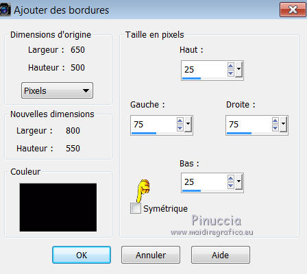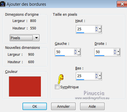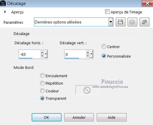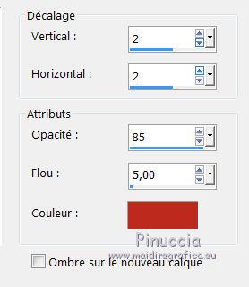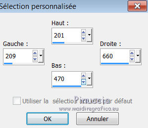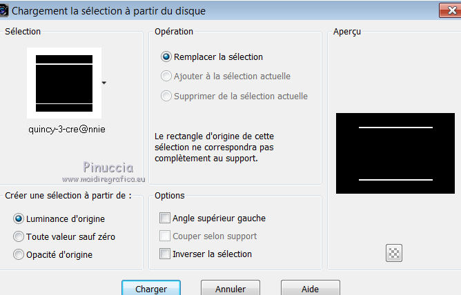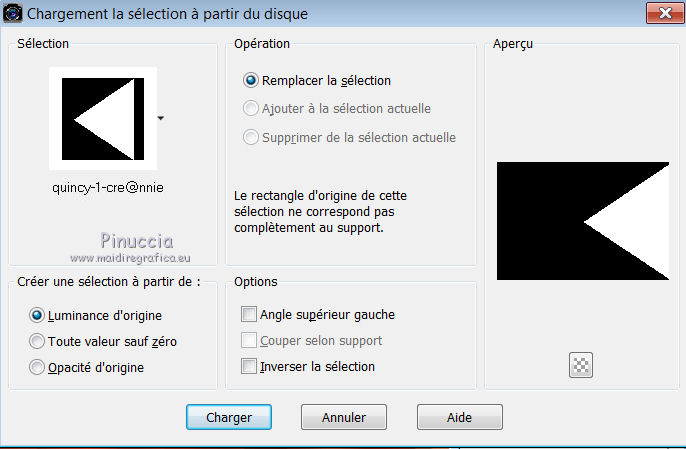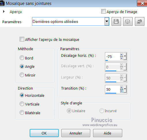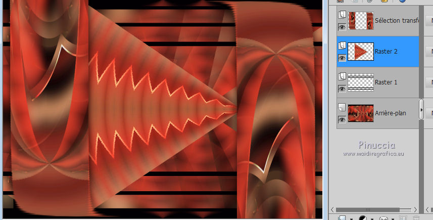 Ce tutoriel a été créé avec CorelX6 et traduit avec CorelX12, mais il peut également être exécuté avec les autres versions. Suivant la version utilisée, vous pouvez obtenir des résultats différents. Depuis la version X4, la fonction Image>Miroir a été remplacée par Image>Renverser horizontalement, et Image>Renverser avec Image>Renverser verticalement. Dans les versions X5 et X6, les fonctions ont été améliorées par la mise à disposition du menu Objets. Avec la nouvelle version X7, nous avons encore Image>Miroir et Image>Renverser/Retourner, mais avec nouvelles différences. Voir les détails à ce sujet ici Certaines dénominations ont changées entre les versions de PSP. Les plus frequentes dénominations utilisées: ![]() Traduction en italien ici Vos versions ici Nécessaire pour réaliser ce tutoriel: Matériel ici Merci: pour le tube Katjoes et pour le masque Narah Modules Externes: consulter, si nécessaire, ma section des filtres ici Filters Unlimited 2.0 ici AP Lines - Lines SilverLining ici VM Instant Art - Tripolis ici VM Distortion - Circulator II ici Mura's Meister - Perspective Tiling ici Filtres VM Instant Art et VM Distortion peuvent être utilisés seuls ou importés dans Filters Unlimited. voir comment le faire ici). Si un filtre est fourni avec cette icône, ![]() en fonction des couleurs utilisées, vous pouvez changer le mode mélange et l'opacité des calques. Placer les sélections dans le dossier Sélections. Ouvrir le masque dans PSP et le minimiser avec le reste du matériel. 1. Ouvrir une nouvelle image transparente 650 x 500 pixels. 2. Placer en avant plan la couleur claire #bd2a1d, et en arrière plan la couleur foncée #040205. ![]() 3. Remplir l'image transparente avec la couleur d'arrière plan.4. Sélections>Sélectionner tout. Ouvrir le tube Katjoes-woman-241 - Édition>Copier. ne pas fermer le tube; on va s'en servir plus tard Revenir sur votre travail et Édition>Coller dans la sélection. Sélections>Désélectionner tout. 5. Effets>Effets d'image>Mosaïque sans jointures, par défaut. ![]() 6. Réglage>Flou>Flou gaussien - rayon 20. ![]() 7. Calques>Dupliquer. 8. Effets>Modules Externes>VM Instant Art - Tripolis. ![]() 9. Effets>Effets de bords>Accentuer davantage. 10. Effets>Effets de bords>Dilater. 11. Effets>Modules Externes>VM Instant - Tripolis - changer seulement Tile Size avec 128. ![]() 12. Image>Redimensionner, à 70%, redimensionner tous les calques décoché. 13. Effets>Effets 3D>Ombre portée, couleur noire, ombre sur le nouveau calque coché. ![]() 14. Rester positionné sur le calque de l'ombre. Calques>Dupliquer. Image>Miroir. Image>Renverser. 15. Image>Ajouter des bordures, simétrique décoché, couleur d'arrière plan. ![]() 16. Calques>Dupliquer. Effets>Modules Externes>VM Distortion - Circulator II. ![]() 17. Activer l'outil Baguette magique ![]() ![]() et cliquer sur le triangle à droite pour le sélectionner. ![]() Presser CANC sur le clavier ![]() Sélections>Modifier la sélection et la zone sélectionnée deviendra rouge. ![]() Image>Miroir. À nouveau Sélections>Modifier la sélection et la zone rouger reviendra normale. ![]() 18. Édition>Couper - le commande coupe et garde en mémoire (et vous devrez garder en mémoire jusqu'à l'étape 28). Sélections>Désélectionner tout. 19. Effets>Effets d'image>Mosaïque sans jointures, comme précédemment. Calques>Fusionner>Fusionner le calque de dessous. 20. Effets>Effets d'image>Mosaïque sans jointures. ![]() 21. Sélections>Charger/Enregistrer une sélection>Charger à partir du disque. Chercher et charger la sélection quincy-1-cre@nnie. ![]() Sélections>Transformer la sélection en calque. Sélections>Désélectionner tout. 22. Effets>Effets de distorsion>Coordonnées polaires. ![]() 23. Effets>Effets 3D>Ombre portée, couleur noire, ombre sur le nouveau calque décoché. ![]() 24. Effets>Effets d'image>Décalage. ![]() 25. Calques>Dupliquer. Image>Renverser. Image>Miroir. Calques>Fusionner>Fusionner le calque de dessous. 26. Calques>Nouveau calque raster. Sélections>Charger/Enregistrer une sélection>Charger à partir du disque. Chercher et charger la sélection quincy-2-cre@nnie. ![]() Remplir la sélection avec la couleur d'arrière plan.27. Calques>Dupliquer. Image>Renverser. Calques>Fusionner>Fusionner le calque de dessous. 28. Calques>Agencer>Déplacer vers le bas. Édition>Coller comme nouveau calque (l'image coupée à l'étape 18 est en mémoire). ![]() 29. Image>Redimensionner, à 60%, redimensionner tous les calques décoché. 30. Effets>Effets d'image>Décalage. ![]() 31. Calques>Dupliquer. Image>Miroir. Réduire l'opacité de ce calque à 60%. Calques>Fusionner>Fusionner le calque de dessous. 32. Effets>Effets 3D>Ombre portée, comme précédemment. 33. Image>Ajouter des bordures, simétrique décoché, couleur d'avant plan. ![]() 34. Calques>Dupliquer. Effets>Effets d'image>Coordonnées polaires. ![]() 35. Activer l'outil Sélection ![]() (peu importe le type de sélection, parce que avec la sélection personnalisée vous obtenez toujours un rectangle), cliquer sur Sélection personnalisée ![]() et setter ces paramètres. ![]() Presser CANC sur le clavier. Sélections>Désélectionner tout. 36. Image>Ajouter des bordures, 25 pixels, simétrique, couleur d'arrière plan. 37. Effets>Effets d'image>Mosaïque sans jointures. ![]() 38. Activer le tube deco-quincy-1 - Édition>Copier. Revenir sur votre travail et Édition>Coller comme nouveau calque. Ne pas déplacer. 39. Calques>Nouveau calque raster. Sélections>Charger/Enregistrer une sélection>Charger à partir du disque. Chercher et charger la sélection quincy-3-cre@nnie. ![]() Remplir la sélection avec la couleur d'arrière plan.Sélections>Désélectionner tout. 40. Activer le tube deco-quincy-2 - Édition>Copier. Revenir sur votre travail et Édition>Coller comme nouveau calque. Ne pas déplacer. 41. Calques>Fusionner>Fusionner le calque de dessous - 2 fois. 42. Calques>Dupliquer. Ef
