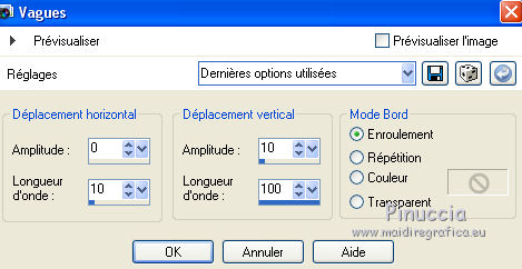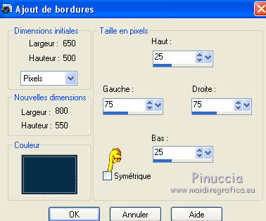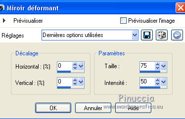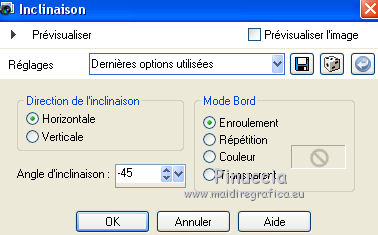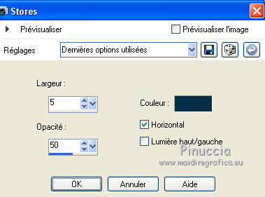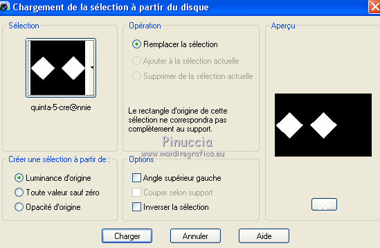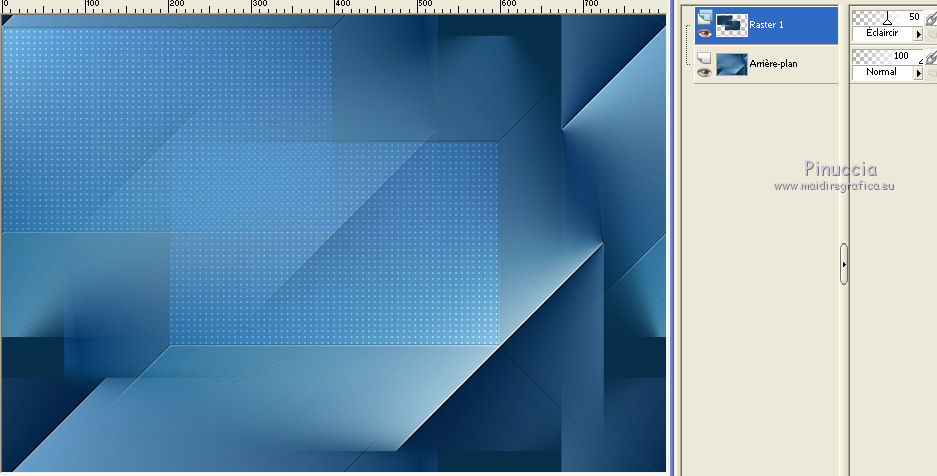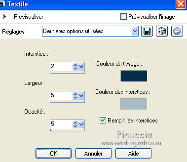 Ce tutoriel a été créé avec CorelX6 et traduit avec CorelX12, mais il peut également être exécuté avec les autres versions. Suivant la version utilisée, vous pouvez obtenir des résultats différents. Depuis la version X4, la fonction Image>Miroir a été remplacée par Image>Renverser horizontalement, et Image>Renverser avec Image>Renverser verticalement. Dans les versions X5 et X6, les fonctions ont été améliorées par la mise à disposition du menu Objets. Avec la nouvelle version X7, nous avons encore Image>Miroir et Image>Renverser/Retourner, mais avec nouvelles différences. Voir les détails à ce sujet ici Certaines dénominations ont changées entre les versions de PSP. Les plus frequentes dénominations utilisées: ![]() Traduction en italien ici Vos versions ici Nécessaire pour réaliser ce tutoriel: Matériel ici Pour le tube merci Min@ Modules Externes: consulter, si nécessaire, ma section des filtres ici Filters Unlimited 2.0 ici Render - Buttonmaker square (à importer dans Unlimited) ici Penta.com - Jeans ici AAA Frames - Foto Frame ici Mura's Meister - Perspective Tiling ici Filtres Penta.com peuvent être utilisés seuls ou importés dans Filters Unlimited. voir comment le faire ici). Si un filtre est fourni avec cette icône, ![]() en fonction des couleurs utilisées, vous pouvez changer le mode mélange et l'opacité des calques. Dans les plus récentes versions de PSP, vous ne trouvez pas le dégradé d'avant plan/arrière plan ou Corel_06_029. Vous pouvez utiliser le dégradé des versions antérieures. Ici le dossier Dégradés de CorelX. Placer les sélections dans le dossier Sélections. 1. Ouvrir une nouvelle image transparente 650 x 500 pixels. 2. Placer en avant plan la couleur claire #a9bbc7, et en arrière plan la couleur foncée #092e49. ![]() 3. Préparer en avant plan un dégradé de premier plan/arrière plan, style Radial. ![]() Remplir l'image transparente du dégradé.4. Effets>Modules Externes>Filters Unlimited 2.0 - Render - Buttonmaker square. ![]() 5. Effets>Effets de bords>Accentuer davantage. 6. Calques>Dupliquer. Image>Miroir. Image>Renverser. Placer le calque en mode Lumière dure. ![]() 7. Image>Ajouter des bordures, symétrique décoché, couleur d'arrière plan. ![]() 8. Effets>Effets d'image>Mosaïque sans jointures. ![]() 9. Activer l'outil Sélection ![]() (peu importe le type de sélection, parce que avec la sélection personnalisée vous obtenez toujours un rectangle), cliquer sur Sélection personnalisée ![]() et setter ces paramètres. ![]() 10. Calques>Nouveau calque raster. Remplir la sélection avec la couleur d'arrière plan.11. Effets>Effets de texture>Textile. Couleur du tissage: couleur d'arrière plan - couleur des interstices: couleur d'avant plan. ![]() Sélections>Désélectionner tout. 12. Effets>Effets d'image>Mosaïque sans jointures, comme précédemment. Placer le calque en mode Éclaircir et réduire l'opacité à 50%. ![]() 13. Vous positionner sur le calque du bas de la pile. Sélections>Charger/Enregistrer une sélection>Charger à partir du disque. Chercher et charger la sélection quinta-1-cre@nnie. ![]() 14. Effets>Effets de textures>Stores, couleur d'arrière plan. ![]() Sélections>Transformer la sélection en calque. Sélections>Désélectionner tout. 15. Effets>Effets d'image>Mosaïque sans jointures, comme précédemment. Image>Renverser. Calques>Agencer>Placer en haut de la pile. 16. Image>Ajouter des bordures, symétrique décoché, couleur d'avant plan. ![]() 17. Effets>Effets d'image>Mosaïque sans jointures. ![]() 18. Sélection personnalisée ![]() ![]() 19. Calques>Nouveau calque raster. Remplir la sélection avec la couleur d'arrière plan.20. Effets>Modules Externes>Penta.com - Jeans. ![]() Effets>Effets de bords>Eroder. Sélections>Désélectionner tout. 21. Effets>Effets 3DOmbre portée, couleur noire. ![]() 22. Calques>Dupliquer. Image>Renverser. Calques>Fusionner>Fusionner le calque de dessous. 23. Calques>Dupliquer. Image>Redimensionner, à 80%, redimensionner tous les calques décoché. 24. Effets>Effets de distorsion>Vagues. ![]() 25. Calques>Dupliquer. Image>Miroir. Calques>Fusionner>Fusionner le calque de dessous. 26. Image>Rotation libre - 90 degrés à droite. ![]() 27. Effets>Effets de distorsion>Miroir déformant. ![]() Calques>Agencer>Déplacer vers le bas. 28. Effets>Modules Externes>Mura's Meister - Perspective Tiling. ![]() Placer le calque en mode Assombrir. ![]() 29. Sélections>Charger/Enregistrer une sélection>Charger à partir du disque. Chercher et charger la sélection quinta-2-cre@nnie. ![]() Presser CANC sur le clavier - on doit cliquer plusieurs fois.Sélections>Désélectionner tout 30. Vous positionner sur le calque du haut de la pile. Image>Rotation à droite. 31. Effets>Effets de distorsion>Vent - vers la gauche, intensité 100. ![]() 32. Image>Rotation à gauche. 33. Calques>Nouveau calque raster. Sélections>Charger/Enregistrer une sélection>Charger à partir du disque. Chercher et charger la sélection quinta-3-cre@nnie. ![]() 34. À nouveau placer en avant plan la Couleur du début, et remplir la sélection avec la couleur d'avant plan.Sélections>Désélectionner tout. 35. Effets>Effets géométriques>Inclinaison. ![]() 36. Effets>Effets d'image>Décalage. ![]() 37. Calques>Dupliquer. Image>Miroir. Calques>Fusionner>Fusionner le calque de dessous. 38. Sélections>Charger/Enregistrer une sélection>Charger à partir du disque. Chercher et charger la sélection quinta-4-cre@nnie. ![]() Presser CANC sur le clavier. Sélections>Désélectionner tout. Calques>Agencer>Déplacer vers le bas. 39. Effets>Effets 3DOmbre portée, comme précédemment. Placer le calque en mode Recouvrement. ![]() 40. Effets>Effets d'image>Mosaïque sans jointures. ![]() 41. Calques>Dupliquer. Image>Renverser. 42. Image>Ajouter des bordures, comme précédemment. ![]() 43. Effets>Effets d'image>Mosaïque sans jointures. ![]() 44. Calques>Nouveau calque raster. Sélections>Ch