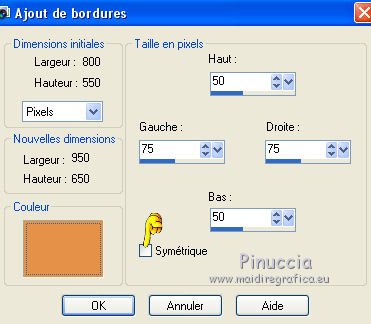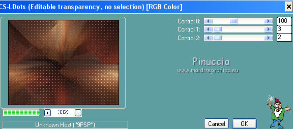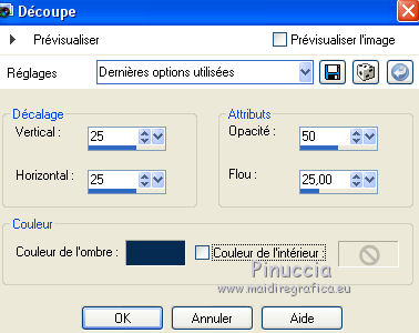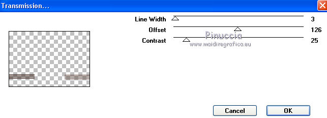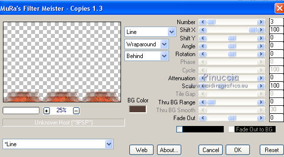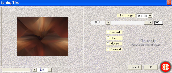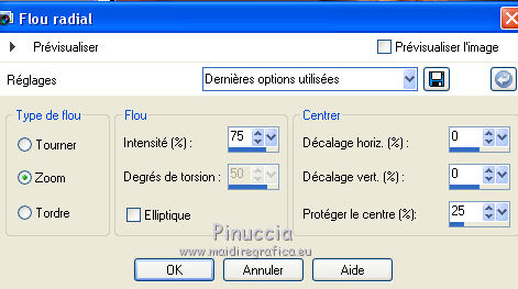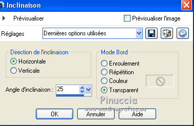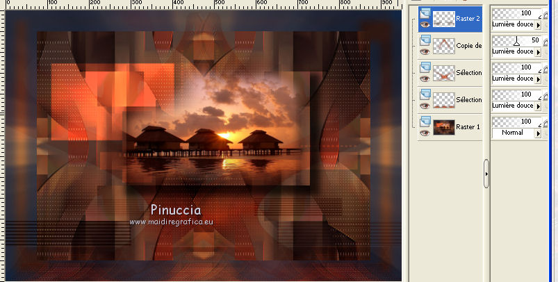 J'ai traduit ce tutoriel avec CorelX12, mais il peut également être exécuté avec les autres versions. Suivant la version utilisée, vous pouvez obtenir des résultats différents. Depuis la version X4, la fonction Image>Miroir a été remplacée par Image>Renverser horizontalement, et Image>Renverser avec Image>Renverser verticalement . Dans les versions X5 et X6, les fonctions ont été améliorées par la mise à disposition du menu Objets. Avec la nouvelle version X7, nous avons à nouveau Miroir/Retourner, mais avec nouvelles différences. Consulter, si vouz voulez, mes notes ici Certaines dénominations ont changées entre les versions de PSP. Les plus frequentes dénominations utilisées: ![]() Traduction en italien ici Vos versions ici Nécessaire pour réaliser ce tutoriel: Matériel ici Pour le masque et les tubes merci Nara, Mds e Cameron. Garder le nom du tube. Le © appartient à l'artiste original. Garder le crédit de ceux qui ont créé le tube. Modules Externes: consulter, si nécessaire, ma section des filtres ici Filters Unlimited 2.0 ici Carolaine and Sensibility CS-LDots ici Mehdi - Sorting Tiles, Weaver ici Mura's Meister - Copies ici Simple - Pizza Slice Mirror ici Toadies - What are you ici VM Extravaganza - Transmission ici Filtres Simple, Toadies et VM Extravaganza peuvent être utilisés seuls ou importés dans Filters Unlimited. voir comment le faire ici). Si un filtre est fourni avec cette icône, ![]() Si vous voulez utiliser vos propres couleurs, n'hésitez pas à changer le mode et l'opacité des calques Placer les sélections dans le dossier Sélections. Ouvrir le masque dans Psp et le minimiser avec le reste du matériel. 1. Ouvrir une nouvelle image transparente 650 x 500 pixels. 2. Placer en avant plan la couleur claire #e59147, et en arrière plan la couleur foncée #553e36. ![]() 3. Remplir l'image transparente avec la couleur d'arrière plan.4. Sélections>Sélectionner tout. Activer le tube TubeNP 1411, Édition>Copier. ne pas fermer le tube; on va s'en servir plus tard Revenir sur votre travail et Édition>Coller dans la sélection. Sélections>Désélectionner tout. 5. Effets>Effets d'image>Mosaïque sans jointures, par défaut. ![]() 6. Réglage>Flou>Flour radial. ![]() 7. Calques>Dupliquer. Image>Miroir. 8. Placer le calque en mode Lumière douce et réduire l'opacité à 50%. Calques>Fusionner>Fusionner le calque de dessous. 9. Effets>Modules Externes>Mehdi - Sorting Tiles. ![]() Effets>Effets de bords>Accentuer. 10. Sélection>Charger/Enregistrer une sélection>Charger à partir du disque. Charger à nouveau la sélection rafiya-1-cre@nnie. ![]() Sélections>Transformer la sélection en calque. 11. Effets>Modules Externes>Mehdi - Sorting Tiles. ![]() Sélections>Désélectionner tout. 12. Effets>Modules Externes>Simple - Pizza slice mirror. 13. Sélection>Charger/Enregistrer une sélection>Charger à partir du disque. Charger à nouveau la sélection rafiya-2-cre@nnie. ![]() Presser CANC sur le clavier ![]() Sélections>Désélectionner tout. 14. Effets>Effets 3D>Ombre portée, couleur noire. ![]() 15. Vous positionner sur le calque du bas de la pile. Effets>Modules Externes>Carolaine and Sensibility - CS-LDots. ![]() 16. Image>Ajouter des bordures, symétrique décoché, couleur d'arrière plan. ![]() 17. Effets>Effets géométriques>Cylindre horizontal. ![]() 18. Effets>Effets d'image>Mosaïque sans jointures, comme précédemment. 19. Calques>Nouveau calque raster. Remplir avec la couleur d'avant plan.20. Calques>Nouveau calque de masque>A partir d'une image. Ouvrir le menu deroulant sous la fenêtre d'origine et vous verrez la liste des images ouverts. Charger le masque maskcameron_plate1. ![]() Calques>Fusionner>Fusionner le groupe. 21. Placer le calque en mode Éclaircir et réduire l'opacité à 65%. ![]() 22. Sélections>Sélectionner tout. Image>Ajouter des bordures, symétrique décoché, couleur d'avant plan. ![]() 23. Effets>Effets d'image>Mosaïque sans jointures, comme précédemment. 24. Sélections>Inverser. Réglage>Flou>Flou radial, comme précédemment. 25. Effets>Effets 3D>Découpe. ![]() Répéter Découpe, mais avec vertical et horizontal à -25. 26. Activer l'outil Sélection ![]() (peu importe le type de sélection, parce que avec la sélection personnalisée vous obtenez toujours un rectangle), cliquer sur Sélection personnalisée ![]() et setter ces paramètres. ![]() 27. Activer le tube mds10076_island, Édition>Copier. Revenir sur votre travail et Édition>Coller dans la sélection. 28. Effets>Effets 3D>Ombre portée, couleur noire. ![]() 29. Sélection personnalisée ![]() ![]() Sélections>Transformer la sélection en calque. Sélections>Désélectionner tout. 30. Effets>Effets d'image>Décalage. ![]() 31. Effets>Modules Externes>Mehdi - Weaver. ![]() 32. Effets>Effets de distorsion>Vagues. ![]() 33. Calques>Dupliquer. Image>Miroir. Calques>Fusionner>Fusionner le calque de dessous. Placer le calque en mode Lumière douce. ![]() 34. Calques>Dupliquer. Image>Renverser. 35. Effets>Effets géométriques>Cylindre horizontal, comme précédemment. 36. Effets>Effets géométriques>Cercle. ![]() Réduire l'opacité de ce calque à 50%. Effets>Effets de bords>Accentuer davantage. 37. Vous positionner sur le calque du bas de la pile. 38. Sélection personnalisée , comme précédemment.![]() Sélections>Transformer la sélection en calque. Sélections>Désélectionner tout. 39. Effets>Effets géométriques>Inclinaison. ![]() 40. Effets>Effets d'image>Décalage. ![]() 41. Calques>Dupliquer. Image>Miroir. Calques>Fusionner>Fusionner le calque de dessous. 42. Effets>Modules Externes>Toadies - What are you. ![]() 43. Effets>Effets de bords>Accentuer davantage. 44. Effets>Effets géométriques>Cylindre horizontal, comme précédemment. 45. Effets>Modules Externes>Mura's Meister - Copies. ![]() Placer le calque en mode Lumière douce. ![]() 46. Calques>Nouveau calque raster. Calques>Agencer>Placer en haut de la pile. 47. Sé
