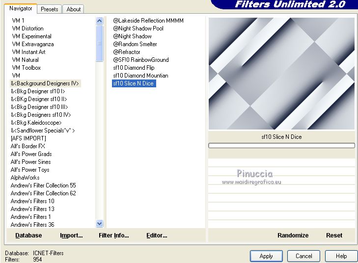 Effets>Modules Externes>Filters Unlimited 2.0 - &<Background Designers IV> - sf10 slice n dice.