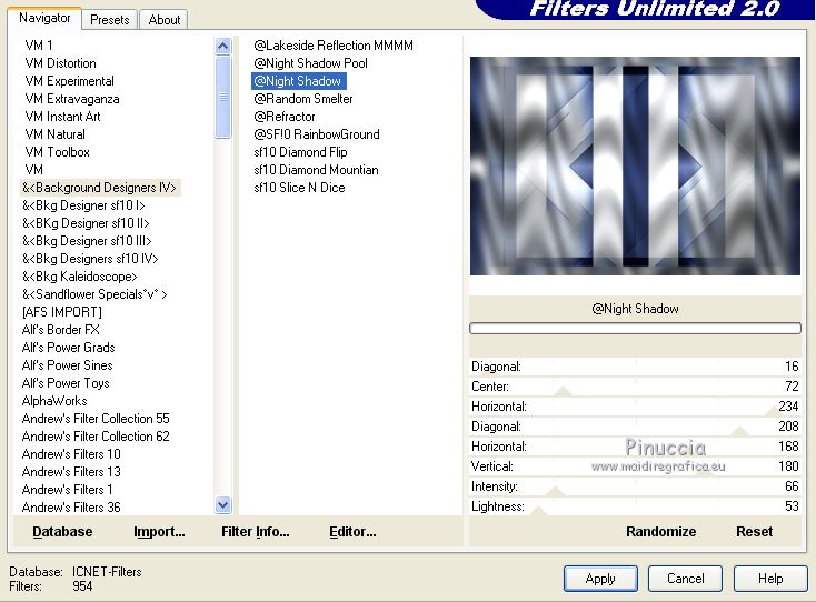 14. Effets>Modules Externes>Filters Unlimited 2.0 - &<Background Designers IV> - @Night Shadow.