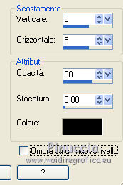 qui puoi trovare qualche risposta ai tuoi dubbi. Se l'argomento che ti interessa non è presente, ti prego di segnalarmelo. Questo tutorial è stato creato con PSP X2 e tradotto con PSP X, ma può essere eseguito anche con le altre versioni di PSP. Dalla versione X4, il comando Immagine>Rifletti è stato sostituito con Immagine>Capovolgi in orizzontale, e il comando Immagine>Capovolgi con Immagine>Capovolgi in verticale. Nelle versioni X5 e X6, le funzioni sono state migliorate rendendo disponibile il menu Oggetti. Con la versione X7 sono tornati i comandi Immagine>Rifletti e Immagine>Capovolgi, ma con nuove funzioni. Vedi la scheda sull'argomento qui Le vostre versioni qui Occorrente: Materiale qui ![]() se stai usando altri colori, sperimenta le modalità di miscelatura e opacità più adatte ai tuoi colori 1. Imposta il colore di primo piano con il colore chiaro #f68600, e il colore di sfondo con il colore scuro #020000. ![]() 2. Apri una nuova immagine trasparente 650 x 450 pixels, e riempila con il colore di sfondo.3. Apri il tube Hw-SpookyNights-tracie04-top header e vai a Modifica>Copia. non chiuderlo perchè ti servirà ancora. Torna al tuo lavoro e vai a Modifica>Incolla come nuovo livello. 4. Effetti>Effetti di immagine>Motivo unico. ![]() 5. Regola>Sfocatura>Sfocatura radiale. ![]() 6. Apri il tube halloween_witch e vai a Modifica>Copia. Torna al tuo lavoro e vai a Modifica>incolla come nuovo livello. Spostalo un po' più in alto.7. Livelli>Unisci>Unisci visibile. 8. Immagine>Ridimensiona, al 70%, tutti i livelli non selezionato. Sposta l'immagine un po' più in basso.9. Apri il tube BDR Scarecow_vsc e vai a Modifica>Copia. Torna al tuo lavoro e vai a Modifica>Incolla come nuovo livello. Immagine>Ridimensiona, al 60%, tutti i livelli non selezionato. 10. Effetti>Effetti 3D>Sfalsa ombra. ![]() Spostalo a sinistra.![]() 11. Apri il tube CornerBatWeb_Nicole e vai a Modifica>Copia. Torna al tuo lavoro e vai a Modifica>Incolla come nuovo livello. Immagine>Ridimensiona, al 60%, tutti i livelli non selezionato. Immagine>Rifletti. Spostalo in alto a destra.12. Attiva lo strumento Gomma ![]() ![]() e cancella la parte del tube sopra lo spaventapasseri. ![]() Regola>Messa a fuoco>Accentua messa a fuoco. 13. Attiva nuovamente il tube Hw-SpookyNights-etc.... e vai a Modifica>Copia. Torna al tuo lavoro e vai a Modifica>Incolla come nuovo livello. Immagine>Ridimensiona, al 70%, tutti i livelli non selezionato. Spostalo in basso, come nel mio esempio.14. Effetti>Effetti 3D>Sfalsa ombra, con i settaggi precedenti. 15. Apri il tube halloCornGar2Shea e vai a Modifica>Copia. Torna al tuo lavoro e vai a Modifica>Incolla come nuovo livello. Spostalo a destra, come nel mio esempio.16. Effetti>Effetti 3D>Sfalsa ombra, con i settaggi precedenti. 17. Aggiungi il tuo nome e/o il tuo watermark su un nuovo livello (non posizionarlo a destra). 18. Livelli>Unisci>Unisci visibile, e salva in formato png per conservare la trasparenza dello sfondo. ![]() Se hai problemi o dubbi, o trovi un link non funzionante, o anche soltanto per un saluto, scrivimi. 15 Ottobre 2013 |