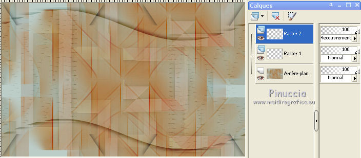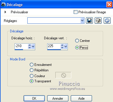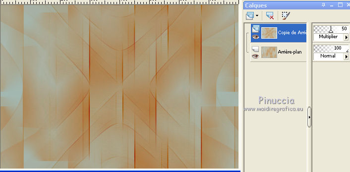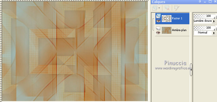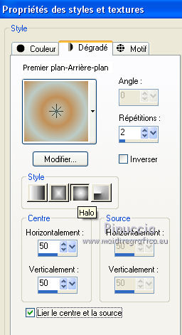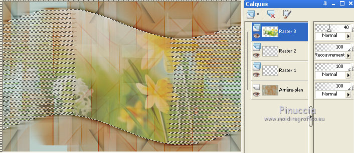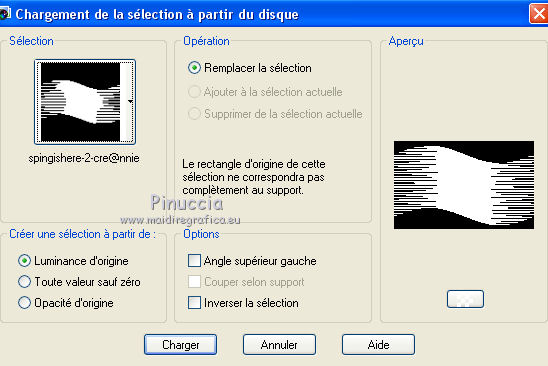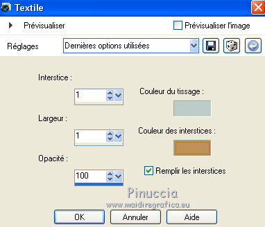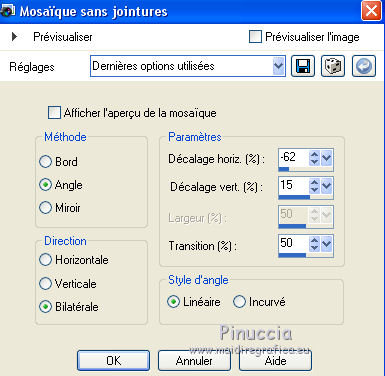 Ce tutoriel a été créé avec CorelX6 et traduit avec CorelX12, mais il peut également être exécuté avec les autres versions. Suivant la version utilisée, vous pouvez obtenir des résultats différents. Depuis la version X4, la fonction Image>Miroir a été remplacée par Image>Renverser horizontalement, et Image>Renverser avec Image>Renverser verticalement. Dans les versions X5 et X6, les fonctions ont été améliorées par la mise à disposition du menu Objets. Avec la nouvelle version X7, nous avons encore Image>Miroir et Image>Renverser/Retourner, mais avec nouvelles différences. Voir les détails à ce sujet ici Certaines dénominations ont changées entre les versions de PSP. Les plus frequentes dénominations utilisées: ![]() Traduction en italien ici Vos versions ici Nécessaire pour réaliser ce tutoriel: Matériel ici Pour les tubes merci Shanna Garder le nom du tube. Le © appartient à l'artiste original. Garder le crédit de ceux qui ont créé le tube. Modules Externes: consulter, si nécessaire, ma section des filtres ici Filters Unlimited 2.0 ici Simple - Pizza Slice Mirror ici DSB Flux - Linear Transmission, Center Mirror ici Mura's Meister - Perspective Tiling ici Filtres Simple peuvent être utilisés seuls ou importés dans Filters Unlimited. voir comment le faire ici). Si un filtre est fourni avec cette icône, ![]() en fonction des couleurs utilisées, vous pouvez changer le mode mélange et l'opacité des calques. Placer les sélections dans le dossier Sélections. 1. Ouvrir une nouvelle image transparente 650 x 500 pixels. 2. Placer en avant plan la couleur claire #bcccc7, et en arrière plan la couleur foncée #c29057. ![]() 3. Préparer un dégradé de premier plan/arrière plan, style Halo. ![]() 4. Remplir l'image transparente du dégradé.5. Effets>Modules Externes>DSB Flux - Linear Transmission. ![]() Effets>Effets de bords>Accentuer davantage. 6. Calques>Dupliquer. Image>Miroir. Placer le calque en mode Lumière douce et réduire l'opacité à 50%. 7. Calques>Fusionner>Fusionner le calque de dessous. Effets>Effets de bords>Eroder. 8. Image>Ajouter des bordures, symétrique décoché, couleur d'avant plan. ![]() 9. Effets>Effets d'image>Mosaïque sans jointures. ![]() 10. Calques>Dupliquer. Effets>Modules Externes>DSB Flux - Center Mirror. ![]() 11. Placer le calque en mode Multiplier et réduire l'opacité à 50%. ![]() 12. Effets>Effets de bords>Eroder. Calques>Fusionner>Fusionner le calque de dessous. 13. Placer en avant plan la couleur du début. ![]() Calques>Nouveau calque raster. Activer l'outil Sélection ![]() (peu importe le type de sélection, parce que avec la sélection personnalisée vous obtenez toujours un rectangle), cliquer sur Sélection personnalisée ![]() et setter ces paramètres. ![]() Remplir la sélection avec le couleur d'avant plan.14. Sélections>Modifier>Contracter - 50 pixels. Presser CANC sur le clavier ![]() Sélections>Désélectionner tout. 15. Effets>Effets d'image>Mosaïque sans jointures, comme précédemment. 16. Effets>Effets d'image>Décalage. ![]() 17. Effets>Effets de textures>Textile. Couleur du tissage: couleur d'avant plan - Couleur des interstices: couleur d'arrière plan. ![]() 18. Effets>Effets 3D>Ombre portée, couleur noire. ![]() 19. Calques>Dupliquer. Placer le calque en mode Assombrir. ![]() Calques>Fusionner>Fusionner le calque de dessous. 20. Effets>Modules Externes>Simple - Pizza Slice Mirror. 21. Placer le calque en mode Lumière douce. ![]() Réglage>Netteté>Netteté. 22. Image>Ajouter des bordures, symétrique décoché, comme précédemment. ![]() 23. Image>Miroir. Effets>Effets d'image>Mosaïque sans jointures, comme précédemment. 24. Calques>Nouveau calque raster. Sélections>Charger/Enregistrer une sélection>Charger à partir du disque. Chercher et charger la sélection springishere-1-cre@nnie. ![]() 25. Effets>Effets 3D>Ombre portée, couleur noire. ![]() Sélections>Désélectionner tout. 26. Calques>Dupliquer. Image>Miroir. Image>Renverser. Calques>Fusionner>Fusionner le calque de dessous. 27. Calques>Dupliquer. Image>Miroir. Calques>Fusionner>Fusionner le calque de dessous. 28. Sélections personnalisée ![]() ![]() Presser CANC sur le clavier ![]() Garder sélectionné. 29. Calques>Nouveau calque raster. Effets>Effets 3D>Ombre portée, comme précédemment. Sélections>Désélectionner tout. 30. Calques>Dupliquer. Image>Renverser. Calques>Fusionner>Fusionner le calque de dessous. 31. Effets>Effets de distorsion>Vagues. ![]() 32. Placer le calque en mode Recouvrement. ![]() 33. Calques>Nouveau calque raster. Sélections>Charger/Enregistrer une sélection>Charger à partir du disque. Chercher et charger la sélection springishere-2-cre@nnie. ![]() 34. Activer l'image de fond "spring", Édition>Copier. Revenir sur votre travail et Édition>Coller dans la sélection. Réduire l'opacité de ce calque à 40%. ![]() 35. Sélections>Sélectionner tout. Image>Ajouter des bordures, 25 pixels, symétrique, couleur d'arrière plan. Image>Ajouter des bordures, 25 pixels, symétrique, couleur d'avant plan. 36. Effets>Effets d'image>Mosaïque sans jointures, comme précédemment. Effets>Effets 3D>Ombre portée, comme précédemment. 37. Sélections>Sélectionner tout. Édition>Copier. 38. Image>Ajouter des bordures, symétrique décoché, couleur d'avant plan. ![]() 39. Sélections>Inverser. Édition>Coller dans la sélection. 40. Effets>Effets 3D>Ombre portée, couleur noire. ![]() Sélections>Désélectionner tout. 41. Calques>Dupliquer. Effets>Modules Externes>Mura's Meister - Perspective Tiling. ![]() 42. Effets>Effets 3D>Ombre portée, comme précédemment. 43. Activer le cadre spring is here!. Fenêtre>Dupliquer, ou sur le clavier shift+D pour faire une copie. Fermer l'original. Sur la copie: activer l'outil Sélection au lasso ou Sélection ![]() et sélectionner le watermark ![]() Presser CANC sur le clavier. Sélections>Désélectionner tout. 44. Activer à nouveau l'image de fond S