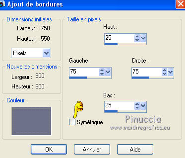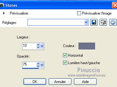 Ce tutoriel a été créé avec CorelX6 et traduit avec CorelX12, mais il peut également être exécuté avec les autres versions. Suivant la version utilisée, vous pouvez obtenir des résultats différents. Depuis la version X4, la fonction Image>Miroir a été remplacée par Image>Renverser horizontalement, et Image>Renverser avec Image>Renverser verticalement. Dans les versions X5 et X6, les fonctions ont été améliorées par la mise à disposition du menu Objets. Avec la nouvelle version X7, nous avons encore Image>Miroir et Image>Renverser/Retourner, mais avec nouvelles différences. Voir les détails à ce sujet ici Certaines dénominations ont changées entre les versions de PSP. Les plus frequentes dénominations utilisées: ![]() Traduction en italien ici Vos versions ici Nécessaire pour réaliser ce tutoriel: Matériel ici Merci pour le tube Syl Modules Externes: consulter, si nécessaire, ma section des filtres ici Filters Unlimited 2.0 ici Carolaine and Sensibility - CS-LDots ici VM Experimental ici Mura's Meister - Perspective Tiling ici Filtres VM Experimental peuvent être utilisés seuls ou importés dans Filters Unlimited. voir comment le faire ici). Si un filtre est fourni avec cette icône, ![]() en fonction des couleurs utilisées, vous pouvez changer le mode mélange et l'opacité des calques. Placer les sélections dans le dossier Sélections. 1. Ouvrir une nouvelle image transparente 650 x 500 pixels. 2. Placer en avant plan la couleur claire #e6edfe, et en arrière plan la couleur foncée #6d718a. ![]() 3. Remplir l'image transparente avec la couleur d'avant plan.4. Sélections>Sélectionner tout. Activer le tube SvB(929)Beauty, effacer le watermark, Édition>Copier. ne pas fermer le tube; on va s'en servir plus tard Revenir sur votre travail et Édition>Coller dans la sélection. Sélections>Désélectionner tout. 5. Effets>Effets d'image>Mosaïque sans jointures, par défaut. ![]() 6. Réglage>Flou>Flou gaussien - rayon 25. ![]() 7. Calques>Dupliquer. Effets>Modules Externes>VM Experimental - Needles and pins. ![]() 8. Calques>Fusionner>Fusionner le calque de dessous. 9. Calques>Dupliquer. Effets>Modules Externes>VM Experimental - Guess what? ![]() 10. Effets>Effets 3D>Ombre portée, couleur noire. ![]() 11. Calques>Dupliquer. Image>Miroir. Image>Renverser. Placer le calque en mode Lumière douce. ![]() 12. Calques>Fusionner>Calques visibles. 13. Édition>Copier. 14. Image>Ajouter des bordures, symétrique décoché, couleur d'arrière plan. ![]() 15. Effets>Modules Externes>Mura's Meister - Perspective Tiling. ![]() 16. Activer l'outil Sélection ![]() (peu importe le type de sélection, parce que avec la sélection personnalisée vous obtenez toujours un rectangle), cliquer sur Sélection personnalisée ![]() et setter ces paramètres. ![]() Presser CANC sur le clavier ![]() 17. Activer l'outil Baguette magique ![]() ![]() cliquer sur la couleur unie pour la sélectionner. ![]() 18. Édition>Coller dans la sélection. 19. Effets>Effets 3D>Ombre portée, couleur noire. ![]() 20. Sélections>Inverser. Effets>Effets 3D>Ombre portée, comme précédemment. Sélections>Désélectionner tout. 21. Image>Ajouter des bordures, symétrique décoché, couleur d'arrière plan. ![]() 22. Effets>Effets d'image>Mosaïque sans jointures. ![]() 23. Sélection personnalisée ![]() ![]() Remplir la sélection avec la couleur d'avant plan.Réduire l'opacité de ce calque à 50%. 24. Effets>Effets de textures>Stores, couleur d'arrière plan. ![]() 25. Effets>Effets 3D>Ombre portée, couleur noire. ![]() Sélections>Désélectionner tout. 26. Calques>Dupliquer. Image>Miroir. Calques>Fusionner>Fusionner le calque de dessous. 27. Calques>Nouveau calque raster. Sélections>Charger/Enregistrer une sélection>Charger à partir du disque. Chercher et charger la sélection syl-1-cre@nnie. ![]() Remplir la sélection avec la couleur d'arrière plan.28. Effets>Modules Externes>Carolaine and Sensibility - CS-LDots. ![]() 29. Effets>Effets 3D>Ombre portée, comme précédemment. Sélections>Désélectionner tout. 30. Effets>Modules Externes>Carolaine and Sensibility - CS-LDots, comme précédemment. 31. Calques>Fusionner>Fusionner le calque de dessous. 32. Calques>Dupliquer. Placer le calque en mode Multiplier et réduire l'opacité à 75%. ![]() 33. Vous positionner sur le calque du bas de la pile. Activer l'outil Baguette magique ![]() et cliquer sur le bords en haut et en bas pour les sélectionner. ![]() 34. Effets>Modules Externes>Carolaine and Sensibility - CS-LDots, comme précédemment. Effets>Effets 3D>Ombre portée, comme précédemment. Sélections>Désélectionner tout. 35. Image>Ajouter des bordures, symétrique décoché, couleur d'arrière plan. ![]() 36. Effets>Effets d'image>Mosaïque sans jointures, comme précédemment. 37. Sélection personnalisée ![]() ![]() Sélections>Transformer la sélection en calque. 38. Effets>Modules Externes>VM Experimental - Needles and pins. ![]() Sélections>Désélectionner tout. 39. Image>Rotation à droite. 40. Effets>Effets de distorsion>Vent - vers la gauche, intensité 100. ![]() 41. Image>Rotation à gauche. 42. Effets>Effets d'image>Mosaïque sans jointures, comme précédemment. Effets>Effets de bords>Accentuer davantage. 43. Réglage>Ajouter/Supprimer du bruit>Ajouter du bruit. ![]() 44. Vous positionner sur le calque du bas de la pile. Sélection personnalisée ![]() ![]() Sélections>Transformer la sélection en calque. 45. Effets>Modules Externes>VM Experimental - Teewee. ![]() 46. Placer le calque en mode Lumière douce. ![]() Sélections>Désélectionner tout. 47. Calques>Dupliquer. Effets>Effets d'image>Décalage. ![]() 48. Sélections>Charger/Enregistrer une sélection>Charger à partir du disque. Chercher et charger la sélection syl-2-cre@nnie. ![]() Presser CANC sur le clavier .Sélections>Désélectionner tout. 49. Placer le calque en mode Recouvrement. ![]() 50. Activer le tube 21245. Activer l'outil Sélection ![](