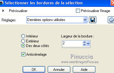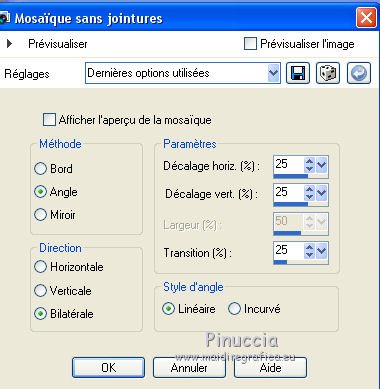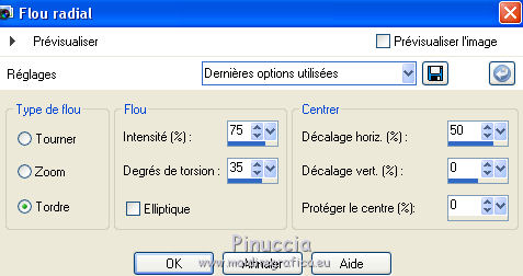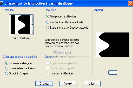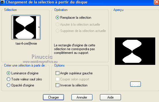Ce tutoriel a été créé avec CorelX6 et traduit avec CorelX12, mais peut également être exécuté avec les autres versions. Suivant la version utilisée, vous pouvez obtenir des résultats différents. Depuis la version X4, la fonction Image>Miroir a été remplacée par Image>Renverser horizontalement, et Image>Renverser avec Image>Renverser verticalement. Dans les versions X5 et X6, les fonctions ont été améliorées par la mise à disposition du menu Objets. Avec la nouvelle version X7, nous avons encore Image>Miroir et Image>Renverser/Retourner, mais avec nouvelles différences. Voir les détails à ce sujet ici Certaines dénominations ont changées entre les versions de PSP. Les plus frequentes dénominations utilisées: ![]() Traduction en italien ici Vos versions ici Nécessaire pour réaliser ce tutoriel: Matériel ici Pour le tube merci AnaRidzi Modules Externes: consulter, si nécessaire, ma section des filtres ici Filters Unlimited 2.0 ici AAA Frames - Foto Frame ici L&K's - Zitah ici Toadies ici VM Distortion ici Filtres Toadies et VM Distortion peuvent être utilisés seuls ou importés dans Filters Unlimited. voir comment le faire ici). Si un filtre est fourni avec cette icône, ![]() en fonction des couleurs utilisées, vous pouvez changer le mode mélange et l'opacité des calques. Dans les plus récentes versions de PSP, vous ne trouvez pas le dégradé d'avant plan/arrière plan ou Corel_06_029. Vous pouvez utiliser le dégradé des versions antérieures. Ici le dossier Dégradés de CorelX. Placer le preset Emboss 3 dans le dossier Paramètres par défaut. Placer le masque 20.20 dans le dossier Masques. Placer les sélections dans le dossier Sélections. 1. Placer en avant plan la couleur claire #81efa7, et en arrière plan la couleur foncée #ff5638. ![]() 2. Ouvrir une nouvelle image transparente 650 x 500 pixels, et remplir avec la couleur d'arrière plan.3. Sélections>Sélectionner tout. Ouvrir le tube AR617 - Édition>Copier. ne pas fermer le tube; on va s'en servir plus tard Revenir sur votre travail et Édition>Coller dans la sélection. Sélections>Désélectionner tout. 4. Effets>Effets d'image>Mosaïque sans jointures, par défaut. ![]() 5. Réglage>Flou>Flou radial. ![]() 6. Effets>Modules Externes>VM Distortion - Smallpox. ![]() 7. Activer l'outil Sélection ![]() (peu importe le type de sélection, parce que avec la sélection personnalisée vous obtenez toujours un rectangle), cliquer sur Sélection personnalisée ![]() et setter ces paramètres. ![]() Sélections>Transformer la sélection en calque. Sélections>Désélectionner tout. 8. Effets>Modules Externes>VM Distortion - Tilomat 2000. ![]() 9. Effets>Effets 3D>Ombre portée, couleur noire. ![]() 10. Calques>Dupliquer. Image>Miroir. Image>Renverser. 11. Calques>Fusionner>Tous. 12. Calques>Dupliquer. Image>Redimensionner, à 80%, redimensionner tous les calques décoché. Image>Renverser. 13. Sélections>Sélectionner tout. Sélections>Flottante. Sélections>Modifier>Sélectionner les bordures de la sélection. ![]() Remplir la sélection avec la couleur d'avant plan.Sélections>Désélectionner tout. 14. Effets>Effets d'image>Mosaïque sans jointures. ![]() 15. Effets>Effets de distorsion>Bombage ![]() 16. Image>Ajouter des bordures, symétrique décoché, couleur d'avant plan. ![]() 17. Effets>Effets d'image>Mosaïque sans jointures. ![]() 18. Calques>Nouveau calque raster. Sélections>Charger/Enregistrer une sélection>Charger à partir du disque. Chercher et charger la sélection Taxi-1-cre@annie. ![]() Remplir la sélection avec la couleur d'avant plan.Sélections>Désélectionner tout. 19. Effets>Modules Externes>Toadies - What are you. ![]() Effets>Effets de bords>Accentuer davantage. 20. Calques>Dupliquer. Image>Miroir. Image>Renverser. 21. Effets>Effets d'image>Décalage. ![]() Calques>Fusionner>Fusionner le calque de dessous. 22. Calques>Dupliquer. Effets>Effets de distorsion>Vagues. ![]() 23. Image>Miroir. Placer le calque en mode Éclaircir et réduire l'opacité à 60%. ![]() 24. Effets>Effets d'image>Décalage. ![]() 25. Effets>Effets de textures>Stores - couleur noire. ![]() 26. Sélections>Charger/Enregistrer une sélection>Charger à partir du disque. Chercher et charger la sélection Taxi-2-cre@annie. ![]() 27. Vous positionner sur le calque du bas de la pile. Effets>Modules Externes>L&K's landksiteofwonders - L&K's Zitah. ![]() 28. Sélections>Charger/Enregistrer une sélection>Charger à partir du disque. Chercher et charger la sélection Taxi-3-cre@annie. ![]() 29. Calques>Nouveau calque raster. Effets>Effets 3D>Ombre portée, couleur noire. ![]() Sélections>Désélectionner tout. 30. Calques>Dupliquer. Effets>Effets d'image>Décalage, comme précédemment. 31. Image>Miroir. Calques>Fusionner>Tous. 32. Édition>Copier. 33. Sélections>Sélectionner tout. Image>Ajouter des bordures, symétrique décoché - couleur d'arrière plan. ![]() 34. Calques>Nouveau calque raster. Effets>Effets 3D>Ombre portée, couleur noire. ![]() 35. Vous positionner sur le calque du bas de la pile. Sélections>Inverser. Édition>Coller dans la sélection. 36. Effets>Modules Externes>AAA Frames - Foto Frame. ![]() 37. Sélections>Transformer la sélection en calque. Image>Renverser. Sélections>Désélectionner tout. Réduire l'opacité de ce calque à 50%. 38. Calques>Nouveau calque raster. Sélections>Charger/Enregistrer une sélection>Charger à partir du disque. Chercher et charger la sélection Taxi-4-cre@annie. ![]() 39. Ouvrir le tube winkel - Édition>Copier. Revenir sur votre travail et Édition>Coller dans la sélection. 40. Effets>Filtre personnalisé - sélectionner le preset Emboss 3 et ok. ![]() 41. Placer le calque en mode Lumière douce et réduire l'opacité à 65%. 42. Calques>Nouveau calque raster. Sélections>Charger/Enregistrer une sélection>Charger à partir du disque. Chercher et charger la sélection Taxi-5-cre@annie. ![]() Remplir la sélection avec la couleur d'arrièr