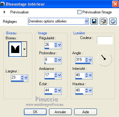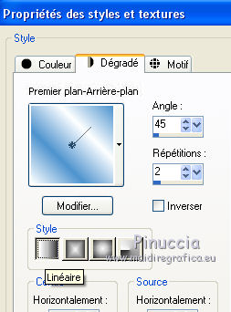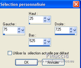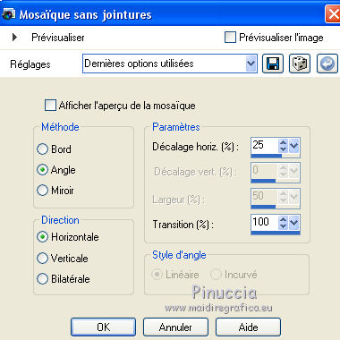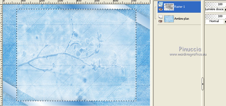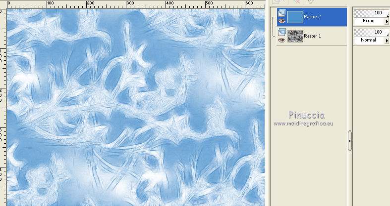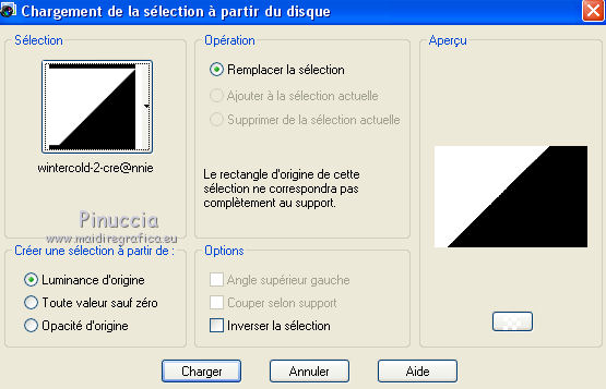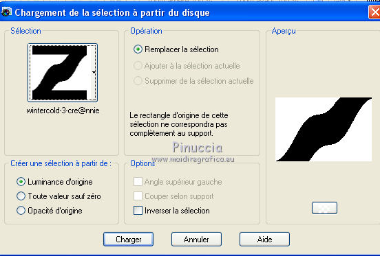 Ce tutoriel a été créé avec CorelX6 et traduit avec CorelX12, mais il peut également être exécuté avec les autres versions. Suivant la version utilisée, vous pouvez obtenir des résultats différents. Depuis la version X4, la fonction Image>Miroir a été remplacée par Image>Renverser horizontalement, et Image>Renverser avec Image>Renverser verticalemen. Dans les versions X5 et X6, les fonctions ont été améliorées par la mise à disposition du menu Objets. Avec la nouvelle version X7, nous avons encore Image>Miroir et Image>Renverser/Retourner, mais avec nouvelles différences. Voir les détails à ce sujet ici Certaines dénominations ont changées entre les versions de PSP. Les plus frequentes dénominations utilisées: ![]() Traduction en italien ici Vos versions ici Nécessaire pour réaliser ce tutoriel: Matériel ici Merci pour le tube Min@ Modules Externes: consulter, si nécessaire, ma section des filtres ici Filters Unlimited 2.0 ici Toadies - What are you, Weaver ici Redfield - Fractalius ici Alien Skin Eye Candy 5 Nature - Icicles ici Alien Skin Eye Candy 5 Impact - Perspective Shadow ici Filtres Toadies peuvent être utilisés seuls ou importés dans Filters Unlimited. voir comment le faire ici). Si un filtre est fourni avec cette icône, Animation Shop ici ![]() en fonction des couleurs utilisées, vous pouvez changer le mode mélange et l'opacité des calques. Dans les plus récentes versions de PSP, vous ne trouvez pas le dégradé d'avant plan/arrière plan ou Corel_06_029. Vous pouvez utiliser le dégradé des versions antérieures. Ici le dossier Dégradés de CorelX. Placer les presets et Alien Skin Eye Candy 5 Nature>Settings>Icicles. En cliquant sur le preset une ou deux fois (selon vos réglages) automatiquement il se placera directement dans le dossier Settings de Alien Skin Eye Candy. pourquoi un ou deux clic voir ici Placer les sélections dans le dossier Sélections. 1. Ouvrir une nouvelle image transparente 650 x 500 pixels. 2. Placer en avant plan la couleur claire #fdffff, et en arrière plan la couleur foncée #4e93ce. ![]() 3. Sélections>Sélectionner tout. 4. Ouvrir l'image "bevroren tak", Édition>Copier. Revenir sur votre travail et Édition>Coller dans la sélection. Sélections>Désélectionner tout. 5. Effets>Effets d'image>Mosaïque sans jointures, par défaut. ![]() 6. Effets>Modules Externes>Redfield - Fractalius, sélectionner le preset Sketch B W 05 et ok. ![]() si vous utilisez une version plus récente, le preset est devenu Sketch 05. ![]() 7. Calques>Nouveau calque raster. Remplir avec la couleur d'arrière plan.Placer le calque en mode Écran. ![]() 8. Calques>Fusionner>Fusionner le calque de dessous. 9. Effets>Modules Externes>Toadies - What are you. ![]() 10. Image>Ajouter des bordures, symétrique décoché, couleur d'arrière plan. ![]() 11. Effets>Effets de réflexion>Miroir rotatif. ![]() 12. Calques>Dupliquer. Image>Miroir. Image>Renverser. 13. Placer le calque en mode Fondu et réduire l'opacité à 50%. ![]() 14. Calques>Fusionner>Fusionner le calque de dessous. 15. Sélections>Charger/Enregistrer une sélection>Charger à partir du disque. Chercher et charger la sélection wintercold-1-cre@nnie. ![]() 16. Préparer en avant plan un dégradé de premier plan/arrière plan, style Linéaire. ![]() 17. Remplir la sélection du dégradé.Sélections>Transformer la sélection en calque. Sélections>Désélectionner tout. 18. Calques>Dupliquer. Image>Miroir. Image>Renverser. Calques>Fusionner>Fusionner le calque de dessous. 19. Effets>Effets 3D>Ombre portée, couleur noire. ![]() 20. Calques>Fusionner>Fusionner le calque de dessous. 21. Calques>Dupliquer. Effets>Modules Externes>Toadies - Weaver. ![]() 22. Effets>Effets géométriques>Inclinaison. ![]() Placer le calque en mode Lumière douce. ![]() 23. Sélections>Charger/Enregistrer une sélection>Charger à partir du disque. Charger à nouveau la sélection wintercold-1-cre@nnie. ![]() Presser CANC sur le clavier ![]() 24. Sélections>Modifier la sélection, et la zone sélectionnée deviendra rouge ![]() 25. Image>Miroir. Image>Renverser. ![]() 26. À nouveau Sélections>Modifier la sélection, et la zone rouge sera remplacée par la nouvelle sélection. ![]() Presser CANC sur le clavier. 27. Calques>Fusionner>Fusionner le calque de dessous. 28. Calques>Nouveau calque raster. 29. Activer l'outil Sélection ![]() (peu importe le type de sélection, parce que avec la sélection personnalisée vous obtenez toujours un rectangle), cliquer sur Sélection personnalisée ![]() et setter ces paramètres. ![]() 30. Édition>Coller dans la sélection (l'image "bevroren tak" est toujours en mémoire). Placer le calque en mode Lumière douce. ![]() 31. Effets>Effets 3D>Ombre portée, couleur noire. ![]() Sélections>Désélectionner tout. 32. Image>Ajouter des bordures, symétrique décoché, couleur d'avant plan. ![]() 33. Effets>Effets d'image>Mosaïque sans jointures. ![]() 34. Calques>Nouveau calque raster. Sélections>Charger/Enregistrer une sélection>Charger à partir du disque. Chercher et charger la sélection wintercold-2-cre@nnie. ![]() 35. Effets>Effets 3D>Ombre portée, couleur noire. ![]() Sélections>Désélectionner tout. 36. Effets>Effets de distorsion>Vagues. ![]() 37. Effets>Effets d'image>Décalage. ![]() 38. Calques>Dupliquer. Image>Miroir. Image>Renverser. Calques>Fusionner>Fusionner le calque de dessous. 39. Vous positionner sur le calque du bas de la pile. Activer l'outil Baguette magique ![]() ![]() et cliquer sur les bords en haut et en bas pour les sélectionner. ![]() 40. Remplir la sélection du dégradé.Sélections>Transformer la sélection en calque. 41. Effets>Modules Externes>Alien Skin Eye Candy 5 Nature - Icicles. Sélectionner le preset wintercold-cre@nnie et ok. Ci-dessous les règlages en cas de problèmes avec le preset. ![]() Sélections>Désélectionner tout. 42. Ouvrir le tube tekst-wintercold, Édition>Copier. Revenir sur votre travail et 