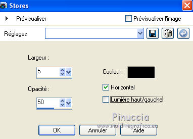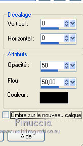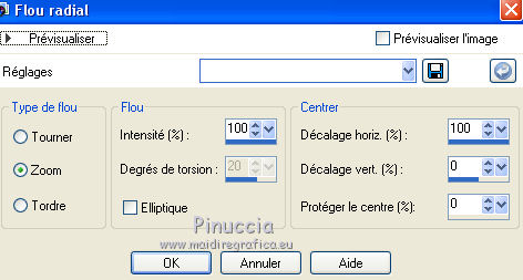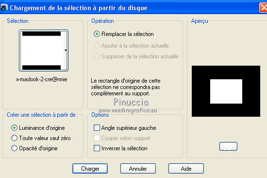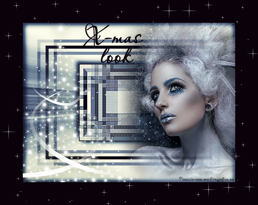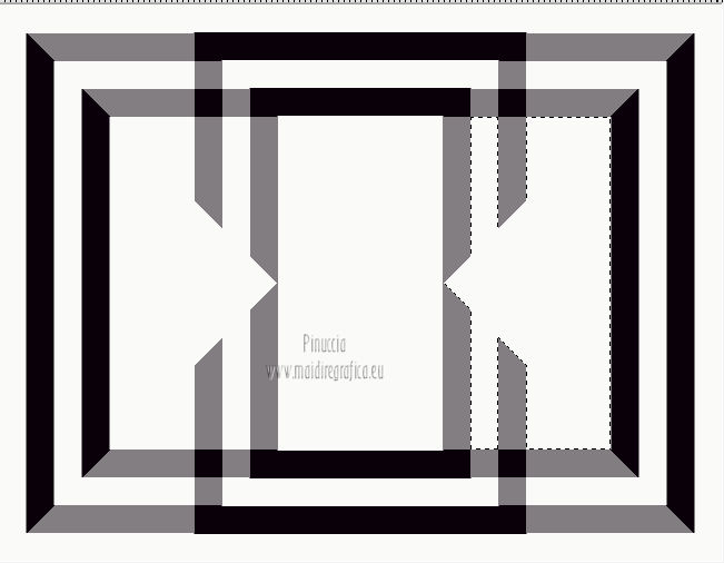 Ce tutoriel a été créé avec CorelX6 et traduit avec CorelX12, mais peut également être exécuté avec les autres versions. Suivant la version utilisée, vous pouvez obtenir des résultats différents. Depuis la version X4, la fonction Image>Miroir a été remplacée par Image>Renverser horizontalement, et Image>Renverser avec Image>Renverser verticalement. Dans les versions X5 et X6, les fonctions ont été améliorées par la mise à disposition du menu Objets. Avec la nouvelle version X7, nous avons encore Image>Miroir et Image>Renverser/Retourner, mais avec nouvelles différences. Voir les détails à ce sujet ici Certaines dénominations ont changées entre les versions de PSP. Les plus frequentes dénominations utilisées: ![]() Traduction en italien ici Vos versions ici Nécessaire pour réaliser ce tutoriel: Matériel ici Le tube utilisé pour la traduction en français est de Mentali. Le tube utilisé pour l'ancienne version du tutoriel est de Mary Modules Externes: consulter, si nécessaire, ma section des filtres ici Filters Unlimited ici Simple ici Toadies ici Two Moon ici Filtres Simple, Toadies et Two Moon peuvent être utilisés seuls ou importés dans Filters Unlimited. voir comment le faire ici). Si un filtre est fourni avec cette icône, Animation Shop ici ![]() en fonction des couleurs utilisées, vous pouvez changer le mode mélange et l'opacité des calques. Placer les sélections dans le dossier Sélections. 1. Ouvrir une nouvelle image transparente 650 x 500 pixels. 2. Placer en avant plan la couleur claire #f9f9f7, et en arrière plan la couleur foncée #0b020b. ![]() Remplir l'image transparente avec la couleur d'avant plan.3. Sélections>Sélectionner tout. Sélections>Modifier>Contracter - 25 pixels. Remplir la sélection avec la couleur d'arrière plan.4. Sélections>Modifier>Contracter - 25 pixels. Remplir la sélection avec la couleur d'avant plan.5. Sélections>Modifier>Contracter - 25 pixels. Remplir la sélection avec la couleur d'arrière plan.6. Sélections>Modifier>Contracter - 25 pixels. Remplir la sélection avec la couleur d'avant plan.Sélections>Désélectionner tout. 7. Effets>Modules Externes>Simple - Pizza Slice Mirror. 8. Calques>Dupliquer. Image>Miroir. Réduire l'opacité de ce calque à 50%. Calques>Fusionner>Fusionner le calque de dessous. 9. Activer l'outil Baguette magique ![]() ![]() cliquer dans le rectangle à droite pour le sélectionner. ![]() 10. Effets>Effets de textures>Stores, couleur d'arrière plan. ![]() Sélections>Transformer la sélection en calque. 11. Effets>Effets de textures>Stores, horizontal décoché. ![]() Sélections>Désélectionner tout. 12. Image>Miroir. Calques>Fusionner>Fusionner le calque de dessous. 13. Calques>Dupliquer. Image>Rotation libre - 90 degrés à droite. ![]() 14. Effets>Modules Externes>Two Moon - Emboston. ![]() Réduire l'opacité de ce calque à 50%. Calques>Fusionner>Fusionner le calque de dessous. 15. Calques>Dupliquer. Effets>Modules Externes>Simple - Blintz. Réduire l'opacité de ce calque à 50%. Calques>Fusionner>Fusionner le calque de dessous. 16. Sélections>Charger/Enregistrer une sélection>Charger à partir du disque. Chercher et charger la sélection x-maslook-1-cre@nnie. ![]() Édition>Copier (attention: vous devrez tenir en mémoire l'image jusqu'à l'étape 22). Sélections>Désélectionner tout. 17. Image>Redimensionner, à 50%, redimensionner tous les calques décoché. Réglage>Netteté>Davantage de netteté. 18. Image>Ajouter des bordures, 2 pixels, symétrique, couleur d'arrière plan. Image>Ajouter des bordures, symétrique décoché, couleur d'avant plan. ![]() 19. Image>Ajouter des bordures, 10 pixels, symétrique, couleur d'arrière plan. Image>Ajouter des bordures, 75 pixels, symétrique, couleur d'avant plan. 20. Sélectionner le bord de 10 pixels avec la baguette magique ![]() Sélections>Transformer la sélection en calque. Sélections>Désélectionner tout. 21. Effets>Modules Externes>Toadies - What are you, par défaut. ![]() 22. Édition>Coller comme nouveau calque. 23. Effets>Effets d'image>Décalage. ![]() 24. Réglage>Flou>Flou radial. ![]() 25. Effets>Modules Externes>Two Moon - Emboston, 2 times, comme précédemment. 26. Calques>Dupliquer. Image>Miroir. Calques>Fusionner>Fusionner le calque de dessous. 27. Sélections>Charger/Enregistrer une sélection>Charger à partir du disque. Chercher et charger la sélection x-maslook-2-cre@nnie. ![]() Presser CANC sur le clavier ![]() 28. Sélections>Inverser. Calques>Nouveau calque raster. Effets>Effets 3D>Découpe. ![]() 29. Calques>Nouveau calque raster. Répéter l'Effet Découpe, mais vertical et horizontal -10. ![]() Sélections>Désélectionner tout. 30. Image>Ajouter des bordures, 75 pixels, symétrique, couleur d'arrière plan. 31. Activer le tube fin-annee14-verocreation - Édition>Copier. Revenir sur votre travail et Édition>Coller comme nouveau calque. Image>Redimensionner, à 60%, redimensionner tous les calques décoché. 32. Effets>Effets 3D>Ombre portée, couleur noire. ![]() 33. Déplacer le tube à gauche.34. Activer le tube Mary 0912-23 - Édition>Copier. Revenir sur votre travail et Édition>Coller comme nouveau calque. Image>Redimensionner, à 75%, redimensionner tous les calques décoché. 35. Effets>Effets 3D>Ombre portée, comme précédemment. Déplacer le tube à droite.36. Signer votre travail sur un nouveau calque (attention: ne pas écrire sur le bord). 37. Activer le testo x-maslook - Édition>Copier. Revenir sur votre travail et Édition>Coller comme nouveau calque. Positionner le texte en haut, voir mon exemple.38. Vous positionner sur le calque du bas de la pile. Sélectionner le bord avec la baguette magique ![]() ![]() Sélections>Transformer la sélection en calque. Calques>Agencer>Placer en haut de la pile. 39. Effets>Modules Externes>VM Natural - Sparkle. ![]() Sélections>Désélectionner tout. 40. Édition>Copie Spéciale>Copier avec fusion. Ouvrir Animation Shop et É