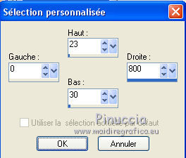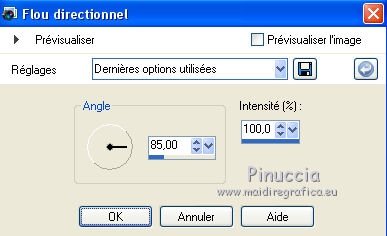 Ce tutoriel a été créé avec CorelX6 et traduit avec CorelX12, mais il peut également être exécuté avec les autres versions. Suivant la version utilisée, vous pouvez obtenir des résultats différents. Depuis la version X4, la fonction Image>Miroir a été remplacée par Image>Renverser horizontalement, et Image>Renverser avec Image>Renverser verticalement. Dans les versions X5 et X6, les fonctions ont été améliorées par la mise à disposition du menu Objets. Avec la nouvelle version X7, nous avons encore Image>Miroir et Image>Renverser/Retourner, mais avec nouvelles différences. Voir les détails à ce sujet ici Certaines dénominations ont changées entre les versions de PSP. Les plus frequentes dénominations utilisées: ![]() Traduction en italien ici Vos versions ici Nécessaire pour réaliser ce tutoriel: Matériel ici Merci pour le tube Annelies et pour le masque Occhiblu Modules Externes: consulter, si nécessaire, ma section des filtres ici Filters Unlimited 2.0 qui Mehdi - Weaver qui Alien Skin Eye Candy 5 Impact - Motion Trail, Glass qui RCS Filter pack 1.0 qui Toadies - What are you qui Mura's Meister - Perspective Tiling qui Filtres RCS et Toadies peuvent être utilisés seuls ou importés dans Filters Unlimited. voir comment le faire ici) mais ils peuvent obtenir des résultats différents. ![]() en fonction des couleurs utilisées, vous pouvez changer le mode mélange et l'opacité des calques. Placer les presets En cliquant sur le preset une ou deux fois (selon vos réglages) automatiquement il se placera directement dans le dossier Settings de Alien Skin Eye Candy. pourquoi un ou deux clic voir ici Placer les sélections dans le dossier Sélections. Ouvrir le masque dans PSP et le minimiser avec le reste du matériel. 1. Ouvrir une nouvelle image transparente 650 x 500 pixels. 2. Placer en avant plan la couleur claire #fcfbf7, et en arrière plan la couleur foncée #701714. ![]() 3. Remplir l'image transparente avec la couleur d'avant plan.4. Calques>Nouveau calque raster. Sélections>Sélectionner tout. 5. Activer le tube Alies 1-2VR267-woman-10052015, Édition>Copier. ne pas fermer le tube: on va s'en servir plus tard Revenir sur votre travail et Édition>Coller dans la sélection. Sélections>Désélectionner tout. 6. Effets>Effets d'image>Mosaïque sans jointures. ![]() 7. Calques>Fusionner>Fusionner le calque de dessous. 8. Réglage>Flou>Flou radial. ![]() 9. Calques>Dupliquer. Image>Miroir. Placer le calque en mode Multiplier. 10. Calques>Fusionner>Fusionner le calque de dessous. 11. Calques>Dupliquer. Effets>Modules Externes>RCS Filter Pack 1.0 - RCS Digi-Lens - Atomic Split. ![]() Placer le calque en mode Lumière dure. 12. Image>Ajouter des bordures, symétrique décoché, couleur d'avant plan. ![]() 13. Effets>Modules Externes>RCS Filter Pack 1.0 - RCS Digi-Lens - Atomic Split, comme précédemment. 14. Effets>Effets d'image>Mosaïque sans jointures. ![]() 15. Calques>Nouveau calque raster. Sélections>Charger/Enregistrer une sélection>Charger à partir du disque. Chercher et charger la sélection yenthe-1-cre@nnie. ![]() Remplir la sélection avec la couleur d'avant plan.Sélections>Désélectionner tout. 16. Effets>Modules Externes>Alien Skin Eye Candy 5 Impact - Motion Trail. Sélectionner le preset yenthe-cre@nnie et ok. En cas de problèmes avec le preset, vous pouvez copier les règlages dans capture. ![]() 17. Effets>Effets de textures>Stores, couleur d'arrière plan. ![]() 18. Calques>Dupliquer. Image>Redimensionner, à 60%, redimensionner tous les calques décoché. 19. Sélections>Charger/Enregistrer une sélection>Charger à partir du disque. Charger à nouveau la sélection yenthe-1-cre@nnie. ![]() Presser CANC sur le clavier ![]() Sélections>Désélectionner tout. 20. Calques>Fusionner>Fusionner le calque de dessous. Placer le calque en mode Luminance (héritée). 21. Vous positionner sur le calque du bas de la pile. Activer l'outil Sélection ![]() (peu importe le type de sélection, parce que avec la sélection personnalisée vous obtenez toujours un rectangle), cliquer sur Sélection personnalisée ![]() et setter ces paramètres. ![]() Sélections>Transformer la sélection en calque. Sélections>Désélectionner tout. 22. Effets>Effets Géométriques>Cercle. ![]() 23. Effets>Modules Externes>Mehdi - Weaver. ![]() Placer le calque en mode Éclaircir. 24. Effets>Effets d'image>Mosaïque sans jointures. ![]() 25. Calques>Fusionner>Calques visibles. 26. Édition>Copier. 27. Image>Ajouter des bordures, 50 pixels, symétrique, couleur d'arrière plan. 28. Effets>Effets d'image>Mosaïque sans jointures, comme précédemment. 29. Activer l'outil Baguette magique ![]() ![]() et cliquer sur le bord supérieur pour le sélectionner. 30. Édition>Coller dans la sélection. 31. Effets>Effets 3D>Ombre portée, couleur noire. ![]() Sélections>Transformer la sélection en calque. Sélections>Désélectionner tout. 32. Image>Renverser. Calques>Nouveau calque raster. Remplir avec la couleur d'avant plan.33. Calques>Nouveau calque de masque>A partir d'une image. Ouvrir le menu deroulant sous la fenêtre d'origine et vous verrez la liste des images ouverts. Sélectionner le masque OBG_Mask_18. ![]() Calques>Fusionner>Fusionner le groupe. Placer le calque en mode Luminance (héritée) et réduire l'opacité à 65%. ![]() 34. Calques>Fusionner>Calques visibles. 35. Édition>Copier. 36. Sélections>Charger/Enregistrer une sélection>Charger à partir du disque. Chercher et charger la sélection yenthe-2-cre@nnie. ![]() 37. Édition>Coller dans la sélection. 38. Effets>Modules Externes>Alien Skin Eye Candy 5 Impact - Glass. Seleziona il preset yenthe-cre@nnie-glass e ok. ![]() Voici les règlages en cas de problèmes avec le preset. ![]() Sélections>Désélectionner tout. 39. Image>Miroir. Effets>Effets 3D>Ombre portée, comme précédemment. 40. Sélections>Sélectionner tout. Image>Ajouter des bordures, symétrique décoché, couleur d'avant plan. 