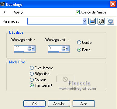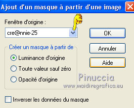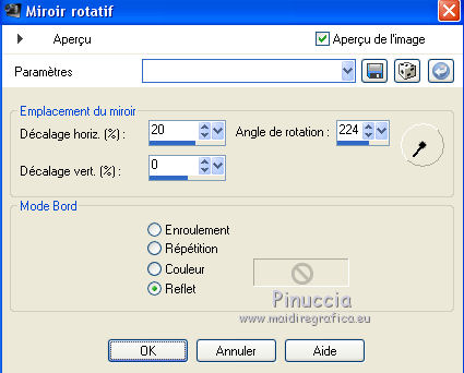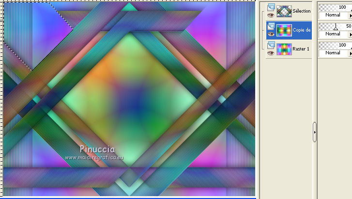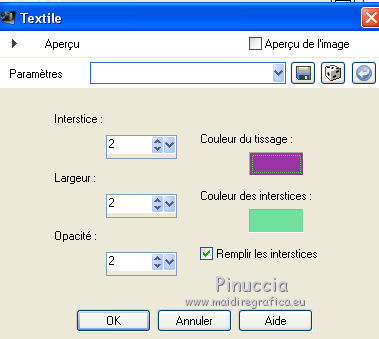 J'ai traduit ce tutoriel avec CorelX12, mais il peut également être exécuté avec les autres versions. Suivant la version utilisée, vous pouvez obtenir des résultats différents. Depuis la version X4, la fonction Image>Miroir a été remplacée par Image>Renverser horizontalement, et Image>Renverser avec Image>Renverser verticalement . Dans les versions X5 et X6, les fonctions ont été améliorées par la mise à disposition du menu Objets. Avec la nouvelle version X7, nous avons à nouveau Miroir/Retourner, mais avec nouvelles différences. Consulter, si vouz voulez, mes notes ici Certaines dénominations ont changées entre les versions de PSP. Les plus frequentes dénominations utilisées: ![]() Traduction en italien ici Vos versions ici Nécessaire pour réaliser ce tutoriel: Matériel qui Merci: pour le tube Gabry Garder le nom du tube. Le © appartient à l'artiste original. Garder le crédit de ceux qui ont créé le tube. Modules Externes: consulter, si nécessaire, ma section des filtres ici Filters Unlimited 2.0 qui VM Instant Art qui Simple qui Simple (bonus) qui Mura's Meister - Perspective Tiling qui Filtres VM Instant Art et Simple peuvent être utilisés seuls ou importés dans Filters Unlimited. voir comment le faire ici). Si un filtre est fourni avec cette icône, ![]() Si vous voulez utiliser vos propres couleurs, n'hésitez pas à changer le mode et l'opacité des calques Placer les sélections dans le dossier Sélections. Ouvrir le masque dans PSP et le minimiser avec le reste du matériel. 1. Ouvrir une nouvelle image transparente 650 x 500 pixels. 2. Placer en avant plan la couleur claire #71e09c, et en arrière plan la couleur foncée #9a34a4. ![]() 3. Effets>Modules Externes>VM Instant Art - Colorfield generator. ![]() 4. Calques>Dupliquer. Image>Miroir. Réduire l'opacité de ce calque à 50%. Calques>Fusionner>Fusionner le calque de dessous. 5. Calques>Dupliquer. Image>Rotation libre - 90 degrés à gauche. ![]() Réduire l'opacité de ce calque à 50%. 6. Sélections>Sélectionner tout. Sélections>Flottante. Sélectins>Statique. 7. Sélections>Adapter au support. ![]() 8. Effets>Effets d'image>Mosaïque sans jointures. ![]() 9. Effets>Effets 3D>Ombre portée, couleur noire. ![]() 10. Sélections>Inverser. Effets>Effets de textures>Stores, couleur noire. ![]() 11. Sélections>Transformer la sélection en calque. Sélections>Désélectionner tout. 12. Calques>Dupliquer. Image>Redimensionner, à 70%, redimensionner tous les calques décoché. 13. Effets>Effets 3D>Ombre portée, comme précédemment. 14. Image>Miroir. Calques>Fusionner>Fusionner le calque de dessous. 15. Effets>Effets géométriques>Inclinaison. ![]() 16. Sélections>Charger/Enregistrer une sélection>Charger à partir du disque. Chercher et charger la sélection youtalking-1-cre@nnie. ![]() Presser CANC sur le clavier ![]() Sélections>Désélectionner tout. 17. Calques>Dupliquer. Image>Miroir. Calques>Fusionner>Fusionner le calque de dessous. 18. Sélections>Charger/Enregistrer une sélection>Charger à partir du disque. Chercher et charger la sélection youtalking-2-cre@nnie. ![]() 19. Vous positionner sur le calque au centre (copie de Raster 1). ![]() 20. Effets>Effets de textures>Stores, comme précédemment, mais aussi Horizontal sélectionné. ![]() 21. Sélections>Modifier la sélection, et la zone sélectionnée deviendra rouge. ![]() 22. Image>Miroir, et la zone rouge sera reflétée. ![]() 23. Sélections>Modifier la sélection, et la zone rouge va disparaître et vous aurez la sélection réfléchie. ![]() 24. Effets>Effets de textures>Textile. couleur du tissage: couleur d'arrière plan couleur des interstices: couleur d'avant plan. ![]() Sélections>Désélectionner tout. 25. Vous positionner sur le calque du bas de la pile. Édition>Copier. 26. Sélections>Sélectionner tout. Image>Ajouter des bordures, symétrique décoché, couleur d'avant plan. ![]() 27. Sélections>Inverser. Édition>Coller dans la sélection. Sélections>Désélectionner tout. 28. Effets>Effets d'image>Mosaïque sans jointures. ![]() 29. Sélections>Charger/Enregistrer une sélection>Charger à partir du disque. Chercher et charger la sélection youtalking-3-cre@nnie. ![]() Sélections>Transformer la sélection en calque. 30. Effets>Effets de textures>Textile, comme précédemment. Sélections>Désélectionner tout. 31. Calques>Dupliquer. Image>Miroir. Calques>Fusionner>Fusionner le calque de dessous. Placer le calque en mode Lumière dure. 32. Calques>Dupliquer. Effets>Modules Externes>Simple - Left Right Wrap. 33. Image>Renverser. Calques>Fusionner>Calques visibles. 34. Activer l'outil Sélection ![]() (peu importe le type de sélection, parce que avec la sélection personnalisée vous obtenez toujours un rectangle), cliquer sur Sélection personnalisée ![]() et setter ces paramètres. ![]() Sélections>Transformer la sélection en calque. Sélections>Désélectionner tout. 35. Effets>Modules Externes>Simple - Top Bottom Wrap. 36. Effets>Effets de distorsion>Coordonnées polaires. ![]() 37. Effets>Effets de réflexion>Miroir rotatif. ![]() 38. Effets>Effets d'image>Décalage. ![]() 39. Calques>Dupliquer. Image>Miroir. Calques>Fusionner>Fusionner le calque de dessous. 40. Calques>Dupliquer. Image>Renverser. Calques>Fusionner>Fusionner le calque de dessous. 41. Effets>Effets 3D>Ombre portée, comme précédemment. 42. Vous positionner sur le calque du bas de la pile. Calques>Dupliquer. 43. Calques>Nouveau calque de masque>A partir d'une image. Ouvrir le menu deroulant sous la fenêtre d'origine et vous verrez la liste des images ouverts. Charger le masque cre@nnie-25. ![]() Calques>Fusionner>Fusionner le groupe. 44. Effets>Effets 3D>Ombre portée, comme précédemment. 45. Sélections>Sélectionner tout. Image>Ajouter des bordures, symétrique decoché, couleur d'avant plan. ![]() 46. Effets>Effets 3D>Bouton, couleur d'arrière plan. ![]() 47. Sélections>Inverser. Effets>Modules Externes>Simple - Quick 