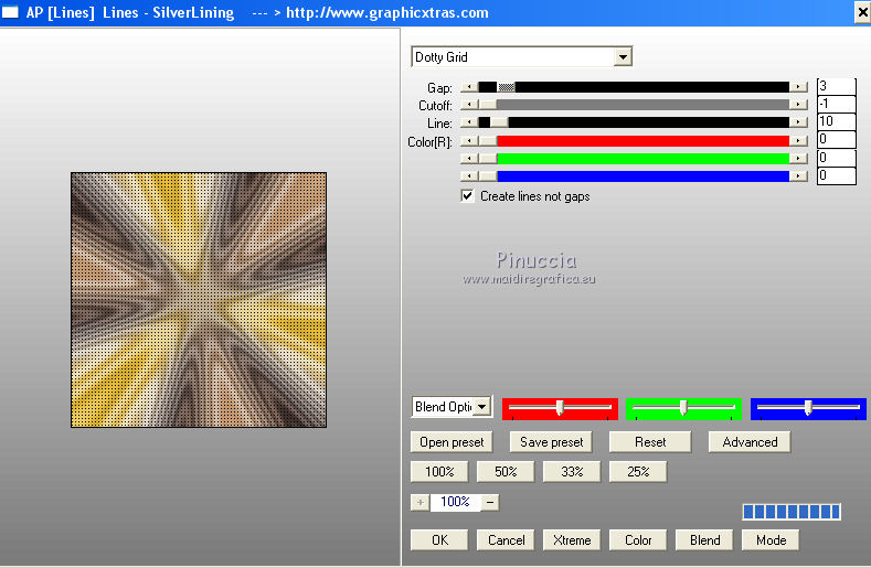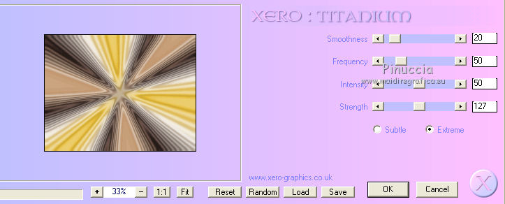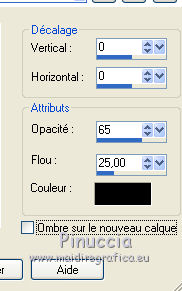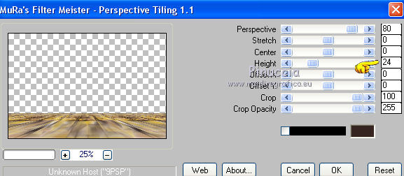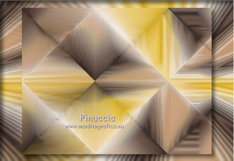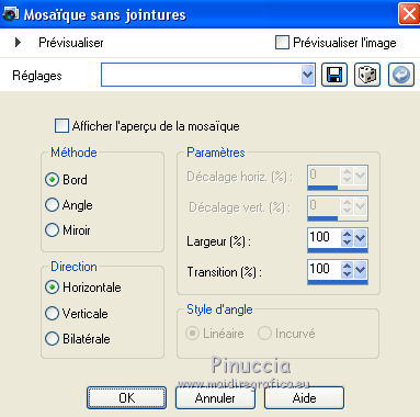 Ce tutoriel a été créé avec CorelX6 et traduit avec CorelX12, mais il peut également être exécuté avec les autres versions. Suivant la version utilisée, vous pouvez obtenir des résultats différents. Depuis la version X4, la fonction Image>Miroir a été remplacée par Image>Renverser horizontalement, et Image>Renverser avec Image>Renverser verticalement. Dans les versions X5 et X6, les fonctions ont été améliorées par la mise à disposition du menu Objets. Avec la nouvelle version X7, nous avons encore Image>Miroir et Image>Renverser/Retourner, mais avec nouvelles différences. Voir les détails à ce sujet ici Certaines dénominations ont changées entre les versions de PSP. Les plus frequentes dénominations utilisées: ![]() Traduction en italien ici Vos versions ici Nécessaire pour réaliser ce tutoriel: Matériel ici Merci pour le tube Tocha Modules Externes: consulter, si nécessaire, ma section des filtres ici Mehdi - Sorting Tiles qui Alien Skin Eye Candy 5 Impact - Perspective Tiling, Glass qui Xero - Titanium qui Ap Lines - Lines SilverLining qui Mura's Meister - Perspective Tiling qui ![]() en fonction des couleurs utilisées, vous pouvez changer le mode mélange et l'opacité des calques. Placer les presets En cliquant sur le preset une ou deux fois (selon vos réglages) automatiquement il se placera directement dans le dossier Settings de Alien Skin Eye Candy. pourquoi un ou deux clic voir ici Placer le dégradé dans le dossier Dégradés. 1. Ouvrir une nouvelle image transparente 650 x 500 pixels. 2. Placer en avant plan la couleur claire #e7dfd4, et en arrière plan la couleur foncée #352420. ![]() 3. Placer en avant plan Dégradé et sélectionner le dégradé Zara, style Radial. ![]() si vous voulez modifier le dégradé, clic sur Modifier, ensuit clic sur l'"encrier" et sur la palette de la couleur perso eet choisir votre couleur. ![]() Fermer la fenêtre et réponder oui à la question si vous voulez enregistrer les modifications Remplir l'image transparente du dégradé.4. Réglage>Flou>Flou gaussien - rayon 10. ![]() 5. Effets>Modules Externes>Xero - Titanium ![]() 6. Effets>Effets d'image>Mosaïque sans jointures. ![]() 7. Édition>Copier. 8. Effets>Modules Externes>Mehdi - Sorting Tiles. ![]() 9. Sélections>Sélectionner tout. Image>Ajouter des bordures, symétrique décoché, couleur d'avant plan. ![]() Sélections>Inverser. 10. Édition>Coller dans la sélection. Sélections>Transformer la sélection en calque. Sélections>Désélectionner tout. 11. Effets>Effets 3D>Découpe. ![]() Résultat ![]() 12. Calques>Fusionner>Fusionner le calque de dessous. 13. Effets>Effets d'image>Mosaïque sans jointures. ![]() 14. Activer l'outil Sélection ![]() (peu importe le type de sélection, parce que avec la sélection personnalisée vous obtenez toujours un rectangle), cliquer sur Sélection personnalisée ![]() et setter ces paramètres. ![]() Sélections>Transformer la sélection en calque. 15. Effets>Effets 3D>Ombre portée, couleur noire. ![]() Sélections>Désélectionner tout. 16. Effets>Effets d'image>Décalage. ![]() Image>Renverser. 17. Calques>Dupliquer. Image>Redimensionner, all'80%, redimensionner tous les calques décoché. Image>Renverser. 18. Effets>Effets d'image>Décalage, comme précédemment. ![]() Calques>Fusionner>Fusionner le calque de dessous. 19. Calques>Dupliquer. Image>Miroir. Image>Renverser. Calques>Fusionner>Fusionner le calque de dessous. 20. Calques>Dupliquer. Image>Rotation libre - 90 degrés à gauche. ![]() 21. Effets>Effets de textures>Stores, couleur d'arrière plan. ![]() 22. Réduire l'opacité de ce calque à 50%. ![]() 23. Calques>Nouveau calque raster. Sélection personnalisée ![]() ![]() Remplir la sélection du dégradé.24. Réglage>Flou>Flou gaussien - rayon 10. ![]() 25. Effets>Modules Externes>Xero - Titanium, comme précédemment. Garder sélectionné. 26. Calques>Nouveau calque raster. Remplir la sélection avec la couleur d'arrière plan.27. Sélections>Modifier>Contracter - 10 pixels. Presser CANC sur le clavier ![]() 28. Garder toujours sélectionné. Calques>Fusionner>Fusionner le calque de dessous. 29. Effets>Modules Externes>AP lines - Lines SilverLining. Si vous voulez utiliser AP 01 Innovation - Lines SilverLining, le résultat ne change pas ![]() 30. Effets>Modules Externes>Alien Skin Eye Candy 5 Impact - Glass. Sélectionner le preset zara-cre@nnie et ok. ![]() Ci-dessous les paramètres, en cas de problèmes avec le preset. ![]() Sélections>Désélectionner tout. 41. Calques>Dupliquer. Effets>Effets géométriques>Perspective horizontale. ![]() 42. Effets>Effets d'image>Décalage. ![]() 43. Calques>Dupliquer. Image>Miroir. Calques>Fusionner>Fusionner le calque de dessous - 2 fois. 44. Effets>Effets d'image>Décalage. ![]() 45. Effets>Effets 3D>Ombre portée, comme précédemment. 46. Placer le calque en mode Recouvrement et réduire l'opacité à 75%. ![]() 47. Sélections>Sélectionner tout. Image>Ajouter des bordures, symétrique décoché, couleur d'arrière plan. ![]() 48. Effets>Effets d'image>Mosaïque sans jointures, comme précédemment. Sélections>Inverser. Réglage>Flou>Flou gaussien, comme précédemment. 49. Effets>Modules Externes>AP Lines - Lines SilverLining, comme précédemment. 50. Sélections>Inverser. Effets>Effets 3D>Ombre portée, comme précédemment. 51. Sélections>Transformer la sélection en calque. Sélections>Désélectionner tout. 52. Effets>Modules Externes>Mura's Meister - Perspective Tiling. ![]() Résultat ![]() 53. Effets>Effets 3D>Ombre portée, comme précédemment. 54. Ouvrir le tube wa-fashion-cre@nnie, - Édition>Copier. Revenir sur votre travail et ´dition>Coller comme nouveau calque. Image>Redimensionner, à 60%, redimensionner tous les calques décoché. 54. Déplacer le tube un peu plus en haut, sur le cadre.Placer le calque en mode Recouvrement. ![]() 55. Calques>Dupliquer. Réglage>Flou>Flou gaussien - rayon 5. ![]() 56. Effets>Effets géométriqu