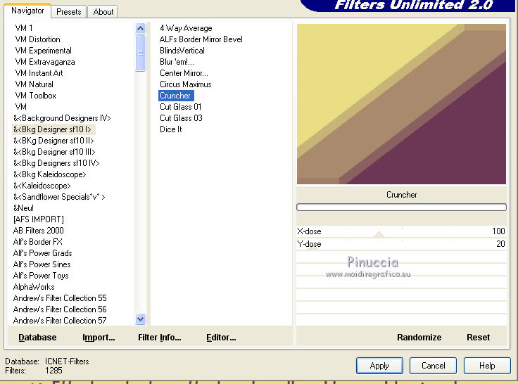 Effets>Modules Externes>Filters Unlimited 2.0 - &<Bkg Designer sf10I> - Cruncher, par défaut.