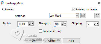 Adjust>Sharpness>Unsharp Mask, same settings.