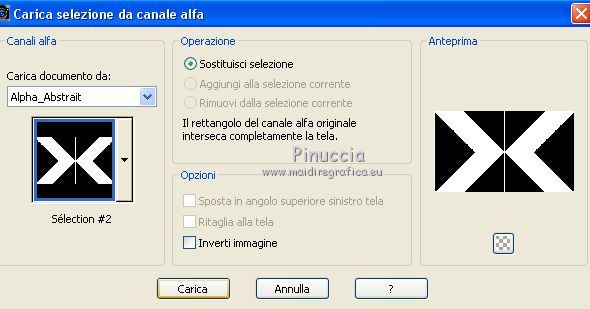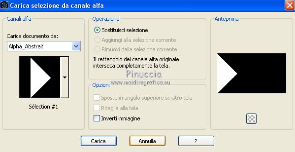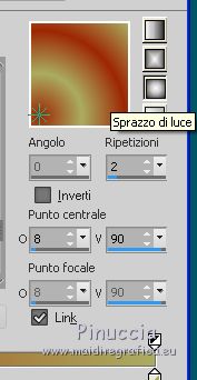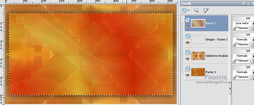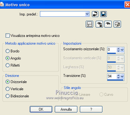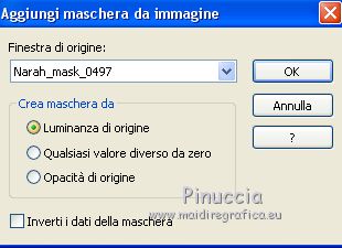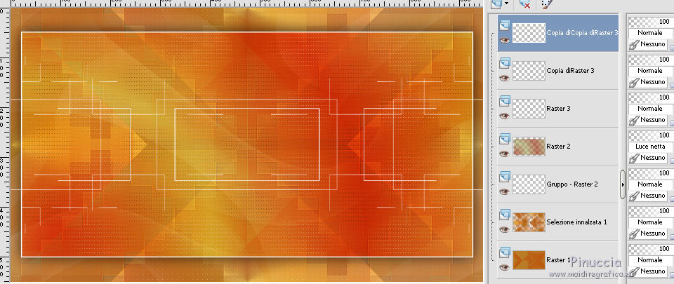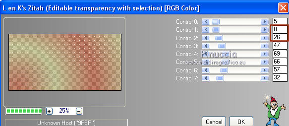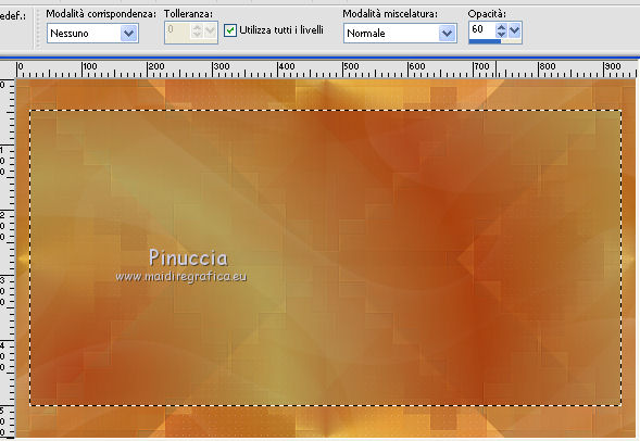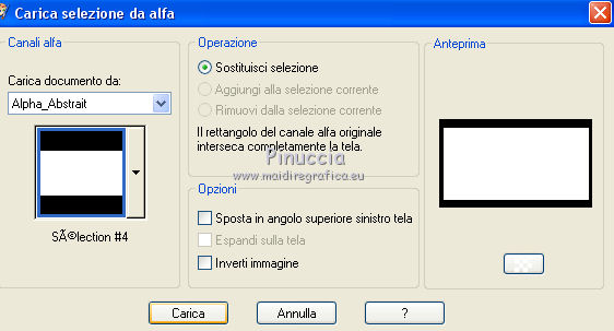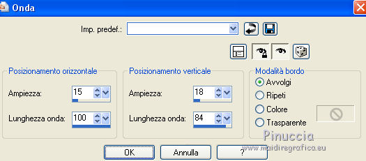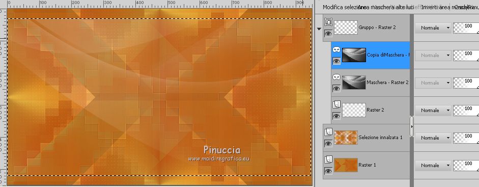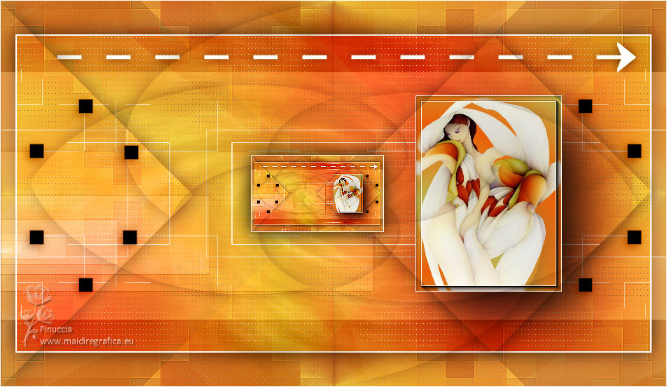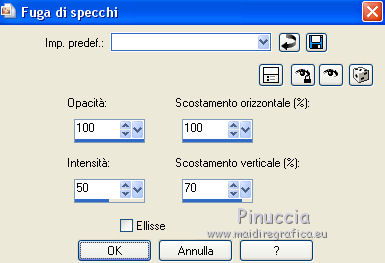 qui puoi trovare qualche risposta ai tuoi dubbi. Se l'argomento che ti interessa non è presente, ti prego di segnalarmelo. Questo tutorial è stato creato con PSP2019 e tradotto con PSPX7, ma può essere realizzato anche con le altre versioni di PSP. Dalla versione X4, il comando Immagine>Rifletti è stato sostituito con Immagine>Capovolgi in orizzontale, e il comando Immagine>Capovolgi con Immagine>Capovolgi in verticale. Nelle versioni X5 e X6, le funzioni sono state migliorate rendendo disponibile il menu Oggetti. Con la nuova versione X7, sono tornati Rifletti>Capovolgi, ma con nuove varianti. Vedi la scheda sull'argomento qui Le vostre versioniOccorrente: Materiale qui Grazie per il tube Nicole Bambou e per la maschera Narah. Il resto del materiale è di Crealine. (in questa pagina trovi i links ai siti dei creatori del materiale usato nei tutorial) Filtri: se hai problemi con i filtri, consulta la mia sezione filtri qui Filters Unlimited 2.0 qui &<Bkg Designer sf10IV> - @BlueBerry Pie (da importare in Unlimited) qui AAA Frames - Foto Frame qui AP 01 [Innovations] - Lines SilverLining qui L&K's - L&K's Jeffrey qui L&K's - L&K's Zitah qui Graphics Plus - Emboss qui Nik Software - Color Efex Pro qui Alien Skin Eye Candy 5 Impact - Perspective Shadow qui I filtri Graphics Plus si possono usare da soli o importati in Filters Unlimited (come fare vedi qui) Se un filtro fornito appare con questa icona ![]() non esitare a cambiare modalità di miscelatura e opacità secondo i colori utilizzati. Nelle ultime versioni di PSP non c'è il gradiente di primo piano/sfondo (Corel_06_029) Puoi usare i gradienti delle versioni precedenti. Trovi qui i gradienti Corel X. ![]() Metti la linea di stile Line 240_créaline nella cartelle Linee di stile. Apri la maschera in PSP e minimizzala con il resto del materiale. Imposta il colore di primo piano con #9d2703, e il colore di sfondo con #aaac61. ![]() Passa il colore di primo piano a Gradiente di primo piano/sfondo, stile Sprazzo di luce. ![]() 1. Apri Alpha_Abstrait. Finestra>Duplica o sulla tastiera maiuscola+D per fare una copia. ![]() Chiudi l'originale. La copia, che sarà la base del tuo lavoro, non è vuota, ma contiene le selezioni salvate sul canale alfa. Riempi l'immagine trasparente con il gradiente.2. Effetti>Plugins>Filters Unlimited 2.0 - Color Filter - Color Booster. ![]() 3. Livelli>Duplica. Immagine>Rifletti. Immagine>Capovolgi. Abbassa l'opacità di questo livello al 50%. Livelli>Unisci>Unisci giù. 4. Effetti>Plugins>Filters Unlimited 2.0 - &<Bkg Designer sf10IV> - @BlueBerry Pie. ![]() Ripeti l'Effetto una seconda volta. 5. Regola>Messa a fuoco>Accentua messa a fuoco. 6. Selezione>Carica/Salva selezione>Carica selezione da canale alfa. La selezione #1 è subito disponibile. Devi soltanto cliccare Carica. ![]() Selezione>Innalza selezione a livello. 7. Effetti>Plugins>AP 01 [Innovations] - Lines SilverLining. ![]() Selezione>Deseleziona. 8. Effetti>Effetti di immagine>Motivo unico. ![]() 9. Cambia la modalità di miscelatura di questo livello in Luminanza, o secondo i tuoi colori. 10. Livelli>Duplica. Immagine>Rifletti. Livelli>Unisci>Unisci giù. Cambia la modalità di miscelatura di questo livello in Filtra. 11. Attiva il livello di sfondo, Raster 1. Selezione>Carica/Salva selezione>Carica selezione da canale alfa. Apri il menu delle selezioni e carica la selezione #2. ![]() Selezione>Innalza selezione a livello. Selezione>Deseleziona. 12. Effetti>Plugins>L&K's - L&K's Jeffrey ![]() 13. Effetti>Effetti di immagine>Motivo unico. ![]() Regola>Messa a fuoco>Accentua messa a fuoco. 14. Effetti>Effetti 3D>Sfalsa ombra, colore di primo piano. ![]() 15. Attiva il livello superiore. Livelli>Unisci>Unisci giù. 16. Effetti>Effetti 3D>Sfalsa ombra, con i settaggi standard. ![]() Regola>Messa a fuoco>Metti a fuoco. 17. Livelli>Nuovo livello raster. Selezione>Carica/Salva selezione>Carica selezione da canale alfa. Apri il menu delle selezioni e carica la selezione #3. ![]() 18. Imposta il colore di primo piano con il colore bianco #ffffff. Abbassa l'opacità dello strumento Riempimento al 30%. Riempi la selezione con il colore bianco.![]() 19. Livelli>Nuovo livello maschera>Da immagine. Apri il menu sotto la finestra di origine e vedrai la lista dei files aperti. Seleziona la maschera Narah_mask_0497 ![]() Livelli>Duplica ![]() Livelli>Unisci>Unisci gruppo. Selezione>Deseleziona. 20. Livelli>Duplica. Immagine>Capovolgi. Abbassa l'opacità di questo livello al 59%. ![]() Livelli>Unisci>Unisci giù. 21. Effetti>Effetti di immagine>Motivo unico, con i settaggi standard. ![]() 22. Effetti>Effetti di distorsione>Onda. ![]() 23. Livelli>Nuovo livello raster. Selezione>Carica/Salva selezione>Carica selezione da canale alfa. Apri il menu delle selezioni e carica la selezione #4. ![]() 24. Imposta nuovamente il colore di primo piano al colore e al gradiente iniziali (tasto destro del mouse sulla paletta del colore e seleziona il colore iniziale #9d2703, e poi apri il menu della paletta e seleziona il gradiente) ![]() Imposta l'opacità dello strumento Riempimento al 60%. ![]() Riempi la selezione con il gradiente.![]() 25. Effetti>Plugins>L&K's - L&K's Zitah. ![]() 26. Effetti>Effetti 3D>Sfalsa ombra, colore nero. ![]() 27. Cambia la modalità di miscelatura di questo livello in Luce netta, o secondo i tuoi colori. Mantieni selezionato. ![]() 28. Livelli>Nuovo livello raster. Imposta di nuovo il colore di primo piano con il colore bianco. Riporta l'opacità dello strumento Riempimento a 100. Riempi il livello con il colore bianco.29. Selezione>Modifica>Contrai - 2 pixels. Premi sulla tastiera il tasto CANC ![]() Selezione>Deseleziona. 30. Livelli>Duplica. Immagine>Ridimensiona, al 40%, tutti i livelli non selezionato. 31. Effetti>Effetti di immagine>Motivo unico. ![]() 32. Livelli>Duplica. Immagine>Ridimensiona, all'80%, tutti i livelli non selezionato. 33. Effetti>Effetti di riflesso>Fuga di specchi. ![]() 34. Livelli>Duplica. Immagine>Rifletti. Live