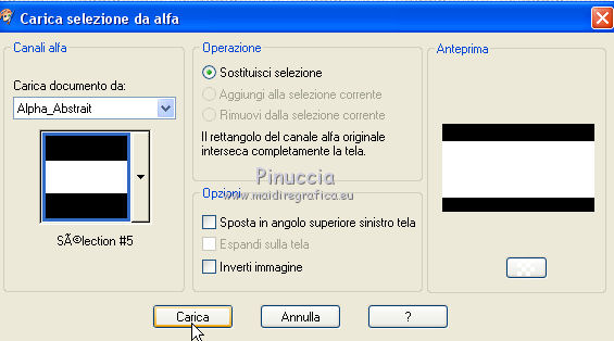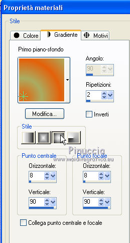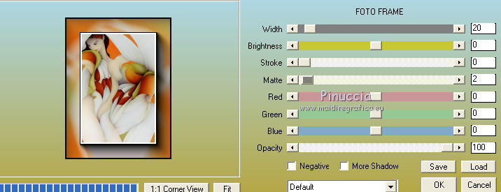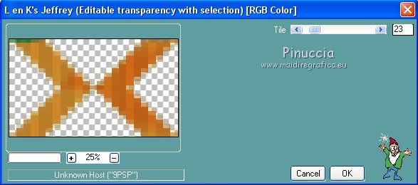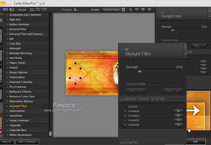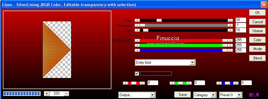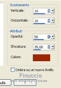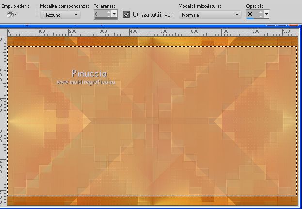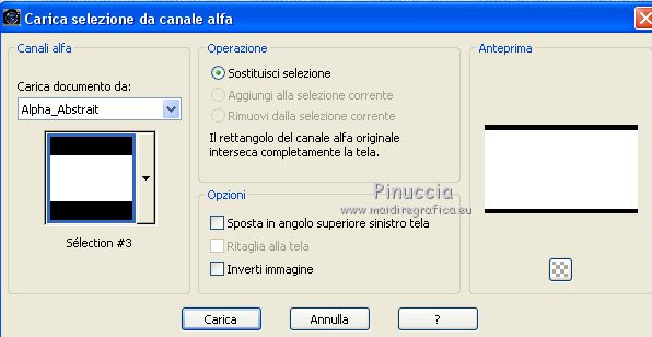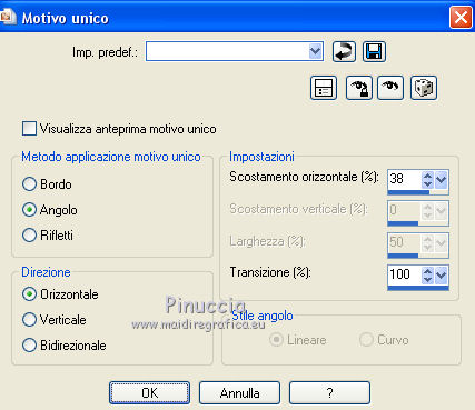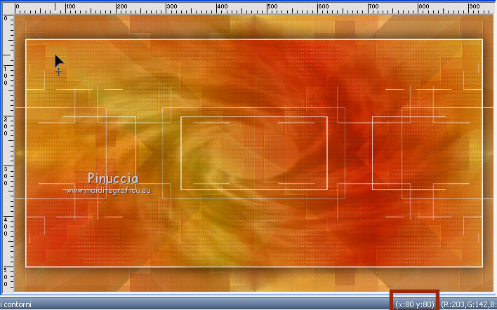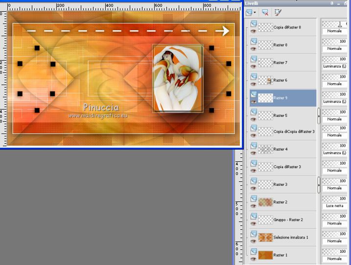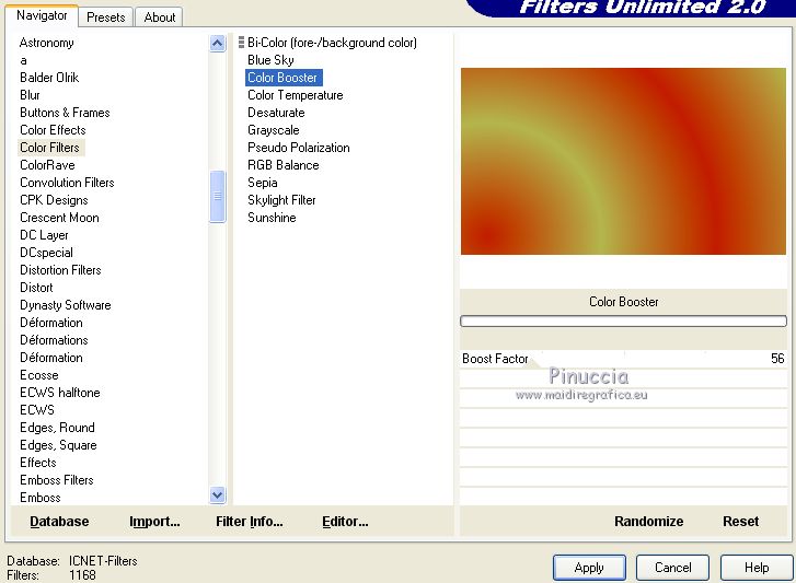qui puoi trovare qualche risposta ai tuoi dubbi. Se l'argomento che ti interessa non è presente, ti prego di segnalarmelo. Questo tutorial è stato creato con PSP2019 e tradotto con PSPX7, ma può essere realizzato anche con le altre versioni di PSP. Dalla versione X4, il comando Immagine>Rifletti è stato sostituito con Immagine>Capovolgi in orizzontale, e il comando Immagine>Capovolgi con Immagine>Capovolgi in verticale. Nelle versioni X5 e X6, le funzioni sono state migliorate rendendo disponibile il menu Oggetti. Con la nuova versione X7, sono tornati Rifletti>Capovolgi, ma con nuove varianti. Vedi la scheda sull'argomento qui Le vostre versioniOccorrente: Materiale qui Grazie per il tube Nicole Bambou e per la maschera Narah. Il resto del materiale è di Crealine. (in questa pagina trovi i links ai siti dei creatori del materiale usato nei tutorial) Filtri: se hai problemi con i filtri, consulta la mia sezione filtri qui Filters Unlimited 2.0 qui &<Bkg Designer sf10IV> - @BlueBerry Pie (da importare in Unlimited) qui AAA Frames - Foto Frame qui AP 01 [Innovations] - Lines SilverLining qui L&K's - L&K's Jeffrey qui L&K's - L&K's Zitah qui Graphics Plus - Emboss qui Nik Software - Color Efex Pro qui Alien Skin Eye Candy 5 Impact - Perspective Shadow qui I filtri Graphics Plus si possono usare da soli o importati in Filters Unlimited (come fare vedi qui) Se un filtro fornito appare con questa icona ![]() non esitare a cambiare modalità di miscelatura e opacità secondo i colori utilizzati. Nelle ultime versioni di PSP non c'è il gradiente di primo piano/sfondo (Corel_06_029) Puoi usare i gradienti delle versioni precedenti. Trovi qui i gradienti Corel X. ![]() Metti la linea di stile Line 240_créaline nella cartelle Linee di stile. Apri la maschera in PSP e minimizzala con il resto del materiale. Imposta il colore di primo piano con #9d2703, e il colore di sfondo con #aaac61. ![]() Passa il colore di primo piano a Gradiente di primo piano/sfondo, stile Sprazzo di luce. ![]() 1. Apri Alpha_Abstrait. Finestra>Duplica o sulla tastiera maiuscola+D per fare una copia. ![]() Chiudi l'originale. La copia, che sarà la base del tuo lavoro, non è vuota, ma contiene le selezioni salvate sul canale alfa. Riempi l'immagine trasparente con il gradiente.2. Effetti>Plugins>Filters Unlimited 2.0 - Color Filter - Color Booster. ![]() 3. Livelli>Duplica. Immagine>Rifletti. Immagine>Capovolgi. Abbassa l'opacità di questo livello al 50%. Livelli>Unisci>Unisci giù. 4. Effetti>Plugins>Filters Unlimited 2.0 - &<Bkg Designer sf10IV> - @BlueBerry Pie. ![]() Ripeti l'Effetto una seconda volta. 5. Regola>Messa a fuoco>Accentua messa a fuoco. 6. Selezione>Carica/Salva selezione>Carica selezione da canale alfa. La selezione #1 è subito disponibile. Devi soltanto cliccare Carica. ![]() Selezione>Innalza selezione a livello. 7. Effetti>Plugins>AP 01 [Innovations] - Lines SilverLining. ![]() Selezione>Deseleziona. 8. Effetti>Effetti di immagine>Motivo unico. ![]() 9. Cambia la modalità di miscelatura di questo livello in Luminanza, o secondo i tuoi colori. 10. Livelli>Duplica. Immagine>Rifletti. Livelli>Unisci>Unisci giù. Cambia la modalità di miscelatura di questo livello in Filtra. 11. Attiva il livello di sfondo, Raster 1. Selezione>Carica/Salva selezione>Carica selezione da canale alfa. Apri il menu delle selezioni e carica la selezione #2. ![]() Selezione>Innalza selezione a livello. Selezione>Deseleziona. 12. Effetti>Plugins>L&K's - L&K's Jeffrey ![]() 13. Effetti>Effetti di immagine>Motivo unico. ![]() Regola>Messa a fuoco>Accentua messa a fuoco. 14. Effetti>Effetti 3D>Sfalsa ombra, colore di primo piano. ![]() 15. Attiva il livello superiore. Livelli>Unisci>Unisci giù. 16. Effetti>Effetti 3D>Sfalsa ombra, con i settaggi standard. ![]() Regola>Messa a fuoco>Metti a fuoco. 17. Livelli>Nuovo livello raster. Selezione>Carica/Salva selezione>Carica selezione da canale alfa. Apri il menu delle selezioni e carica la selezione #3. ![]() 18. Imposta il colore di primo piano con il colore bianco #ffffff. Abbassa l'opacità dello strumento Riempimento al 30%. Riempi la selezione con il colore bianco.![]() 19. Livelli>Nuovo livello maschera>Da immagine. Apri il menu sotto la finestra di origine e vedrai la lista dei files aperti. Seleziona la maschera Narah_mask_0497 ![]() Livelli>Duplica ![]() Livelli>Unisci>Unisci gruppo. Selezione>Deseleziona. 20. Livelli>Duplica. Immagine>Capovolgi. Abbassa l'opacità di questo livello al 59%. ![]() Livelli>Unisci>Unisci giù. 21. Effetti>Effetti di immagine>Motivo unico, con i settaggi standard. ![]() 22. Effetti>Effetti di distorsione>Onda. ![]() 23. Livelli>Nuovo livello raster. Selezione>Carica/Salva selezione>Carica selezione da canale alfa. Apri il menu delle selezioni e carica la selezione #4. ![]() 24. Imposta nuovamente il colore di primo piano al colore e al gradiente iniziali (tasto destro del mouse sulla paletta del colore e seleziona il colore iniziale #9d2703, e poi apri il menu della paletta e seleziona il gradiente) ![]() Imposta l'opacità dello strumento Riempimento al 60%. ![]() Riempi la selezione con il gradiente.![]() 25. Effetti>Plugins>L&K's - L&K's Zitah. ![]() 26. Effetti>Effetti 3D>Sfalsa ombra, colore nero. ![]() 27. Cambia la modalità di miscelatura di questo livello in Luce netta, o secondo i tuoi colori. Mantieni selezionato. ![]() 28. Livelli>Nuovo livello raster. Imposta di nuovo il colore di primo piano con il colore bianco. Riporta l'opacità dello strumento Riempimento a 100. Riempi il livello con il colore bianco.29. Selezione>Modifica>Contrai - 2 pixels. Premi sulla tastiera il tasto CANC ![]() Selezione>Deseleziona. 30. Livelli>Duplica. Immagine>Ridimensiona, al 40%, tutti i livelli non selezionato. 31. Effetti>Effetti di immagine>Motivo unico. ![]() 32. Livelli>Duplica. Immagine>Ridimensiona, all'80%, tutti i livelli non selezionato. 33. Effetti>Effetti di riflesso>Fuga di specchi. ![]() 34. Livelli>Duplica. Immagine>Rifletti. Live