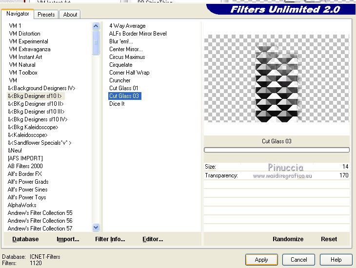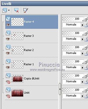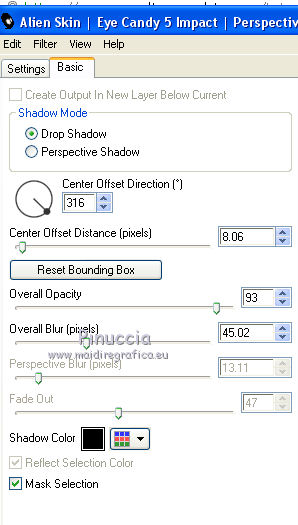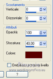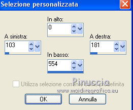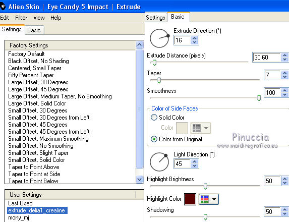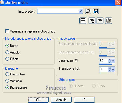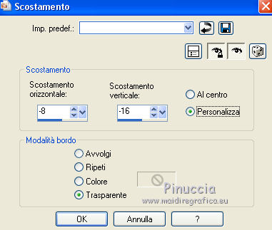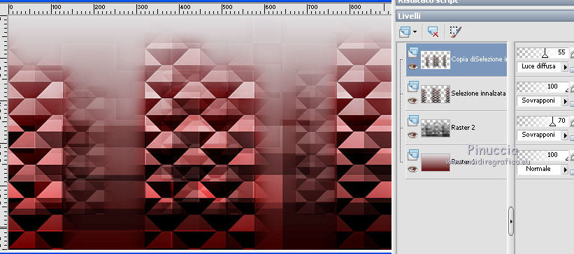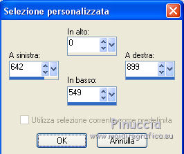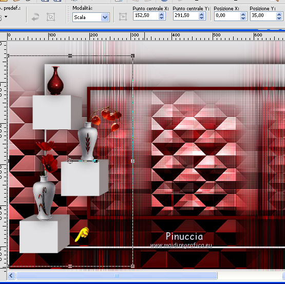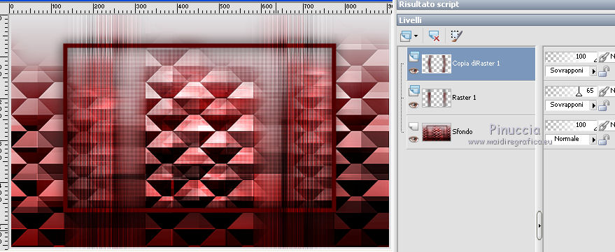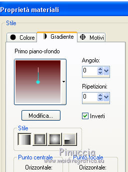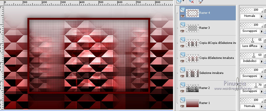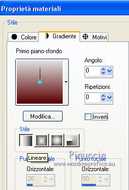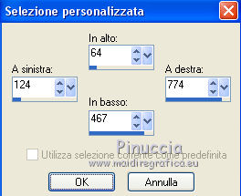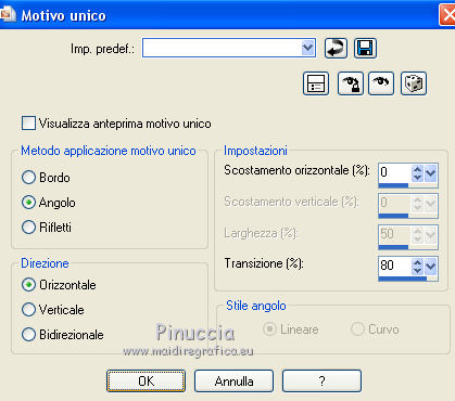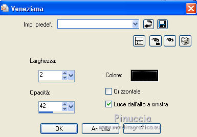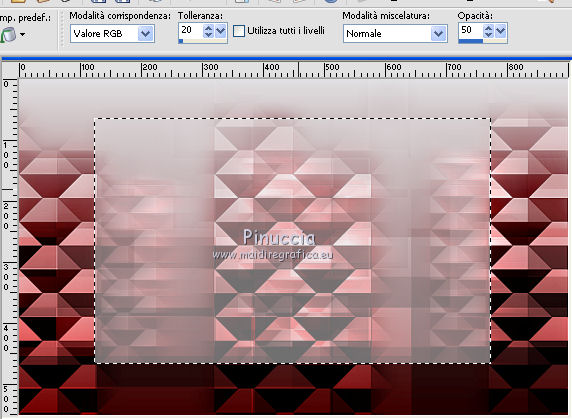 qui puoi trovare qualche risposta ai tuoi dubbi. Se l'argomento che ti interessa non è presente, ti prego di segnalarmelo. Questo tutorial è stato creato con PSPX3 e tradotto con PSPX, ma può essere realizzato anche con le altre versioni di PSP. Dalla versione X4, il comando Immagine>Rifletti è stato sostituito con Immagine>Capovolgi in orizzontale, e il comando Immagine>Capovolgi con Immagine>Capovolgi in verticale. Nelle versioni X5 e X6, le funzioni sono state migliorate rendendo disponibile il menu Oggetti. Con la nuova versione X7, sono tornati Rifletti>Capovolgi, ma con nuove varianti. Vedi la scheda sull'argomento qui Le vostre versioniOccorrente: Materiale qui Per il tube grazie Alies. Il resto del materiale è di Crealine. (in questa pagina trovi i links ai siti dei creatori del materiale usato nei tutorial) Filtri: se hai problemi con i filtri, consulta la mia sezione filtri qui Filters Unlimited 2.0 qui &<Bkg Designers sf10I> - Cut Glass 3 (da importare in Unlimited) qui Alien Skin Eye Candy 5 Impact - Extrude, Perspective Shadow qui ![]() non esitare a cambiare modalità di miscelatura e opacità secondo i colori utilizzati. Nelle ultime versioni di PSP non c'è il gradiente di primo piano/sfondo (Corel_06_029) Puoi usare i gradienti delle versioni precedenti. Trovi qui i gradienti Corel X. Metti il preset Cliccando sul file una o due volte (a seconda delle tue impostazioni), automaticamente il preset si installerà nella cartella corretta. perchè uno o due clic vedi qui ![]() Metti la selezione nella cartella Selezioni. Imposta il colore di primo piano con #5a0000, e il colore di sfondo con #e1e0e2. ![]() Passa il colore di primo piano a Gradiente di primo piano/sfondo, stile Lineare. ![]() 1. Apri una nuova immagine trasparente 900 x 550 pixels, e riempila con il gradiente.2. Apri il tube elemetìnt 1delia e vai a Modifica>Copia. Torna al tuo lavoro e vai a Modifica>Incolla come nuovo livello. 3. Cambia la modalità di miscelatura di questo livello in Sovrapponi, e abbassa l'opacità al 70%. Regola>Messa a fuoco>Accentua messa a fuoco. 4. Attiva lo strumento Selezione ![]() (non importa il tipo di selezione impostato, perchè con la selezione personalizzata si ottiene sempre un rettangolo) clicca sull'icona Selezione personalizzata ![]() e imposta i seguenti settaggi. ![]() Selezione>Innalza selezione a livello. Selezione>Deseleziona. Cambia la modalità di miscelatura di questo livello in Sovrapponi. 5.Effetti>Effetti di immagine>Scostamento. ![]() 6. Effetti>Plugins>Alien Skin Eye Candy 5 Impact - Perspective Shadow. ![]() 7. Effetti>Plugins>Filters Unlimited 2.0 - &<Bkg Designersf10I> - Cut Glass 03. ![]() 8. Effetti>Effetti 3D>Sfalsa ombra, colore di primo piano #5a0000. ![]() 9. Effetti>Effetti di immagine>Motivo unico. ![]() Regola>Messa a fuoco>Accentua messa a fuoco. 10. Livelli>Duplica. Immagine>Ridimensiona, al 70%, tutti i livelli non selezionato. 11. Cambia la modalità di miscelatura di questo livello in Luce diffusa, e abbassa l'opacità al 55%. ![]() 12. Livelli>Duplica. Attiva il livello sottostante, copia di selezione personalizzata. Effetti>Effetti di distorsione>Vento - da sinistra, intensità 100. ![]() 13. Cambia la modalità di miscelatura di questo livello in Indebolisci, e abbassa l'opacità al 60%. Effetti>Effetti di bordo>Aumenta di più. 14. Attiva nuovamente il livello superiore. Selezione personalizzata ![]() ![]() 15. Livelli>Nuovo livello raster. Abbassa l'opacità dello strumento Riempimento al 50%. Riempi la selezione con il colore di sfondo.![]() Non dimenticare di riportare l'opacità dello strumento Riempimento a 100. 16. Effetti>Effetti di trama>Veneziana. ![]() Ripeti l'Effetto Veneziana, orizzontale non selezionato. ![]() Effetti>Effetti di bordoAumenta. Cambia la modalità di miscelatura di questo livello in Sovrapponi. 17. Livelli>Nuovo livello raster. Passa il colore di primo piano a Colore. Riempi il livello con il colore di primo piano #5a0000.18. Selezione>Modifica>Contrai - 10 pixels. Premi sulla tastiera il tasto CANC ![]() Selezione>Deseleziona. 19. Effetti>Effetti 3D>Sfalsa ombra, colore nero. ![]() Dovresti avere questo ![]() 20. Livelli>Unisci>Unisci visibile. 21. Immagine>Aggiungi bordatura, 5 pixels, simmetriche, colore chiaro di sfondo #e1e0e2. 22. Selezione personalizzata ![]() ![]() 23. Livelli>Nuovo livello raster. Riporta il colore di primo piano a Gradiente, e seleziona Inverti ![]() Riempi la selezione con il gradiente.24. Effetti>Effetti di trama>Veneziana. ![]() Regola>Messa a fuoco>Accentua messa a fuoco. Selezione>Deseleziona. 25. Effetti>Effetti 3D>Sfalsa ombra, con i settaggi precedenti. ![]() Abbassa l'opacità di questo livello all'80%. 26. Effetti>Effetti di immagine>Motivo unico. ![]() 27. Livelli>Duplica. Immagine>Rifletti. Livelli>Unisci>Unisci giù. 28. Cambia la modalità di miscelatura di questo livello in Sovrapponi, e abbassa l'opacità al 65%. Regola>Messa a fuoco>Accentua messa a fuoco. 29. Livelli>Duplica. Effetti>Effetti di immagine>Motivo unico. ![]() Riporta l'opacità di questo livello a 100. ![]() 30. Livelli>Unisci>Unisci visibile. Livelli>Duplica. Immagine>Ridimensiona, all'80%, tutti i livelli non selezionato. Effetti>Effetti 3D>Sfalsa ombra, con i settaggi precedenti. 31. Livelli>Nuovo livello raster. Selezione>Carica/Salva selezione>Carica selezione da disco. Cerca e carica la selezione Select_9Crealine. ![]() Modalita di corrispondenza dello strumento Riempimento su Nessuno e basterà un solo clic per riempire le selezioni con il colore chiaro di sfondo #e1e0e2.32. Effetti>Plugins>Alien Skin Eye Candy 5 Impact - Extrude. Seleziona il preset extrude_delia1_crealine e ok. Questi i settaggi, in caso di problemi con il preset. ![]() Selezione>Deseleziona. 33. Effetti>Effetti 3D>Sfalsa ombra, colore nero. ![]() 34. Effetti>Effetti di immagine>Scostamento. ![]() 35. Apri il tube flowers 73 e vai a Modifica>Copia. Torna al tuo lavoro e vai a Modifica>Incolla come nuovo livello. Immagine