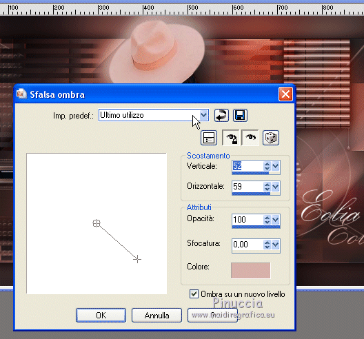 qui puoi trovare qualche risposta ai tuoi dubbi. Se l'argomento che ti interessa non è presente, ti prego di segnalarmelo. Questo tutorial è stato creato con PSP2020 e tradotto con PSPX, ma può essere realizzato anche con le altre versioni di PSP. Dalla versione X4, il comando Immagine>Rifletti è stato sostituito con Immagine>Capovolgi in orizzontale, e il comando Immagine>Capovolgi con Immagine>Capovolgi in verticale. Nelle versioni X5 e X6, le funzioni sono state migliorate rendendo disponibile il menu Oggetti. Con la nuova versione X7, sono tornati Rifletti>Capovolgi, ma con nuove varianti. Vedi la scheda sull'argomento qui Le vostre versioniOccorrente: Materiale qui Per il tube e la maschera grazie Beatriz e Narah. Il resto del materiale è di Crealine. (in questa pagina trovi i links ai siti dei creatori del materiale usato nei tutorial) Filtri: se hai problemi con i filtri, consulta la mia sezione filtri qui Filters Unlimited 2.0 qui Mehdi - Sorting Tiles qui VanDerLee - Unplugged-X qui Alien Skin Eye Candy 5 Impact - Perspective Shadow qui DSB Flux - Linear Transmission qui ![]() non esitare a cambiare modalità di miscelatura e opacità secondo i colori utilizzati. Nelle ultime versioni di PSP non c'è il gradiente di primo piano/sfondo (Corel_06_029) Puoi usare i gradienti delle versioni precedenti. Trovi qui i gradienti Corel X. Metti il preset Cliccando sul file una o due volte (a seconda delle tue impostazioni), automaticamente il preset si installerà nella cartella corretta. perchè uno o due clic vedi qui ![]() Apri la maschera in PSP e minimizzala con il resto del materiale. Imposta il colore di primo piano con #dfbcb6, e il colore di sfondo con #e90c15. ![]() Passa il colore di primo piano a Gradiente di primo piano/sfondo, stile Sprazzo di luce. ![]() 1. Apri Alpha-Eolia. Finestra>Duplica, o sulla tastiera maiuscola+D, per fare una copia ![]() Chiudi l'originale. La copia, che sarà la base del tuo lavoro, non è vuota, ma contiene le selezioni salvate sul canale alfa. (nel materiale trovi anche le selezioni da caricare da disco, se hai problemi con il canale alfa). 2. Riempi l'immagine trasparente con il gradiente.3. Livelli>Nuovo livello raster, raster 2. Selezione>Seleziona tutto. Apri il tube principale e vai a Modifica>Copia. Torna al tuo lavoro e vai a Modifica>Incolla nella selezione. Selezione>Deseleziona. Effetti>Effetti di immagine>Motivo unico, con i settaggi standard. ![]() Regola>Sfocatura>Sfocatura gaussiana - raggio 40. ![]() Effetti>Plugins>Mehdi - Sorting Tiles. ![]() Effetti>Effetti di immagine>Motivo unico, Intermittente diagonale. ![]() Effetti>Effetti di bordo>Aumenta. 4. Livelli>Duplica. Effetti>Effetti geometrici>Inclina. ![]() 5. Cambia la modalità di miscelatura di questo livello in Sovrapponi, o altro secondo i tuoi colori. (per la mia variante ho scelto Moltiplica). ![]() Livelli>Unisci>Unisci visibile. 6. Selezione>Carica/Salva selezione>Carica selezione da canale alfa. La selezione #1 è subito disponibile. Devi soltanto cliccare Carica. ![]() Selezione>Innalza selezione a livello. Selezione>Deseleziona. Effetti>Plugins>VanDerLee - Unplugged-X - Defocus ![]() Effetti>Plugins>Alien Skin Eye Candy 5 Impact - Perspective Shadow. Seleziona il preset eolia-1_crealine e ok. Questi i settaggi, in caso di problemi con il preset. ![]() (per la mia variante, ho cambia la modalità di miscelatura in Moltiplica). 7. Livelli>Nuovo livello raster, Raster 1. Passa il colore di primo piano a Colore. Riempi il livello con il colore di primo piano #dfbcb6.Livelli>Nuovo livello maschera>Da immagine. Apri il menu sotto la finestra d'origine e vedrai la lista dei files aperti. Seleziona la maschera Narah_Mask_1165 ![]() Livelli>Unisci>Unisci gruppo. 8. Livelli>Nuovo livello raster, Raster 1. Selezione>Carica/Salva selezione>Carica selezione da canale alfa. Apri il menu delle selezioni e carica la selezione #2. ![]() Effetti>Plugins>VanDerLee - Unplugged-X - Jalusi - colore di primo piano (foreground) ![]() Effetti>Effetti 3D>Sfalsa ombra, colore nero. ![]() Selezione>Deseleziona. Apri il tube déco-Eolia-1 e vai a Modifica>Copia. Torna al tuo lavoro e vai a Modifica>Incolla come nuovo livello. Tasto K sulla tastiera per attivare lo strumento Puntatore ![]() e imposta Posione X: 798,00 e Posizione Y: 190,00 ![]() Livelli>Disponi>Sposta giù. Cambia la modalità di miscelatura di questo livello in Luminanza (esistente). Effetti>Effetti 3D>Sfalsa ombra, con i settaggi precedenti. Attiva nuovamente il livello superiore, Raster 1. Livelli>Unisci>Unisci giù. 9. Attiva il livello inferiore. Selezione>Carica/Salva selezione>Carica selezione da canale alfa. Apri il menu delle selezioni e carica la selezione #3. ![]() Selezione>Innalza selezione a livello. Effetti>Effetti 3D>Sfalsa ombra, con i settaggi precedenti. Selezione>Deseleziona. Effetti>Plugins>Dsb Flux - Linear Transmission. ![]() Livelli>Disponi>Porta in alto. Livelli>Duplica. Effetti>Effetti di immagine>Motivo unico, con i settaggi standard. ![]() Cambia la modalità di miscelatura di questo livello in Sovrapponi o altro. 10. Chiudi i tre livelli superiori e attiva il livello inferiore. Livelli>Unisci>Unisci visibile. Lascia i livelli chiusi per il momento. 11. Rimani posizionato sul livello inferiore. Attiva lo strumento Selezione ![]() (non importa il tipo di selezione impostato, perchè con la selezione personalizzata si ottiene sempre un rettangolo) clicca sull'icona Selezione personalizzata ![]() e imposta i seguenti settaggi. ![]() Selezione>Innalza selezione a livello. Selezione>Deseleziona. Livelli>Disponi>Porta in alto. Adesso puoi riaprire gli altri livelli. 12. Apri il tube déco-Eolia-2 e vai a Modifica>Copia. Torna al tuo lavoro e vai a Modifica>Incolla come nuovo livello. Tasto K sulla tastiera per attivare lo strumento Puntatore ![]() e imposta Posione X: 24,00 e Posizione Y: 288,00 ![]() Colorizza, se necessario, con il tuo colore di sfondo. Effetti>Effetti 3D>Sfalsa ombra, con i settaggi