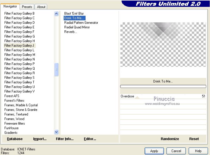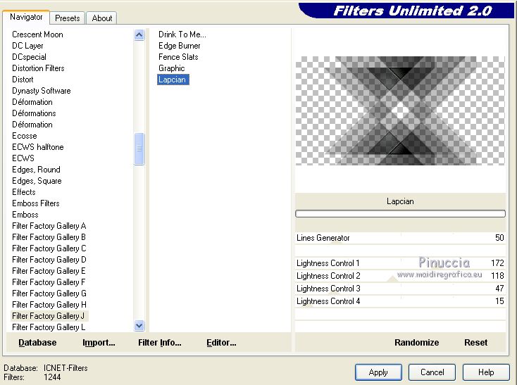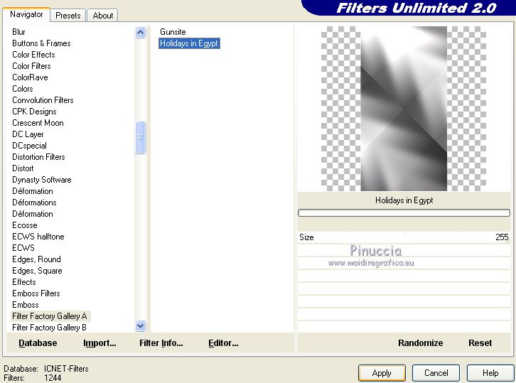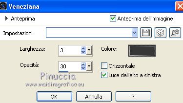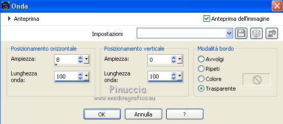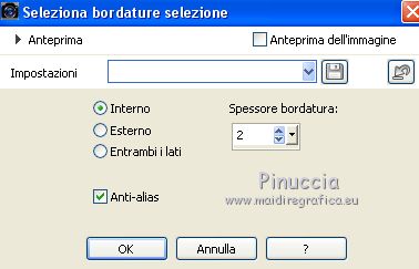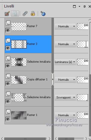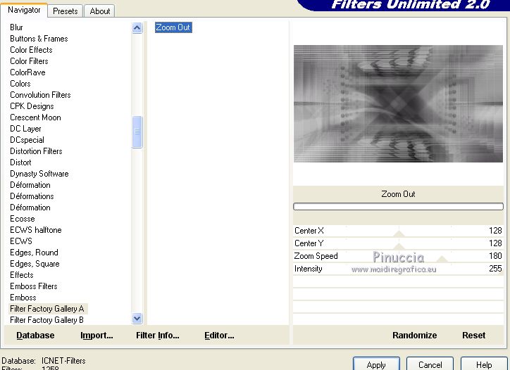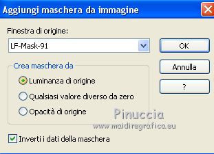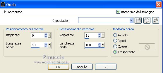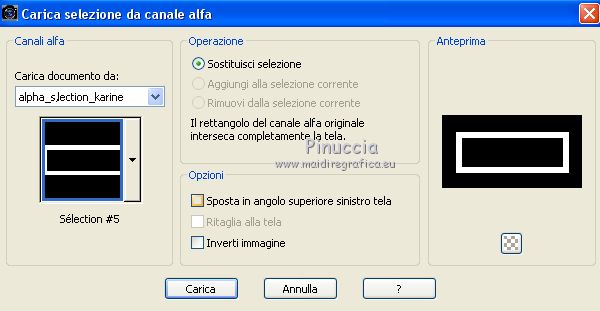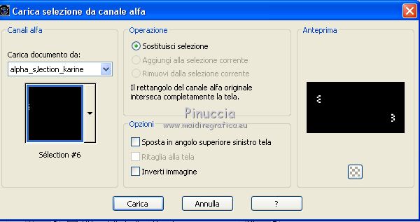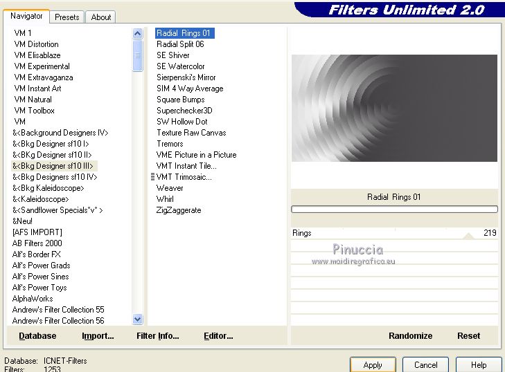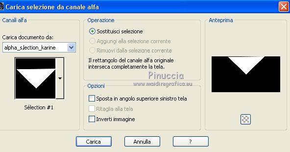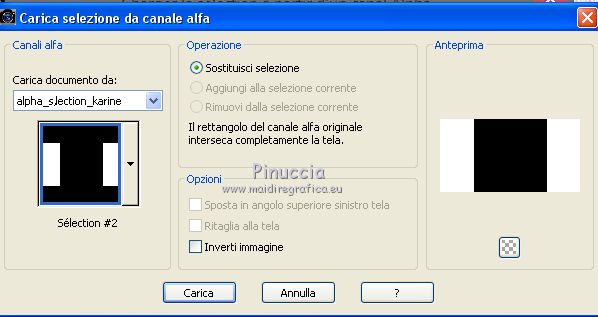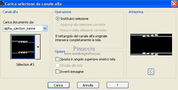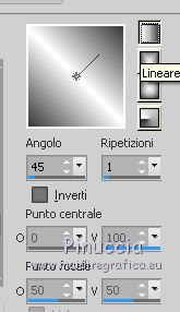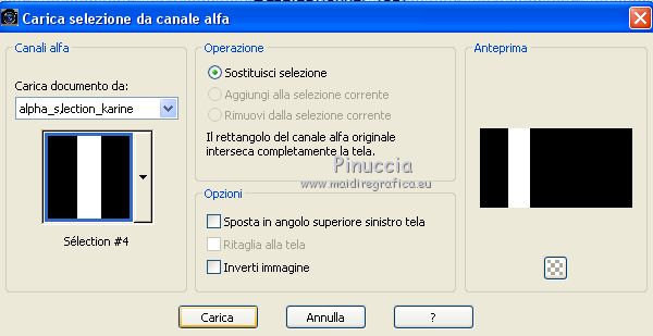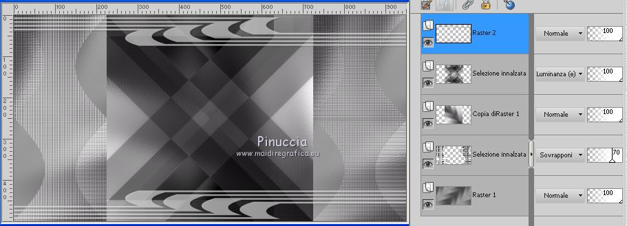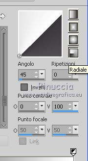 qui puoi trovare qualche risposta ai tuoi dubbi. Se l'argomento che ti interessa non è presente, ti prego di segnalarmelo. Questo tutorial è stato creato con PSPX6 e tradotto con PSPX, ma può essere realizzato anche con le altre versioni di PSP. Dalla versione X4, il comando Immagine>Rifletti è stato sostituito con Immagine>Capovolgi in orizzontale, e il comando Immagine>Capovolgi con Immagine>Capovolgi in verticale. Nelle versioni X5 e X6, le funzioni sono state migliorate rendendo disponibile il menu Oggetti. Con la nuova versione X7, sono tornati Rifletti>Capovolgi, ma con nuove varianti. Vedi la scheda sull'argomento qui Le vostre versioniOccorrente: Materiale qui Per il tube grazie karine e per la maschera Linda. (in questa pagina trovi i links ai siti dei creatori del materiale usato nei tutorial) Filtri: se hai problemi con i filtri, consulta la mia sezione filtri qui Filters Unlimited 2.0 qui &<Bkg Designer sf10III> - Radial Rings 01 (da importare in Unlimited) qui Filter Factory Gallery A - Holydays in Egypt, Zoom out qui Filter Factory Gallery J - Drink to me, Lapcian qui Filter Factory Gallery M - Loom qui Simple - Diamonds qui I filtri Simple e Factory Gallery si possono usare da soli o importati in Filters Unlimited (come fare vedi qui) Se un filtro fornito appare con questa icona ![]() non esitare a cambiare modalità di miscelatura e opacità secondo i colori utilizzati. Nelle ultime versioni di PSP non c'è il gradiente di primo piano/sfondo (Corel_06_029) Puoi usare i gradienti delle versioni precedenti. Trovi qui i gradienti Corel X. ![]() Apri la maschera in PSP e minimizzala con il resto del materiale. Imposta il colore di primo piano con #393739, e il colore di sfondo con il colore #ffffff. ![]() Passa il colore di primo piano a Gradiente di primo piano/sfondo, stile Radiale. ![]() 1. Apri Canal Alpha-Karine. Finestra>Duplica, o sulla tastiera maiuscola+D, per fare una copia ![]() Chiudi l'originale. La copia, che sarà la base del tuo lavoro, non è vuota, ma contiene le selezioni salvate sul canale alfa. Riempi l'immagine trasparente con il gradiente.Regola>Sfocatura>Sfocatura gaussiana - raggio 30. ![]() Effetti>Effetti di immagine>Motivo unico. ![]() Effetti>Plugins>Filters Unlimited 2.0 - &<Bkg Designer sf10III> - Radial Rings 01. ![]() Regola>Messa a fuoco>Accentua messa a fuoco. 2. Livelli>Duplica. Immagine>Rifletti. Abbassa l'opacità di questo livello al 50%. Livelli>Unisci>Unisci giù. Effetti>Plugins>Simple - Diamonds. Livelli>Duplica. Immagine>Ruota per gradi - 90 gradi a destra. ![]() Effetti>Plugins>Filters Unlimited 2.0 - Filter Factory Gallery A - Holidays in Egypt ![]() Selezione>Carica/Salva selezione>Carica selezione da canale alfa. La selezione #1 è subito disponibile. Devi soltanto cliccare Carica. ![]() Selezione>Innalza selezione a livello. Selezione>Deseleziona. Effetti>Plugins>Filters Unlimited 2.0 - Filter Factory Gallery J - Drink to me ![]() Livelli>Duplica. Immagine>Capovolgi. Livelli>Unisci>Unisci giù. Effetti>Plugins>Filters Unlimited 2.0 - Filter Factory Gallery J - Lapcian. ![]() Cambia la modalità di miscelatura di questo livello in Luminanza (esistente), o secondo i tuoi colori. Effetti>Effetti 3D>Sfalsa ombra, colore nero. ![]() 3. Rimani posizionato sul livello superiore. Selezione>Carica/Salva selezione>Carica selezione da canale alfa. Apri il menu delle selezioni e carica la selezione #2. ![]() Premi sulla tastiera il tasto CANC. Mantieni selezionato. Attiva il livello di sfondo, Raster 1. Selezione>Innalza selezione a livello. Selezione>Deseleziona. Effetti>Effetti di distorsione>Onda. ![]() Cambia la modalità di miscelatura di questo livello in Sovrapponi o altro, e abbassa l'opacità al 70%. Effetti>Plugins>Filters Unlimited 2.0 - Filter Factory Gallery M - Loom ![]() 4. Attiva il livello superiore. Livelli>Nuovo livello raster. Selezione>Carica/Salva selezione>Carica selezione da canale alfa. Apri il menu delle selezioni e carica la selezione #3. ![]() Riempi con il colore di sfondo #ffffff.Selezione>Deseleziona. Effetti>Effetti 3D>Sfalsa ombra, colore nero. ![]() 5. Dovresti avere questo. ![]() 6. Livelli>Nuovo livello raster. Selezione>Carica/Salva selezione>Carica selezione da canale alfa. Apri il menu delle selezioni e carica la selezione #4. ![]() Riempi con il colore di sfondo #ffffff.Selezione>Deseleziona. Effetti>Effetti di immagine>Motivo unico. ![]() Livelli>Disponi>Sposta giù. Effetti>Effetti di trama>Veneziana. ![]() Effetti>Effetti 3D>Sfalsa ombra, colore nero. ![]() Abbassa l'opacità di questo livello al 60%. 7. Attiva il livello superiore. Apri il tube déco_1_Karine_linette e vai a Modifica>Copia. Torna al tuo lavoro e vai a Modifica>Incolla come nuovo livello. Non spostarlo. E' al suo posto. Colorizza o cambia la modalità di miscelatura di questo livello in Luminanza (esistente). 8. Livelli>Nuovo livello raster. Cambia i settaggi del gradiente in stile Lineare. ![]() Selezione>Carica/Salva selezione>Carica selezione da canale alfa. Apri il menu delle selezioni e carica la selezione #5. ![]() Abbassa l'opacità dello strumento Riempimento al 50%. ![]() Riempi la selezione con il gradiente.Selezione>Deseleziona. Livelli>Disponi>Sposta giù. Effetti>Effetti 3D>Sfalsa ombra, colore nero. ![]() Effetti>Effetti di bordo>Aumenta di più. 9. Livelli>Nuovo livello raster. Selezione>Carica/Salva selezione>Carica selezione da canale alfa. Apri il menu delle selezioni e carica la selezione #6. ![]() Passa il colore di primo piano a Colore, mantieni l'opacità dello strumento Riempimento a 50, e riempi la selezione con il colore di primo piano.Selezione>Deseleziona. Effetti>Effetti di bordo>Aumenta di più. Effetti>Effetti 3D>Sfalsa ombra, colore nero. ![]() Livelli>Duplica. Cambia la modalità di miscelatura di questo livello in Filtra. Apri il tube déco_2_karine_linette e vai a Modifica>Copia. Torna al tuo lavoro e vai a Modifica>Incolla come nuovo livello. Non spostarlo. E' al suo posto. Cambia la modalit