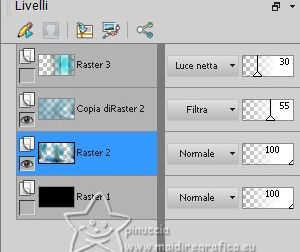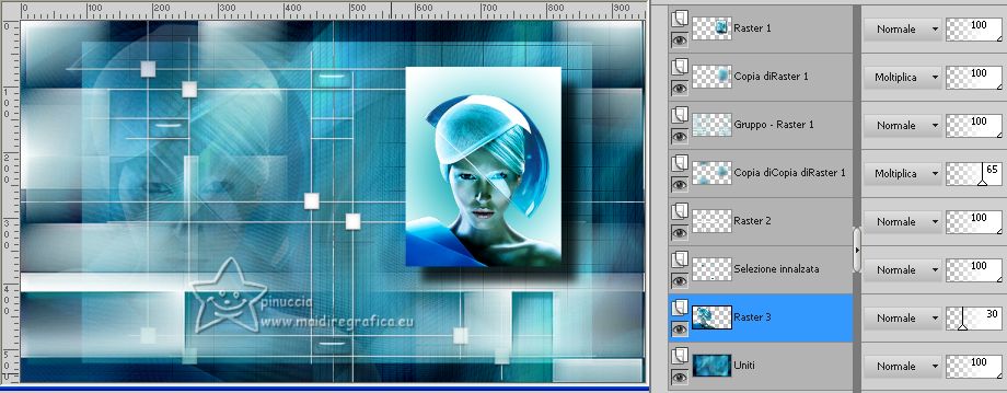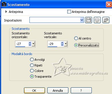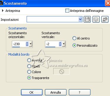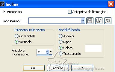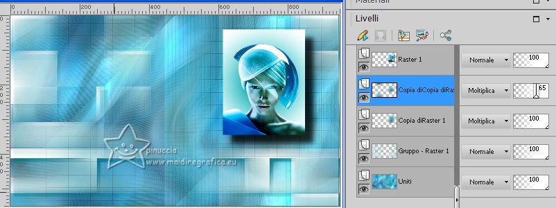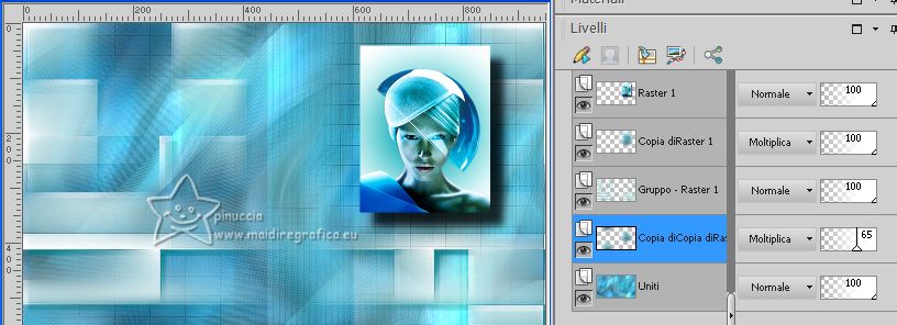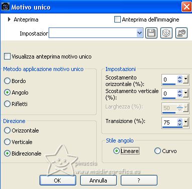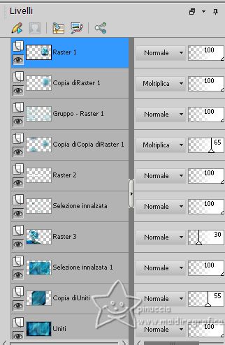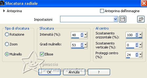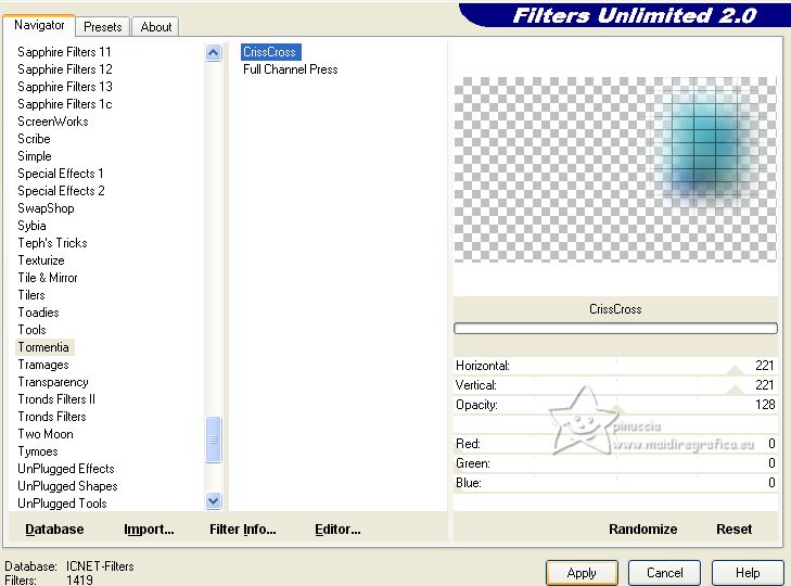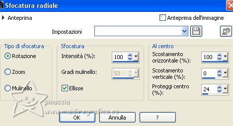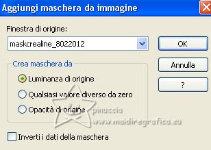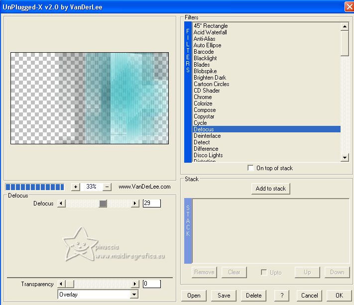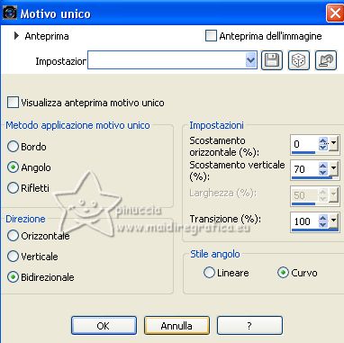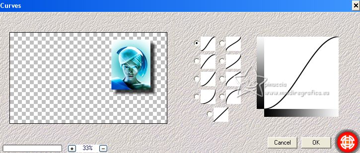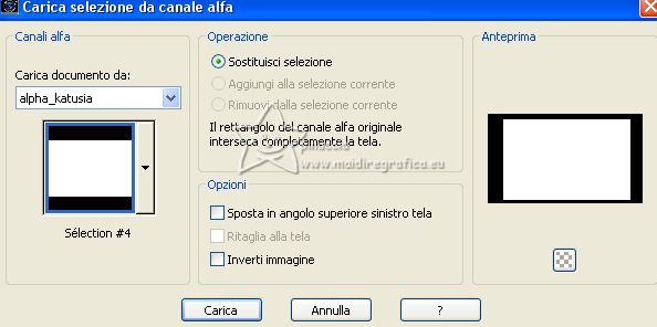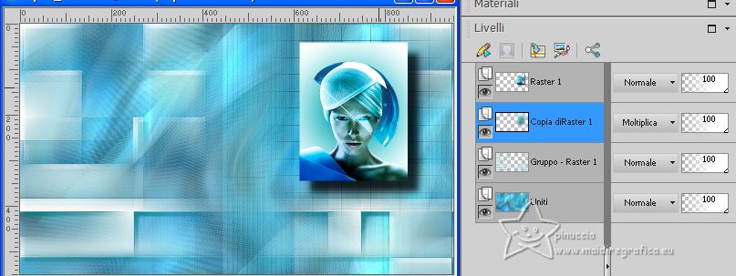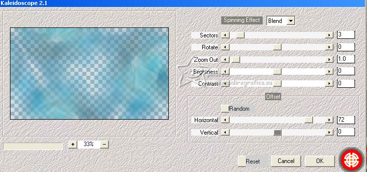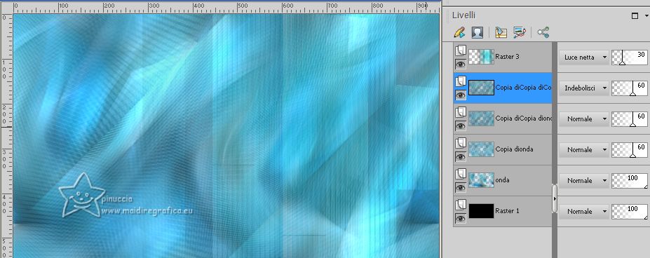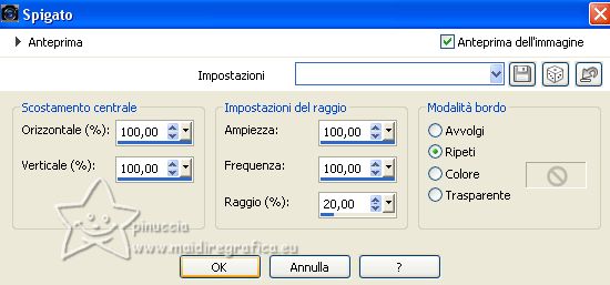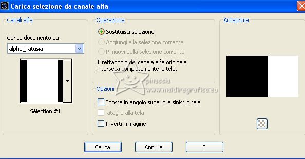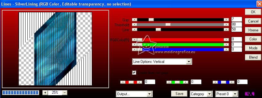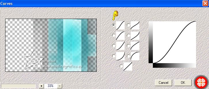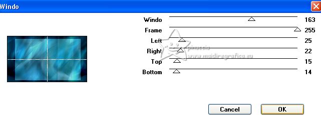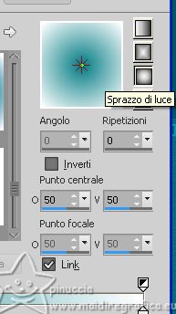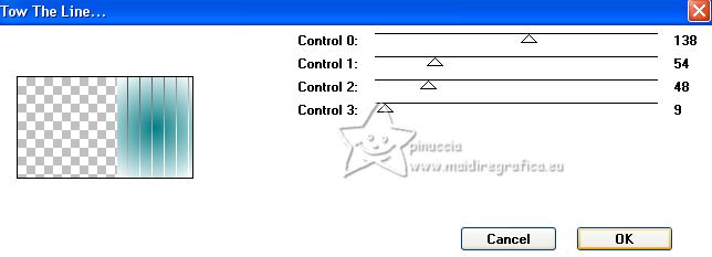 qui puoi trovare qualche risposta ai tuoi dubbi. Se l'argomento che ti interessa non è presente, ti prego di segnalarmelo. Questo tutorial è stato creato con PSPX8 e tradotto con PSPX7, ma può essere realizzato anche con le altre versioni di PSP. Dalla versione X4, il comando Immagine>Rifletti è stato sostituito con Immagine>Capovolgi in orizzontale, e il comando Immagine>Capovolgi con Immagine>Capovolgi in verticale. Nelle versioni X5 e X6, le funzioni sono state migliorate rendendo disponibile il menu Oggetti. Con la nuova versione X7, sono tornati Rifletti>Capovolgi, ma con nuove varianti. Vedi la scheda sull'argomento qui Le vostre versioniOccorrente: Materiale qui Per il tube grazie Kts. Il resto del materiale è di Crealine (in questa pagina trovi i links ai siti dei creatori del materiale usato nei tutorial) Filtri: se hai problemi con i filtri, consulta la mia sezione filtri qui Filters Unlimited 2.0 qui Mehdi - Curves qui Mehdi - Kaleidoscope 2.1 qui Tramages - Tow the lines qui VanDerLee - Unplugged-X qui Tormentia - Criss Cross qui Mock - Windo qui Alien Skin Eye Candy 5 Impact - Glass qui AP 01 Innovations - Lines SilverLining qui I filtri Tramages, Tormentia e Mock si possono usare da soli o importati in Filters Unlimited (come fare vedi qui) Se un filtro fornito appare con questa icona ![]() non esitare a cambiare modalità di miscelatura e opacità secondo i colori utilizzati. Nelle ultime versioni di PSP non c'è il gradiente di primo piano/sfondo (Corel_06_029) Puoi usare i gradienti delle versioni precedenti. Trovi qui i gradienti Corel X. ![]() Apri la maschera in PSP e minimizzala con il resto del materiale. Imposta il colore di primo piano con #017881, e il colore di sfondo con il colore #000000. ![]() 1. Apri Canal Alpha-katusia. Finestra>Duplica, o sulla tastiera maiuscola+D, per fare una copia ![]() Chiudi l'originale. La copia, che sarà la base del tuo lavoro, non è vuota, ma contiene le selezioni salvate sul canale alfa. Riempi l'immagine trasparente con il colore di sfondo.Apri il tube K-T-s©ginno_adducente_1 ![]() Modifica>Copia. Torna al tuo lavoro e vai a Modifica>Incolla come nuovo livello. Regola>Sfocatura>Sfocatura radiale. ![]() Regola>Messa a fuoco>Accentua messa a fuoco. Effetti>Effetti di immagine>Motivo unico. ![]() 2. Rimani posizionato sul livello Raster 2. Livelli>Duplica. Regola>Sfocatura>Sfocatura radiale. ![]() Effetti>Effetti di distorsione>Spigato ![]() Regola>Messa a fuoco>Accentua messa a fuoco. Cambia la modalità di miscelatura di questo livello in Filtra, e abbassa l'opacità al 55%. 3. Imposta il colore di sfondo con il colore bianco #ffffff. ![]() Passa il colore di primo piano a Gradiente di primo piano/sfondo, stile Sprazzo di luce. ![]() Livelli>Nuovo livello raster. Selezione>Carica/Salva selezione>Carica selezione da canale alfa. La selezione sélection #1 è subito disponibile. Devi soltanto cliccare Carica. ![]() Riempi la selezione con il gradiente.Selezione>Deseleziona. Effetti>Plugins>Tramages - Tow the line ![]() Cambia la modalità di miscelatura di questo livello in Luce netta, e abbassa l'opacità al 30%. Effetti>Effetti di immagine>Motivo unico, Intermittente diagonale. ![]() Effetti>Plugins>VanDerLee - Unplugged-X - Defocus ![]() Effetti>Plugins>Mehdi - Curves. ![]() 4. Chiudi il livello di sfondo e il livello Raster 3. Livelli>Unisci>Unisci visibile. ![]() Rinomina questo livello "onda". Livelli>Visualizza>Tutto, e rimani posizionato sul livello "onda". ![]() 5. Livelli>Duplica. Immagine>Rifletti. Immagine>Capovolgi. Effetti>Plugins>Mehdi - Kaleidoscope 2.1. ![]() Abbassa l'opacità di questo livello al 60%. 6. Rimani posizionato sul livello copia di "onda". Livelli>Duplica. Effetti>Effetti geometrici>Inclina. ![]() Effetti>Effetti 3D>Sfalsa ombra, colore nero. ![]() 7. Livelli>Duplica. Cambia la modalità di miscelatura di questo livello in Indebolisci. ![]() Livelli>Unisci>Unisci visibile. 8. Livelli>Nuovo livello raster. Riempi con il colore di sfondo #ffffff.Livelli>Nuovo livello maschera>Da immagine. Apri il menu sotto la finestra di origine e vedrai la lista dei files aperti. Seleziona la maschera maskcrealine_8022012 ![]() Livelli>Unisci>Unisci gruppo. Regola>Messa a fuoco>Accentua messa a fuoco. Effetti>Effetti 3D>Sfalsa ombra, colore di primo piano. ![]() Livelli>Duplica. Livelli>Unisci>Unisci giù. 9. Livelli>Nuovo livello raster. Selezione>Carica/Salva selezione>Carica selezione da canale alfa. Apri il menu delle selezioni e carica la selezione sélection #2. ![]() Riempi la selezione con il gradiente.Mantieni selezionato. Modifica>Incolla come nuovo livello - il tube k-T-s Ginno-alducente è sempre in memoria. Immagine>Ridimensiona, al 50%, tutti i livelli non selezionato. Posiziona correttamente il tube sulla selezione.![]() Selezione>Inverti. Premi sulla tastiera il tasto CANC ![]() Di nuovo Selezione>Inverti. Regola>Messa a fuoco>Metti a fuoco. Livelli>Unisci>Unisci giù. Selezione>Deseleziona. Effetti>Effetti 3D>Sfalsa ombra, colore nero. ![]() Effetti>Plugins>Mehdi - Curves, con i settaggi precedenti. ![]() 10. Rimani posizionato sul livello della cornice, Raster 1. Livelli>Duplica. Regola>Sfocatura>Sfocatura gaussiana - raggio 44. ![]() Effetti>Plugins>Filters Unlimited 2.0 - Tormentia - Criss Cross, con i settaggi standard. ![]() Regola>Messa a fuoco>Accentua messa a fuoco. Livelli>Disponi>Sposta giù. Cambia la modalità di miscelatura di questo livello in Moltiplica, o altro. ![]() 11. Rimani posizionato sul livello Copia di Raster 1. Livelli>Duplica. Effetti>Effetti di immagine>Motivo unico. ![]() Abbassa l'opacità di questo livello al 65%. ![]() Livelli>Disponi>Sposta giù - 2 volte. ![]() 12. Attiva il livello di sfondo (Uniti). Apri il tube déco_katusia_1_crealine ![]() Modifica>Copia. Torna al tuo lavoro e vai a Modifica>Incolla come nuovo livello. Non spostarlo; è al suo posto. Attiva nuovamente il livello di sfondo. Selezione>Carica/Salva selezione>Carica selezione da canale alfa. 
