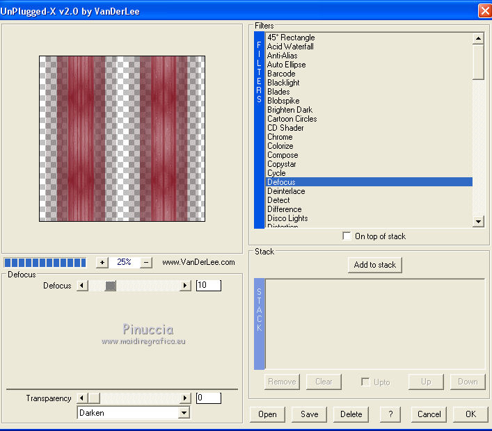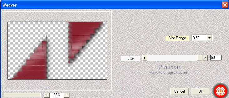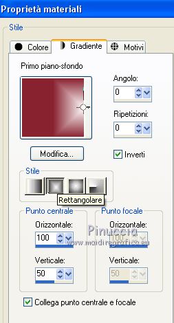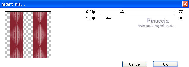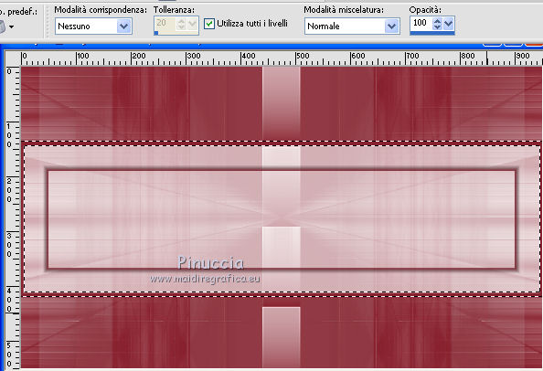 qui puoi trovare qualche risposta ai tuoi dubbi. Se l'argomento che ti interessa non è presente, ti prego di segnalarmelo. Questo tutorial è stato creato con PSPX5 e tradotto con PSPX, ma può essere realizzato anche con le altre versioni di PSP. Dalla versione X4, il comando Immagine>Rifletti è stato sostituito con Immagine>Capovolgi in orizzontale, e il comando Immagine>Capovolgi con Immagine>Capovolgi in verticale. Nelle versioni X5 e X6, le funzioni sono state migliorate rendendo disponibile il menu Oggetti. Con la nuova versione X7, sono tornati Rifletti>Capovolgi, ma con nuove varianti. Vedi la scheda sull'argomento qui Le vostre versioni Occorrente: Materiale qui Grazie Kitty per il tube. Il resto del materiale è di Linette. (in questa pagina trovi i links ai siti dei creatori di tubes) Filtri: se hai problemi con i filtri, consulta la mia sezione filtri qui Filters Unlimited 2.0 qui &<Bkg Designer sf10I> - AFS Tangent Waves, Convergence (da importare in Unlimited) qui VM Toolbox - Instant Tile qui VanDerLee - Unplugged-X qui Toadies - Weaver qui Ap Lines - Lines SilverLining qui Distort - Shear qui Mehdi - Weaver qui XE Xtras - Elemental qui Alien Skin Eye Candy 5 Impact - Perspective Shadow, Glass qui I filtri VM Toolbox e Toadies si possono usare da soli o importati in Filters Unlimited (come fare vedi qui) Se un filtro fornito appare con questa icona ![]() non esitare a cambiare modalità di miscelatura e opacità secondo i colori utilizzati. Nelle ultime versioni di PSP non c'è il gradiente di primo piano/sfondo (Corel_06_029) Puoi usare i gradienti delle versioni precedenti. Trovi qui i gradienti Corel X. Metti il preset nella cartella Impostazioni predefinite. 1. Imposta il colore di primo piano con #892330, e il colore di sfondo con il colore bianco #ffffff ![]() Passa il colore di primo piano a Gradiente di primo piano/sfondo, stile Rettangolare. ![]() 2. Apri Alpha_kittys. Finestra>Duplica, o sulla tastiera maiuscola+D, per fare una copia. Chiudi l'originale. La copia, che sarà la base del tuo lavoro non è vuota, ma contiene le selezioni salvate sul canale alfa. Riempi l'immagine trasparente con il gradiente.Regola>Sfocatura>Sfocatura gaussiana - raggio 30 ![]() Effetti>Plugins>Filters Unlimited 2.0 - &<Bkg Designersf10I> - AFS Tangent Waves ![]() Effetti>Plugins>Filters Unlimited 2.0 - &<Bkg Designersf10I> - Convergance, con i settaggi standard. ![]() Regola>Messa a fuoco>Metti a fuoco. 2. Livelli>Duplica. Immagine>Ruota per gradi - 90 gradi a destra. ![]() Effetti>Plugins>VM Toolbox - Instant Tile, con i settaggi standard. ![]() Effetti>Plugins>VanDerLee - Unplugged-X - Defocus ![]() Effetti>Effetti 3D>Sfalsa ombra, colore nero. ![]() Abbassa l'opacità di questo livello al 60%. 3. Attiva il livello di sfondo. Selezione>Carica/Salva selezione>Carica selezione da canale alfa. La selezione sélection#1 è subito disponibile. Devi soltanto cliccare Carica. ![]() Selezione>Innalza selezione a livello. Abbassa l'opacità dello strumento Riempimento a 60 ![]() Riempi la selezione con il colore bianco di sfondo #ffffff.Selezione>Deseleziona. Effetti>Plugins>Toadies - Weaver. ![]() Regola>Messa a fuoco>Accentua messa a fuoco. Livelli>Disponi>Sposta su 4. Livelli>Nuovo livello raster. Selezione>Carica/Salva selezione>Carica selezione da canale alfa. Apri il menu delle selezioni e carica la selezione #2. ![]() Riempi la selezione con il colore bianco, opacità sempre a 60.Selezione>Modifica>Contrai - 50 pixels, e mantieni selezionato. Livelli>Nuovo livello raster. Effetti>Effetti 3D>Scalpello, colore di primo piano ![]() Selezione>Deseleziona. Livelli>Unisci>Unisci giù. Selezione>Carica/Salva selezione>Carica selezione da canale alfa. Apri il menu delle selezioni e carica nuovamente la selezione #2. ![]() Selezione>Modifica>Seleziona bordature selezione. ![]() Riporta l'opacità dello strumento Riempimento a 100 Passa il colore di primo piano a Colore. Riempi la selezione con il colore di primo piano.![]() Effetti>Effetti 3D>Sfalsa ombra, colore nero. ![]() Selezione>Deseleziona. Effetti>Effetti di trama>Veneziana, colore di primo piano. ![]() Abbassa l'opacità di questo livello al 75%. Effetti>Effetti di distorsione>Distorsione lente ![]() 5. Attiva il livello di sfondo. Livelli>Nuovo livello raster. Selezione>Carica/Salva selezione>Carica selezione da canale alfa. Apri il menu delle selezioni e carica la selezione #3. ![]() Opacità dello strumento Riempimento a 60, e riempi la selezione con il colore di sfondo.Selezione>Deseleziona. Effetti>Effetti di immagine>Scostamento. ![]() Effetti>Plugins>Distort - Shear ![]() Effetti>Plugins>AP Lines - Lines SilverLining. ![]() 6. Dovresti avere questo ![]() 7. Attiva nuovamente il livello di sfondo. Selezione>Carica/Salva selezione>Carica selezione da canale alfa. Apri il menu delle selezioni e carica la selezione #4. ![]() Selezione>Innalza selezione a livello. Selezione>Deseleziona. Livelli>Duplica. Immagine>Rifletti. Immagine>Capovolgi. Livelli>Unisci>Unisci giù. Effetti>Plugins>Alien Skin Eye Candy 5 Impact 5 - Perspective Shadow seleziona il preset Drop Shadow Blurry e ok ![]() Cambia la modalità di miscelatura di questo livello in Luce netta. Effetti>Plugins>Mehdi - Weaver. ![]() Regola>Messa a fuoco>Accentua messa a fuoco. 8. Attiva ancora il livello di sfondo. Livelli>Duplica. Effetti>Plugins>XE Xtras - Elemental seleziona Metals e Chrome e clicca su Customize Nella successiva finestra clicca una volta su Reset e ok ![]() 9. Cambia la modalità di miscelatura di questo livello in Luce netta, e abbassa l'opacità al 75%. ![]() 10. Attiva il livello superiore. Livelli>Nuovo livello raster. Selezione>Carica/Salva selezione>Carica selezione da canale alfa. Apri il menu delle selezioni e carica la selezione #5. ![]() Opacità dello strumento Riempimento a 100 e riempi la selezione con il colore di sfondo.Selezione>Deseleziona. Livelli>Duplica. Immagine>Rifletti. Livelli>Unisci>Unisci giù. Effetti>Plugins>Alien Skin eye 