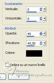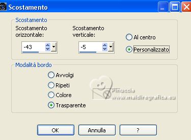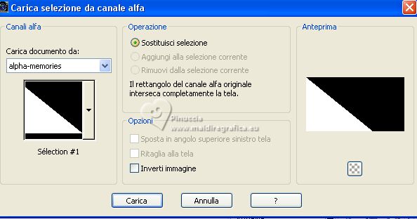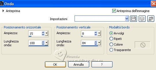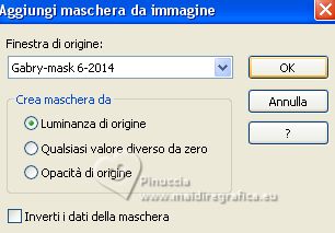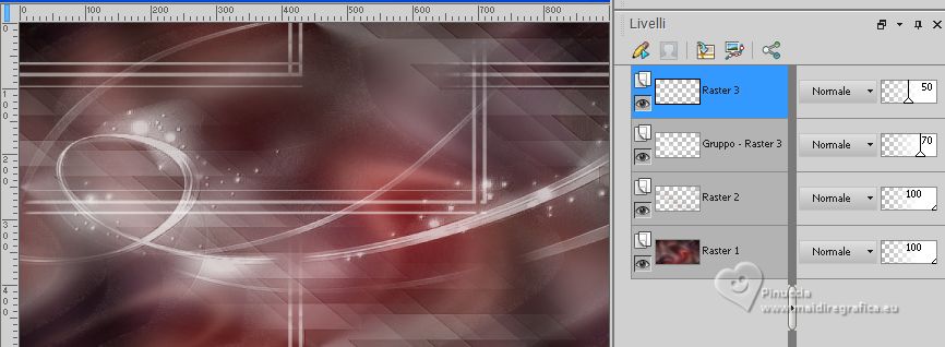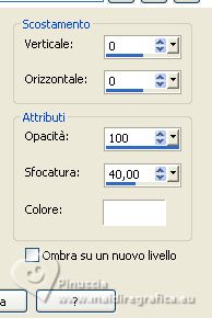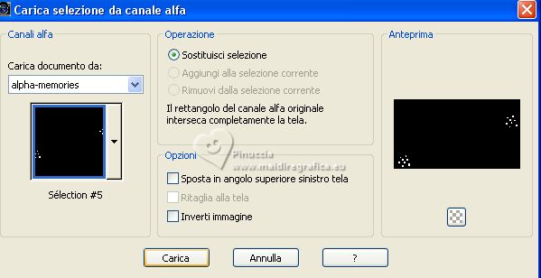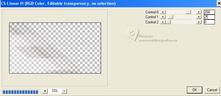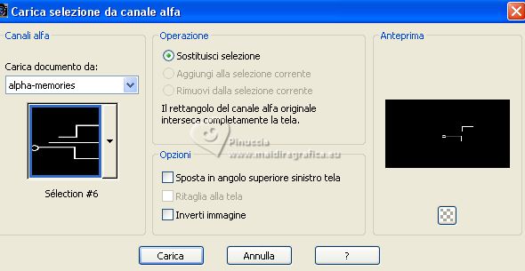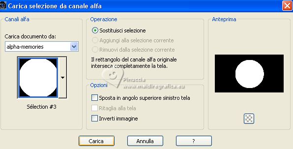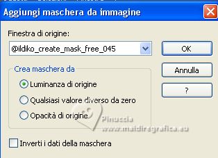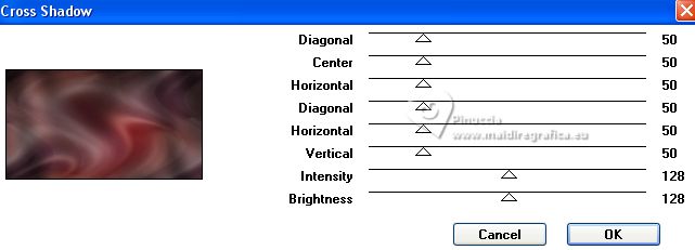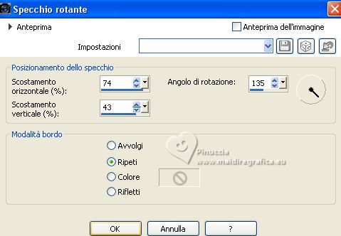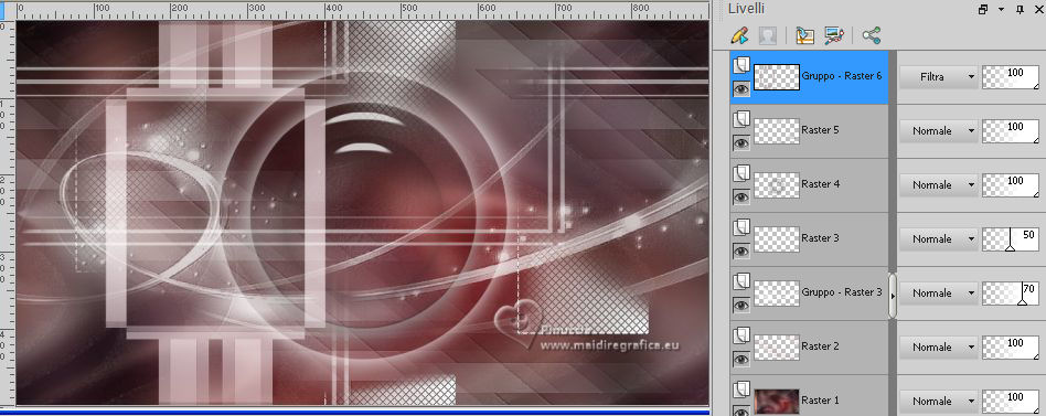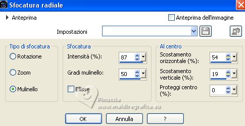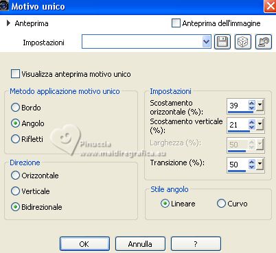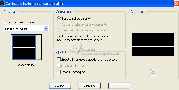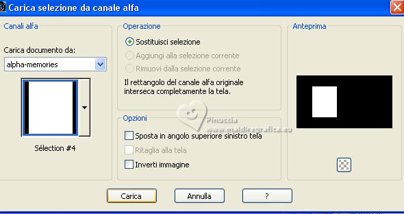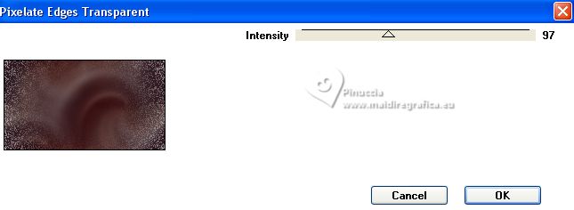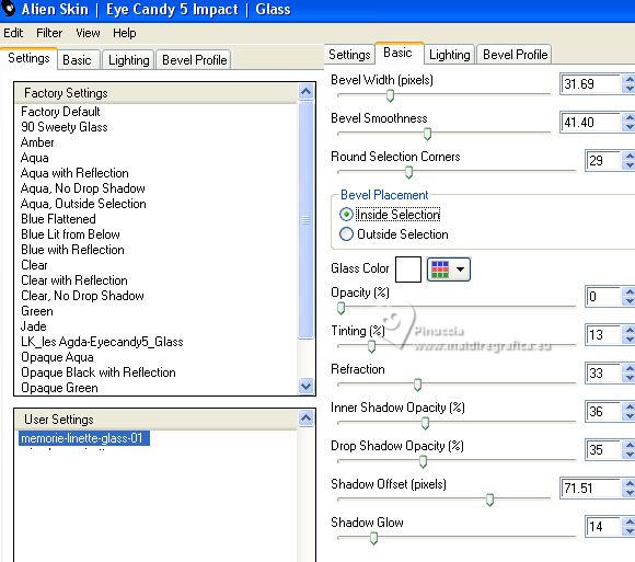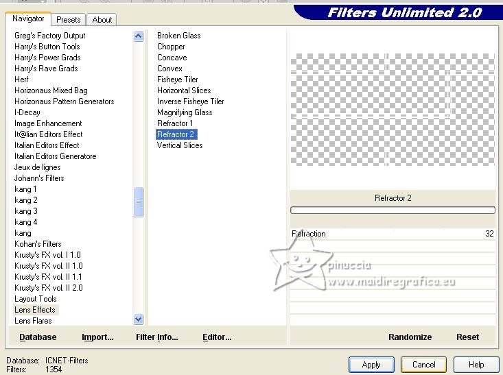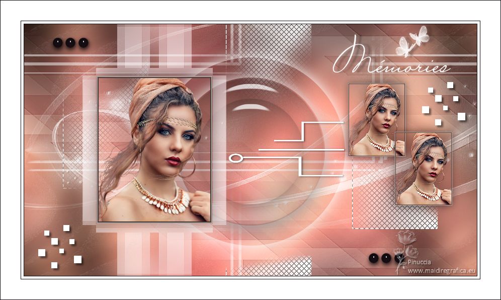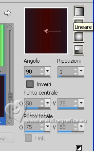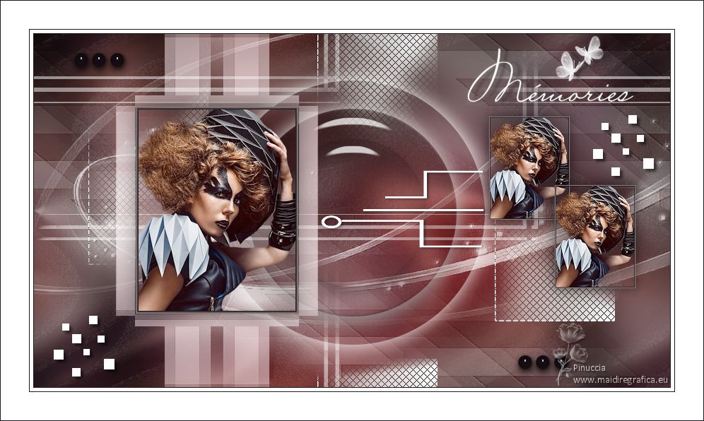 qui puoi trovare qualche risposta ai tuoi dubbi. Se l'argomento che ti interessa non è presente, ti prego di segnalarmelo. Questo tutorial è stato creato con PSPX8 e tradotto con PSPX7, ma può essere realizzato anche con le altre versioni di PSP. Dalla versione X4, il comando Immagine>Rifletti è stato sostituito con Immagine>Capovolgi in orizzontale, e il comando Immagine>Capovolgi con Immagine>Capovolgi in verticale. Nelle versioni X5 e X6, le funzioni sono state migliorate rendendo disponibile il menu Oggetti. Con la nuova versione X7, sono tornati Rifletti>Capovolgi, ma con nuove varianti. Vedi la scheda sull'argomento qui Le vostre versioniOccorrente: Materiale qui Per il tube e le maschere grazie AnaRidzi, Gabry e Ildiko. (in questa pagina trovi i links ai siti dei creatori del materiale usato nei tutorial) Filtri: se hai problemi con i filtri, consulta la mia sezione filtri qui Filters Unlimited 2.0 qui Media Sparkfilter - Pixelate Edge transparente qui Graphics Plus Cross Shadow qui Toadies - What are you qui Carolaine and Sensibility - CS-Linear-H qui Alien Skin Eye Candy 5 Impact - Glass qui I filtri Graphics Plus e Toadies si possono usare da soli o importati in Filters Unlimited (come fare vedi qui) Se un filtro fornito appare con questa icona ![]() non esitare a cambiare modalità di miscelatura e opacità secondo i colori utilizzati. Nelle ultime versioni di PSP non c'è il gradiente di primo piano/sfondo (Corel_06_029) Puoi usare i gradienti delle versioni precedenti. Trovi qui i gradienti Corel X. Metti il preset Cliccando sul file una o due volte (a seconda delle tue impostazioni), automaticamente il preset si installerà nella cartella corretta. perché uno o due clic vedi qui ![]() Metti il pennello nella cartella Pennelli. Attenzione, il pennello è composto da due files che non devono essere separati. Vedi gli appunti sui Pennelli qui Apri le maschere in PSP e minimizzale con il resto del materiale. Imposta il colore di primo piano con #251620, e il colore di sfondo con il colore #410703. ![]() Passa il colore di primo piano a Gradiente di primo piano/sfondo, stile Lineare. ![]() 1. Apri Canal Alpha-Memories. Finestra>Duplica, o sulla tastiera maiuscola+D, per fare una copia ![]() Chiudi l'originale. La copia, che sarà la base del tuo lavoro, non è vuota, ma contiene le selezioni salvate sul canale alfa. Riempi l'immagine trasparente con il gradiente.Livelli>Nuovo livello raster. Selezione>Seleziona tutto. Apri il tube della donna Ana Ridzi 1447 ![]() Modifica>Copia. Minimizza il tube. Torna al tuo lavoro e vai a Modifica>Incolla nella selezione. Selezione>Deseleziona. Effetti>Effetti di immagine>Motivo unico. ![]() Regola>Sfocatura>Sfocatura radiale. ![]() Effetti>Effetti di bordo>Aumenta. Regola>Sfocatura>Sfocatura gaussiana - raggio 10. ![]() Effetti>Effetti di immagine>Motivo unico, con i settaggi precedenti. ![]() Livelli>Unisci>Unisci giù. 2. Effetti>Plugins>Media Sparkfilter - Pixelate Edges Transparent. ![]() Effetti>Effetti di distorsione>Onda. ![]() Effetti>Plugins>Graphics Plus - Cross Shadow, con i settaggi standard. O adatta Intensity ai tuoi colori. ![]() 3. Imposta il colore di primo piano con il colore bianco #ffffff. Abbassa l'opacità dello strumento Riempimento al 30%. ![]() Livelli>Nuovo livello raster. Selezione>Carica/Salva selezione>Carica selezione da canale alfa. La selezione Sélection #1 è subito disponibile. Devi soltanto cliccare Carica. ![]() Riempi la selezione con il colore di primo piano.Selezione>Deseleziona. Effetti>Plugins>Toadies - What are you. ![]() Regola>Messa a fuoco>Accentua messa a fuoco. Effetti>Plugins>Carolaine and Sensibility - CS-Linear-H. ![]() Effetti>Effetti di immagine>Motivo unico, con i settaggi standard. ![]() Regola>Messa a fuoco>Accentua messa a fuoco. 4. Livelli>Nuovo livello raster. Riporta l'opacità dello strumento Riempimento a 100. Riempi il livello con il colore bianco.Livelli>Nuovo livello maschera>da immagine. Apri il menu sotto la finestra di origine e vedrai la lista dei files aperti. Seleziona la maschera Gabry-mask 6-2014 ![]() Livelli>Unisci>Unisci gruppo. Abbassa l'opacità di questo livello al 70%. 5. Livelli>Nuovo livello raster. Selezione>Carica/Salva selezione>Carica selezione da canale alfa. Apri il menu delle selezioni e carica la selezione sélection #2. ![]() Riempi la selezione con il colore bianco.Selezione>Deseleziona. Effetti>Effetti di riflesso>Specchio rotante. ![]() Effetti>Effetti di immagine>Motivo unico. ![]() Effetti>Plugins>Filters Unlimited 2.0 - Lens Effects - Refractor 2. ![]() Abbassa l'opacità di questo livello al 50%. ![]() 6. Livelli>Nuovo livello raster. Selezione>Carica/Salva selezione>Carica selezione da canale alfa. Apri il menu delle selezioni e carica la selezione sélection #3. ![]() Effetti>Effetti 3D>Sfalsa ombra, colore bianco. ![]() Selezione>Modifica>Contrai - 40 pixels. Effetti>Effetti 3D>Sfalsa ombra, con i settaggi precedenti. Effetti>Plugins>Alien Skin Eye Candy 5 Impact - Glass. Seleziona il preset memories-linette-glass-01 e ok. ![]() Selezione>Modifica>Contrai - 40 pixels. Ripeti Effetti>Plugins>Alien Skin Eye Candy 5 Impact - Glass - preset memories-linette-glass-01. Selezione>Deseleziona. 7. Apri il tube déco-01-mémories-linette ![]() Modifica>Copia. Torna al tuo lavoro e vai a Modifica>Incolla come nuovo livello. Non spostarlo, è al suo posto. 8. Livelli>Nuovo livello raster. Imposta il colore di sfondo con il colore #b1a2a5. ![]() Riempi il livello con il colore di sfondo.Livelli>Nuovo livello maschera>Da immagine. Apri il menu sotto la finsetra di origine e seleziona la maschera @ildiko_create_mask_free_045 ![]() Livelli>Unisci>Unisci gruppo. Cambia la modalità di miscelatura di questo livello in Filtra o secondo i tuoi colori. ![]() 9. Selezione>Carica/Salva selezione>Carica selezione da canale alfa. Apri il menu delle selezioni e carica la selezione sélection #4. ![]() Attiva nuovamente il tube Ana Ridzi 1447 Modifica>Copia. Torna