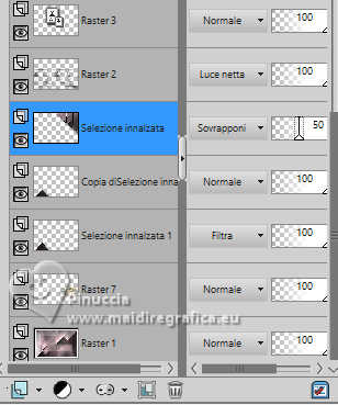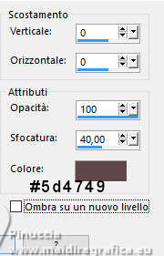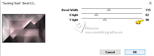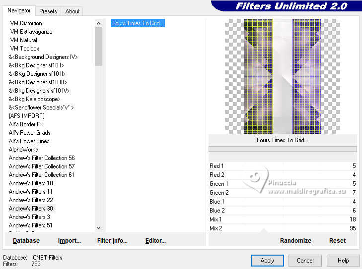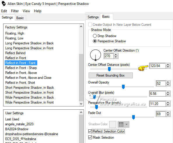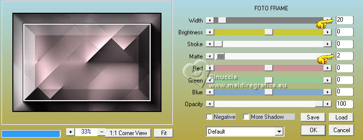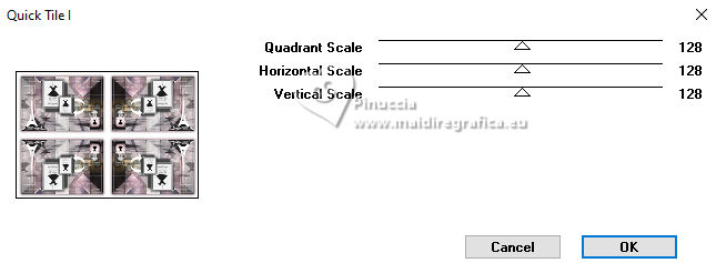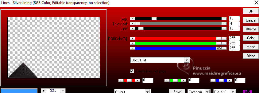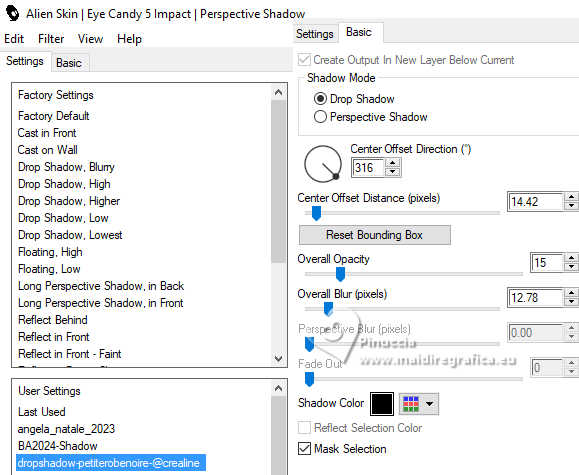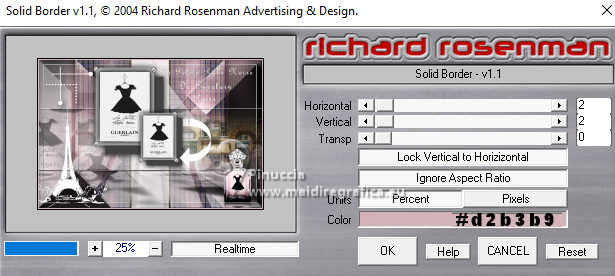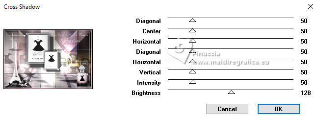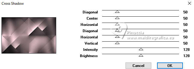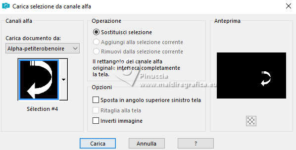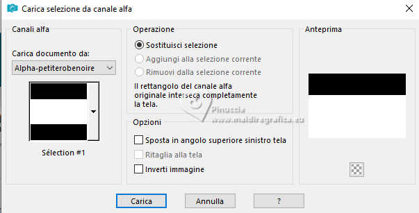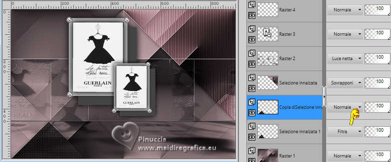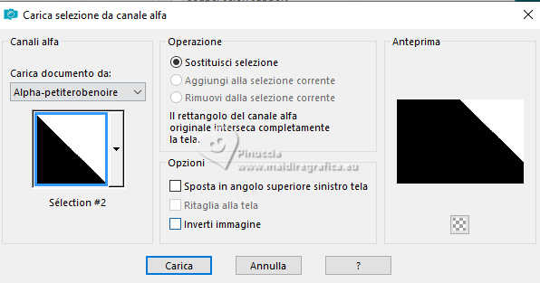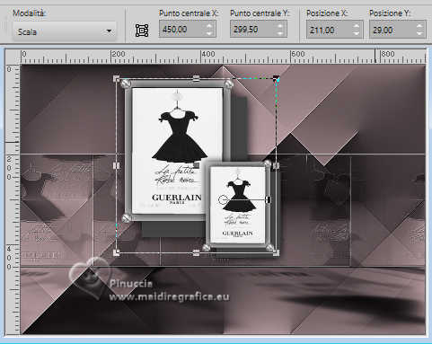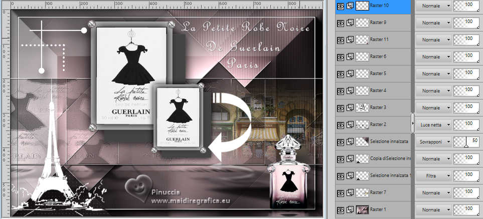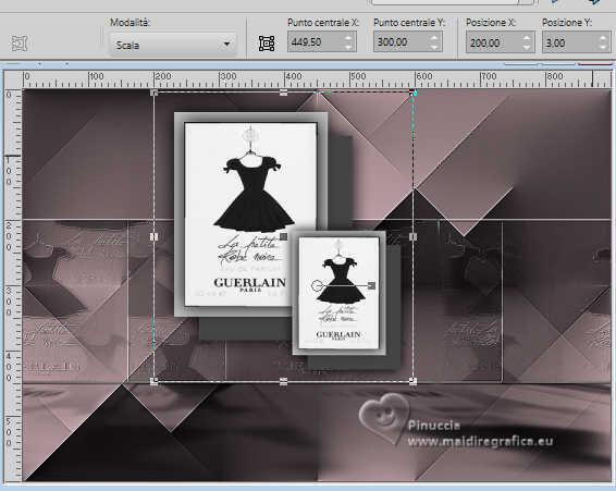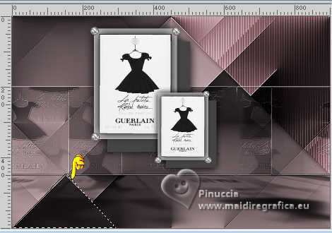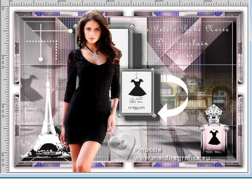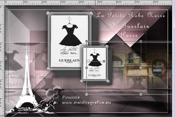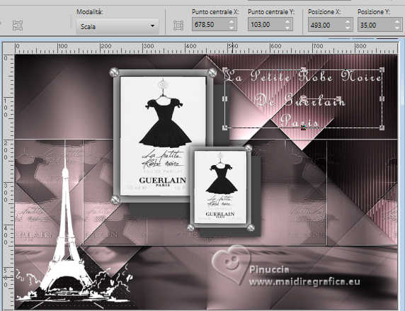qui puoi trovare qualche risposta ai tuoi dubbi. Se l'argomento che ti interessa non è presente, ti prego di segnalarmelo. Questo tutorial è stato creato con PSPX8 e tradotto con PSPX7, ma può essere realizzato anche con le altre versioni di PSP. Dalla versione X4, il comando Immagine>Rifletti è stato sostituito con Immagine>Capovolgi in orizzontale, e il comando Immagine>Capovolgi con Immagine>Capovolgi in verticale. Nelle versioni X5 e X6, le funzioni sono state migliorate rendendo disponibile il menu Oggetti. Con la nuova versione X7, sono tornati Rifletti>Capovolgi, ma con nuove varianti. Vedi la scheda sull'argomento qui Le vostre versioniOccorrente: Materiale qui Il materiale è di Crealine (in questa pagina trovi i links ai siti dei creatori del materiale usato nei tutorial) Filtri: se hai problemi con i filtri, consulta la mia sezione filtri qui Filters Unlimited 2.0 qui Graphics Plus - Cross Shadow, Quick Tile I qui Simple - Blintz qui Tramages - Tow the lines qui Rosenman - Solid Border qui Andrew's Filter 30 - Fours Times to Grid qui Alien Skin Eye Candy 5 Impact - Perspective Shadow qui AP 01 [Innovations] - Lines SilverLining qui I filtri Graphics Plus, Simple e Tramages si possono usare da soli o importati in Filters Unlimited (come fare vedi qui) Se un filtro fornito appare con questa icona ![]() non esitare a cambiare modalità di miscelatura e opacità secondo i colori utilizzati. Nelle ultime versioni di PSP non c'è il gradiente di primo piano/sfondo (Corel_06_029) Puoi usare i gradienti delle versioni precedenti. Trovi qui i gradienti Corel X. ![]() Apri la maschera in PSP e minimizzala con il resto del materiale. Imposta il colore di primo piano con #d2b3b9, e il colore di sfondo con il colore nero #000000. ![]() Passa il colore di primo piano a Gradiente di primo piano/sfondo, stile Radiale. ![]() 1. Apri Canal Alpha-petiterobe. Finestra>Duplica, o sulla tastiera maiuscola+D, per fare una copia ![]() Chiudi l'originale. La copia, che sarà la base del tuo lavoro, non è vuota, ma contiene le selezioni salvate sul canale alfa. Riempi l'immagine trasparente con il gradiente.2. Effetti>Effetti di immagine>Motivo unico. ![]() Effetti>Plugins>Simple - Blintz Questo effetto lavora senza finestra; risultato ![]() Ripeti Effetti>Effetti di immagine>Motivo unico, con i settaggi precedenti. ![]() Effetti>Effetti di bordo>Aumenta di più. 3. Livelli>Nuovo livello raster. Selezione>Carica/Salva selezione>Carica selezione da canale alfa. La selezione sélection #1 è subito disponibile. Devi soltanto cliccare Carica. ![]() Apri déco 1-petiterobenoir ![]() Modifica>Copia. Torna al tuo lavoro e vai a Modifica>Incolla nella selezione. Selezione>Deseleziona. Cambia la modalità di miscelatura di questo livello in Luce netta. Effetti>Effetti di bordo>Aumenta di più. 4. Apri déco2 petiterobenoire ![]() (O realizza tu stesso i tuoi piccoli quadri) Modifica>Copia. Torna al tuo lavoro e vai a Modifica>Incolla come nuovo livello. Attiva lo strumento Puntatore ![]() e imposta Posizione x: 200,00 e Posizione Y: 3,00. ![]() Apri déco vis ![]() Modifica>Copia. Torna al tuo lavoro e vai a Modifica>Incolla come nuovo livello. Strumento Puntatore ![]() Imposta Posizione X: 211,00 e Posizione Y: 29,00 ![]() 5. Attiva il livello di sfondo, Raster 1. Selezione>Carica/Salva selezione>Carica selezione da canale alfa. Apri il menu delle selezioni e carica la selezione sélection #2. ![]() Selezione>Innalza selezione a livello. Effetti>Plugins>Tramages - Two the line, con i settaggi standard. ![]() Selezione>Deseleziona. Cambia la modalità di miscelatura di questo livello in Sovrapponi. Effetti>Effetti 3D>Sfalsa ombra, colore nero. ![]() 6. Dovresti avere questo ![]() 7. Attiva nuovamente il livello inferiore, Raster 1. Attiva lo strumento Selezione a mano libera , con i seguenti settaggi:![]() Seleziona il piccolo triangolo in basso a sinistra. ![]() Selezione>Innalza selezione a livello. Selezione>Deseleziona. Regola>Messa a fuoco>Metti a fuoco. Effetit>Effetti 3D>Sfalsa ombra, con i settaggi precedenti. Effetti>Plugins>AP 01 Innovations - Lines SilverLining. ![]() Livelli>Duplica. Cambia la modalità di miscelatura del livello originale in Filtra. ![]() 8. Attiva ancora il livello di sfondo, Raster 1. Effetti>Plugins>Graphics Plus - Cross Shadow, con i settaggi standard. ![]() 9. Attiva il livello superiore. Apri il tube déco3-tourEffel-petiterobenoire ![]() Modifica>Copia. Torna al tuo lavoro e vai a Modifica>Incolla come nuovo livello. Spostalo nell'angolo in basso a sinistra.10. Apri il testo Titre-petiterobenoire ![]() Modifica>Copia. Torna al tuo lavoro e vai a Modifica>Incolla come nuovo livello. Attiva lo strumento Puntatore ![]() e imposta Posizione X: 493,00 e Posizione Y: 35,00. ![]() 11. Attiva il livello di sfondo, Raster 1. Apri il misted ruedeparis_misted_Crealine10.10.2023 ![]() Modifica>Copia. Torna al tuo lavoro e vai a Modifica>Incolla come nuovo livello. Immagine>Ridimensiona, al 70% (per il mio esempio ho ridimensionato al 65%), tutti i livelli non selezionato. Spostalo completamente a destraAbbassa l'opacità di questo livello al 63%. ![]() Regola>Messa a fuoco>Metti a fuoco. 12. Attiva il livello superiore. Apri il tube lapetiterobenoir_guerlain_crealine05122020 ![]() Modifica>Copia. Torna al tuo lavoro e vai a Modifica>Incolla come nuovo livello. Immagine>Ridimensiona, al 40%, tutti i livelli non selezionato. Spostalo in basso a destra.Effetti>Plugins>Alien Skin Eye Candy5 Impact - Perspective Shadow. Seleziona il preset Reflect in Front-Faint. ![]() 13. Livelli>Nuovo livello raster. Imposta il colore di primo piano con il colore bianco #ffffff. Selezione>Carica/Salva selezione>Carica selezione da canale alfa. Apri il menu delle selezioni e carica la selezione sélection #3. ![]() Riempi la selezione con il colore bianco.Selezione>Deseleziona. Regola>Messa a fuoco>Metti a fuoco. Effetti>Plugins>Alien Skin Eye Candy5 Impact - Perspective Shadow. Seleziona il preset Dr