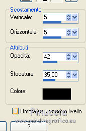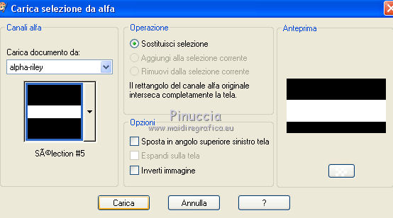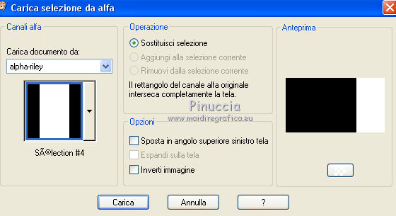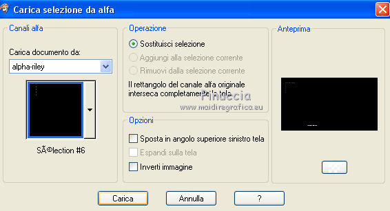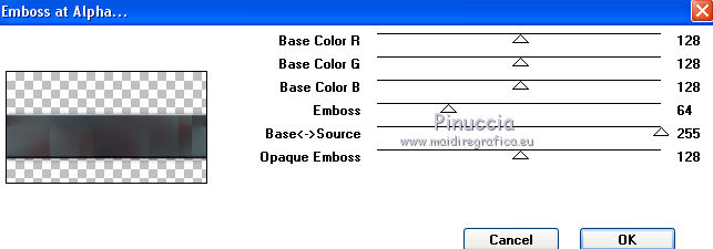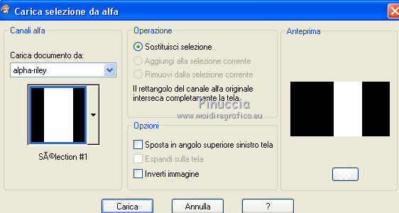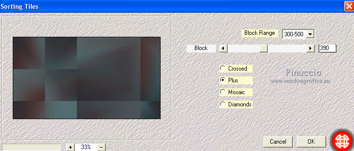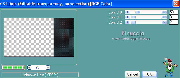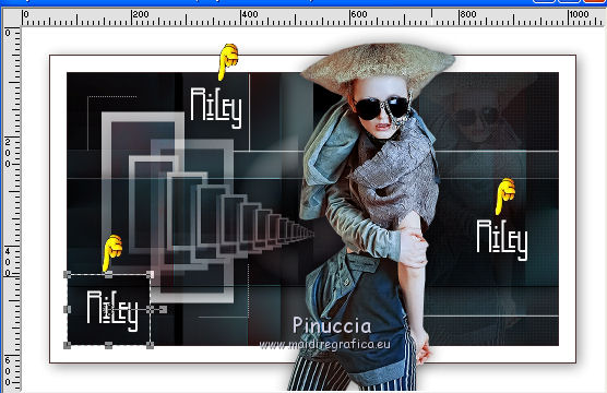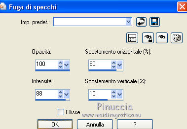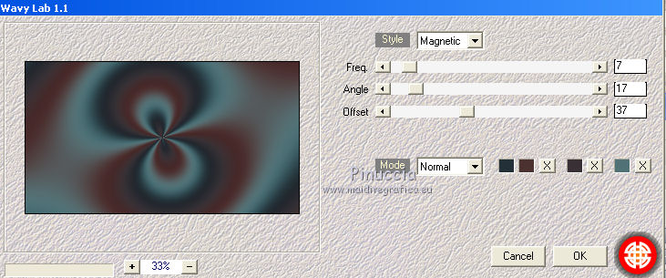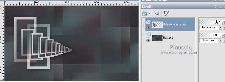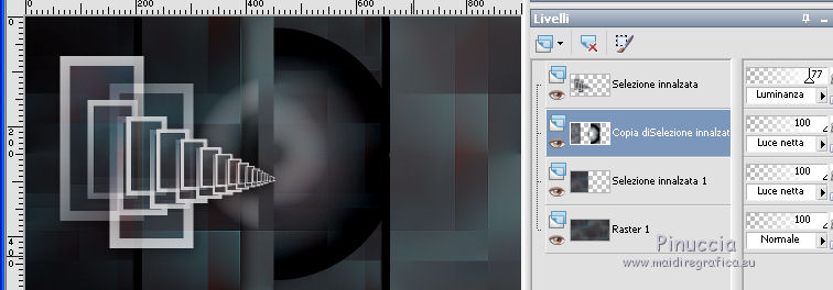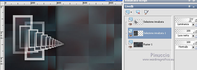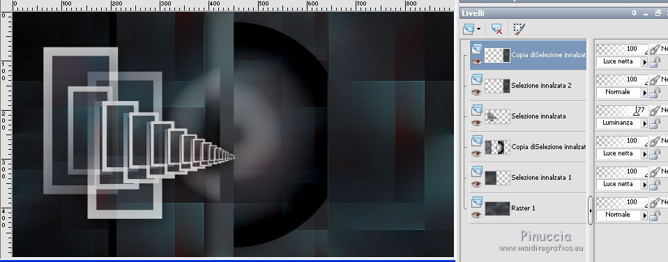 qui puoi trovare qualche risposta ai tuoi dubbi. Se l'argomento che ti interessa non è presente, ti prego di segnalarmelo. Questo tutorial è stato creato con PSP2020 e tradotto con PSPX, ma può essere realizzato anche con le altre versioni di PSP. Dalla versione X4, il comando Immagine>Rifletti è stato sostituito con Immagine>Capovolgi in orizzontale, e il comando Immagine>Capovolgi con Immagine>Capovolgi in verticale. Nelle versioni X5 e X6, le funzioni sono state migliorate rendendo disponibile il menu Oggetti. Con la nuova versione X7, sono tornati Rifletti>Capovolgi, ma con nuove varianti. Vedi la scheda sull'argomento qui Le vostre versioni Occorrente: Materiale qui Per il tube grazie Thafs. Il resto del materiale è di Crealine (in questa pagina trovi i links ai siti dei creatori di tubes) Filtri: se hai problemi con i filtri, consulta la mia sezione filtri qui Filters Unlimited 2.0 qui Mura's Seamless - Emboss at Alpha qui Transparency - Eliminate White qui Mehdi - Wavy Lab 1.1 qui Mehdi - Sorting Tiles qui Filter Factory Gallery C - Tile Mix qui Carolaine and Sensibility - CS-LDots qui I filtri Mura's Seamless, Transparency e Factory Gallery si possono usare da soli o importati in Filters Unlimited (come fare vedi qui) Se un filtro fornito appare con questa icona ![]() non esitare a cambiare modalità di miscelatura e opacità secondo i colori utilizzati. Se hai problemi con le selezioni salvate sul canale alfa, nel materiale trovi le relative selezioni da mettere nella cartella Selezioni. Colori utilizzati ![]() Imposta il colore di primo piano con #4c3131, e il colore di sfondo con il colore #243037. ![]() 1. Apri Alpha_selection. Finestra>Duplica, o sulla tastiera maiuscola+D, per fare una copia. ![]() Chiudi l'originale. La copia, che sarà la base del tuo lavoro non è vuota, ma contiene le selezioni salvate sul canale alfa. Effetti>Plugins>Mehdi - Wavy Lab 1.1. Questo filtro crea gradienti con i colori della paletta: il primo è il colore di sfondo, il secondo quello di primo piano. Degli ultimi due colori creati dal filtro, mantieni il terzo, e cambia il quarto colore con il colore 3 #507176. ![]() Regola>Sfocatura>Sfocatura gaussiana - raggio 50. ![]() Effetti>Plugins>Mehdi - Sorting Tiles. ![]() Effetti>Effetti di immagine>Motivo unico. ![]() Effetti>Effetti di bordo>Aumenta. 2. Selezione>Carica/Salva selezione>Carica selezione da canale alfa. La selezione #1 è subito disponibile. Devi soltanto cliccare Carica. ![]() Selezione>Innalza selezione a livello. Mantieni selezionato. Imposta il colore di sfondo con il colore bianco #ffffff. Livelli>Nuovo livello raster. Riempi con il colore bianco.Selezione>Modifica>Contrai - 30 pixels. Premi sulla tastiera il tasto CANC ![]() Selezione>Deseleziona. Livelli>Unisci>Unisci giù. Immagine>Ridimensiona, al 60%, tutti i livelli non selezionato. Effetti>Effetti di immagine>Motivo unico, Intermittente diagonale. ![]() Livelli>Duplica. Immagine>Ridimensiona, al 60%, tutti i livelli non selezionato. Effetti>Effetti di riflesso>Fuga di specchi. ![]() Livelli>Unisci>Unisci giù. Tasto K sulla tastiera per attivare lo strumento Puntatore ![]() e imposta Posizione X: 63,00 e Posizione Y: 72,00. ![]() Effetti>Effetti 3D>Sfalsa ombra, colore nero. ![]() Cambia la modalità di miscelatura di questo livello in Luminanza, e abbassa l'opacità al 77%. ![]() 3. Attiva il livello di sfondo, Raster 1. Selezione>Carica/Salva selezione>Carica selezione da canale alfa. Apri il menu delle selezioni e carica la selezione #2. ![]() Selezione>Innalza selezione a livello. Effetti>Effetti 3D>Sfalsa ombra, con i settaggi precedenti. Selezione>Deseleziona. Cambia la modalità di miscelatura di questo livello in Luce netta. ![]() 4. Rimani posizionato sul livello Selezione innalzata 1. Livelli>Duplica. Effetti>Plugins>Filters Unlimited 2.0 - Filter Factory Gallery C - Tile Mix. ![]() Effetti>Plugins>Transparence - Eliminate White Risultato ![]() 5. Attiva nuovamente il livello di sfondo, Raster 1. Selezione>Carica/Salva selezione>Carica selezione da canale alfa. Apri il menu delle selezioni e carica la selezione #4. ![]() Non preoccuparti: le selezioni 3 e 4 sono la stessa selezione; un errore al momento della registrazione Selezione>Innalza selezione a livello. Selezione>Deseleziona. Livelli>Disponi>Porta in alto. Livelli>Duplica. Cambia la modalità di miscelatura di questo livello in Luce netta. ![]() Livelli>Unisci>Unisci giù. Effetti>Plugins>Carolaine and Sensibility - CS-LDots ![]() 7. Attiva ancora il livello di sfondo, Raster 1. Selezione>Carica/Salva selezione>Carica selezione da canale alfa. Apri il menu delle selezioni e carica la selezione #5. ![]() Selezione>Innalza selezione a livello. Livelli>Disponi>Porta in alto. Cambia la modalità di miscelatura di questo livello in Luce netta. Effetti>Effetti 3D>Sfalsa ombra, con i settaggi precedenti. ![]() Selezione>Deseleziona. Effetti>Plugins>Mura's Seamless - Emboss at alpha, con i settaggi standard. ![]() 7. Apri il tube 198_2_by_aydan_kerimli_tubed_by_thafs e vai a Modifica>Copia. Torna al tuo lavoro e vai a Modifica>Incolla come nuovo livello. Immagine>Ridimensiona, al 70%, tutti i livelli non selezionato. Tasto K per attivare lo strumento Puntatore ![]() e imposta Posizione X: 605,00 e Posizione Y: -19,00. ![]() Abbassa l'opacità di questo livello al 12% (o secondo il tube utilizzato). Effetti>Effetti di bordo>Aumenta. Livelli>Disponi>Sposta giù. 8. Attiva il livello superiore. (nel materiale trovi il risultato di questo passaggio, ma prova comunque a usare questo strumento). Attiva lo strumento Penna , linea di stile Pieno, larghezza 2 pixels.![]() Imposta il colore di primo piano con il colore bianco #ffffff. Tieni premuto il tasto della maiuscola per avere delle linee ben diritte, e traccia delle linee come nell'esempio ![]() Livelli>Converti in livello raster. Se non riesci a usare questo strumento, apri il file deco_ligne_Riley_Linette e vai a Modifica>Copia. Torna al tuo lavoro e vai a