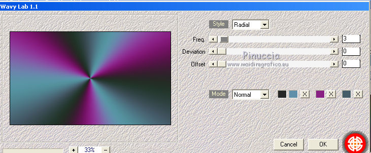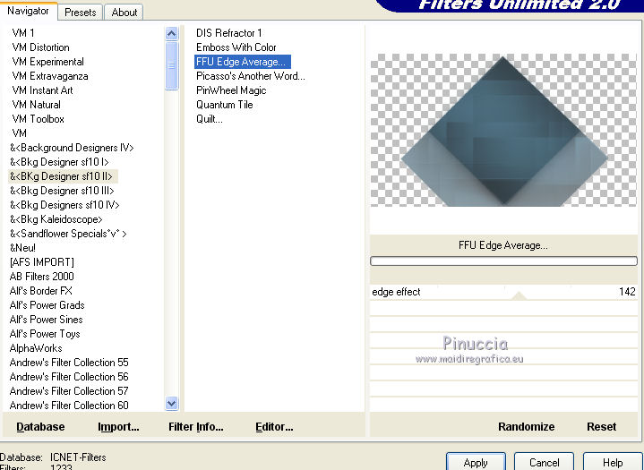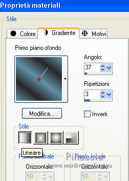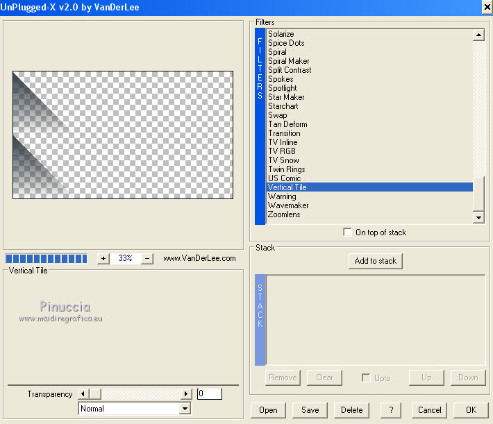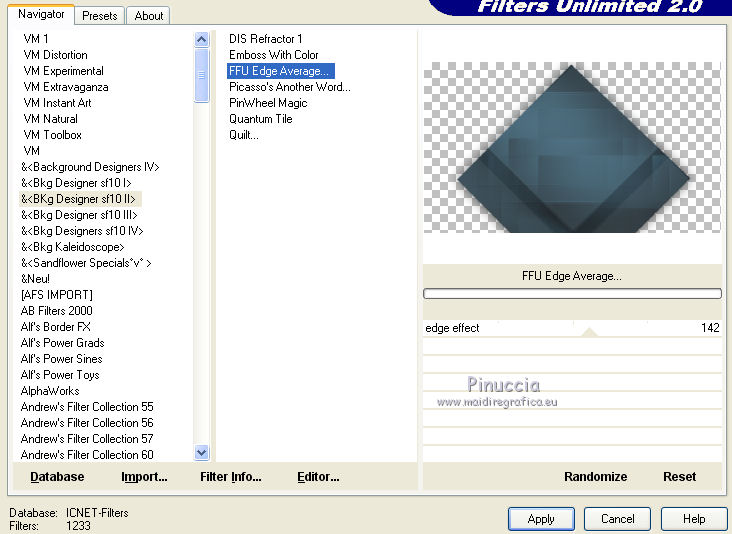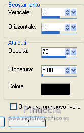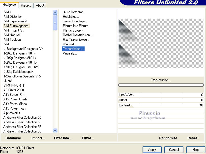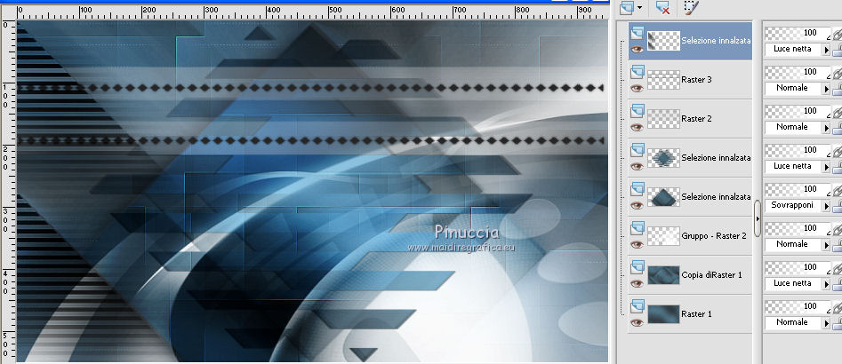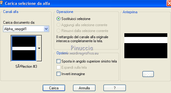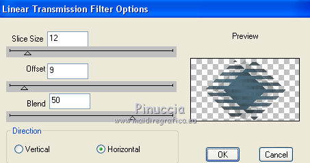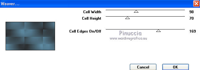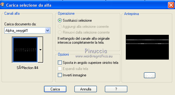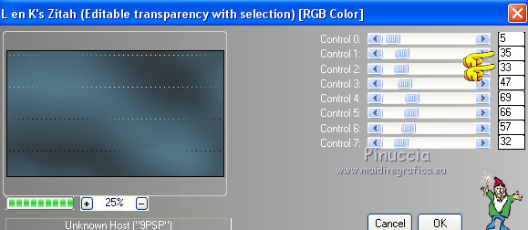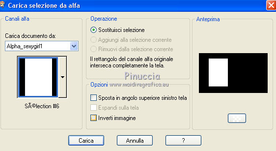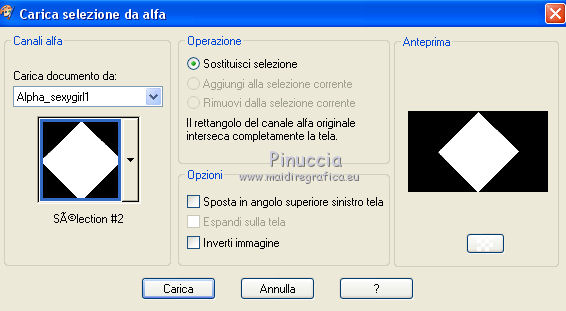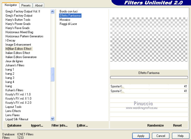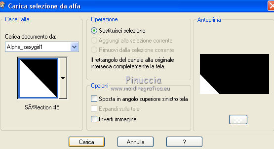 qui puoi trovare qualche risposta ai tuoi dubbi. Se l'argomento che ti interessa non è presente, ti prego di segnalarmelo. Questo tutorial è stato creato con PSP2020 e tradotto con PSP17, ma può essere realizzato anche con le altre versioni di PSP. Dalla versione X4, il comando Immagine>Rifletti è stato sostituito con Immagine>Capovolgi in orizzontale, e il comando Immagine>Capovolgi con Immagine>Capovolgi in verticale. Nelle versioni X5 e X6, le funzioni sono state migliorate rendendo disponibile il menu Oggetti. Con la nuova versione X7, sono tornati Rifletti>Capovolgi, ma con nuove varianti. Vedi la scheda sull'argomento qui Le vostre versioni Occorrente: Materiale qui Per i tubes e la maschera grazie Alies, Animabelle e Narah. (in questa pagina trovi i links ai siti dei creatori di tubes) Filtri: se hai problemi con i filtri, consulta la mia sezione filtri qui Filters Unlimited 2.0 qui Toadies - Weaver qui DSB Flux - Linear Transmission qui Simple - Blintz qui L&K's - L&K' Zitah qui &<Bkg Designer sf10II> - FFU Edge Average (da importare in Unlimited) qui Italian Editors - Effetto Fantasma qui VanDerLee - Unplugged-X qui VM Extravaganza - Transmission qui Mehdi - Wavy Lab 1.1 qui Alien Skin Eye Candy 5 Impact - Perspective Shadow qui I filtri Simple e Layout si possono usare da soli o importati in Filters Unlimited (come fare vedi qui) Se un filtro fornito appare con questa icona ![]() non esitare a cambiare modalità di miscelatura e opacità secondo i colori utilizzati. Nelle ultime versioni di PSP non c'è il gradiente di primo piano/sfondo (Corel_06_029) Puoi usare i gradienti delle versioni precedenti. Trovi qui i gradienti Corel X. Apri la maschera in PSP e minimizzala con il resto del materiale. 1. Imposta il colore di primo piano con #6090a9, e il colore di sfondo con #282727. ![]() Passa il colore di primo piano a Gradiente di primo piano/sfondo, stile Lineare. ![]() Apri Alpha_sexygirl. Finestra>Duplica, o sulla tastiera maiuscola+D, per fare una copia. Chiudi l'originale. La copia, che sarà la base del tuo lavoro non è vuota, ma contiene le selezioni salvate sul canale alfa. Riempi l'immagine trasparente con il gradiente.Effetti>Plugins>Toadies - Weaver. ![]() Effetti>Effetti di riflesso>Specchio rotante. ![]() Effetti>Effetti di immagine>Motivo unico - Intermittente diagonale. ![]() Effetti>Effetti di bordo>Aumenta di più. 2. Livelli>Duplica. Effetti>Plugins>Simple - Blintz. Modifica>Ripeti Blintz. Cambia la modalità di miscelatura di questo livello in Luce netta. Effetti>Effetti di immagine>Motivo unico, con i settaggi standard. ![]() Attiva il livello di sfondo. Regola>Sfocatura>Sfocatura gaussiana - raggio 50. ![]() 3. Rimani posizionato sul livello di sfondo. Selezione>Carica/Salva selezione>Carica selezione da canale alfa. La selezione sélection#1 è subito disponibile. Devi soltanto cliccare Carica. ![]() Selezione>Inverti. Effetti>Plugins>L&K's - L&K's Zitah ![]() Selezione>Inverti. Attiva il livello superiore. Selezione>Innalza selezione a livello. Cambia la modalità di miscelatura di questo livello in Sovrapponi. Selezione>Deseleziona. Effetti>Effetti 3D>Sfalsa ombra, colore nero. ![]() Effetti>Plugins>Filters Unlimited 2.0 - &< Bkg Designer sf10II> - FFU Edge Average. ![]() attenzione, potresti avere un risultato leggermente differente, che potrà anche influire sui prossimi passaggi, secondo la versione di Unlimited che stai usando. Questa la finestra usando la versione di Unlimited composta da files in formato 8bf. ![]() 4. Rimani posizionato sul livello superiore. Selezione>Carica/Salva selezione>Carica selezione da canale alfa. Apri il menu delle selezioni e carica la selezione #2. ![]() Selezione>Innalza selezione a livello. Selezione>Deseleziona. Cambia la modalità di miscelatura di questo livello in Luce netta. Effetti>Plugins>DSB Flux - Linear Transmission. ![]() Effetti>Effetti 3D>Sfalsa ombra. ![]() 5. Attiva il livello copia di Raster 1 (il secondo livello dal basso). ![]() Livelli>Nuovo livello raster. Imposta il colore di sfondo con il colore bianco #ffffff. Riempi il livello con il colore bianco.Livelli>Nuovo livello maschera>Da immagine. Apri il menu sotto la finestra di origine e vedrai la lista dei files aperti. Seleziona la maschera Narah_Mask_0626. ![]() Livelli>Unisci>Unisci gruppo. Livelli>Duplica. Livelli>Unisci>Unisci giù. 6. Attiva il livello superiore. Livelli>Nuovo livello raster. Abbassa l'opacità dello strumento Riempimento al 50%. Selezione>Carica/Salva selezione>Carica selezione da canale alfa. Apri il menu delle selezioni e carica la selezione #3. ![]() Riempi la selezione con il colore bianco di sfondo.Selezione>Deseleziona. Effetti>Plugins>Filters Unlimited 2.0 - Italian Editor Effect - Effetto Fantasma. ![]() Ripeti l'Effetto Fantasma una seconda volta. 7. Livelli>Nuovo livello raster. Selezione>Carica/Salva selezione>Carica selezione da canale alfa. Apri il menu delle selezioni e carica la selezione #4. ![]() Imposta nuovamente il colore di sfondo con il colore iniziale Riporta l'opacità dello strumento Riempimento a 100. Riempi la selezione con il colore di sfondo.Selezione>Deseleziona. Effetti>Effetti 3D>Sfalsa ombra, colore nero. ![]() 8. Attiva nuovamente il livello Copia di Raster 1 (il secondo dal basso). ![]() Selezione>Carica/Salva selezione>Carica selezione da canale alfa. Apri il menu delle selezioni e carica la selezione #5. ![]() Selezione>Innalza selezione a livello. Selezione>Deseleziona. Cambia la modalità di miscelatura di questo livello in Luce netta. Livelli>Disponi>Porta in alto. Effetti>Plugins>VanDerLee - Unplugged-X - Vertical Tile. ![]() Effetti>Plugins>Alien Skin Eye Candy 5 Impact - Perspective Shadow. Seleziona il preset Drop Shadow Blurry e ok. ![]() Effetti>Plugins>Filters Unlimited 2.0 - VM Extravaganza - Transmission. ![]() Regola>Messa a fuoco>Accentua messa a fuoco. 9. Dovresti avere questo. ![]() 10. Imposta nuovamente il colore di sfondo con il colore bianco #ffffff. Livelli>Nuov