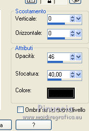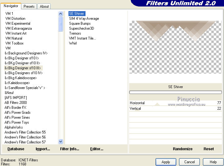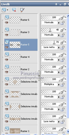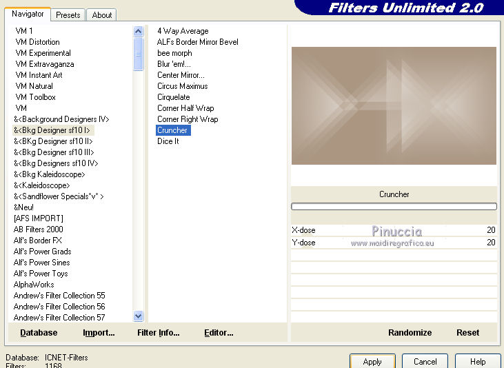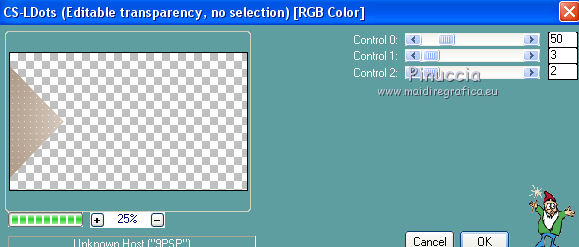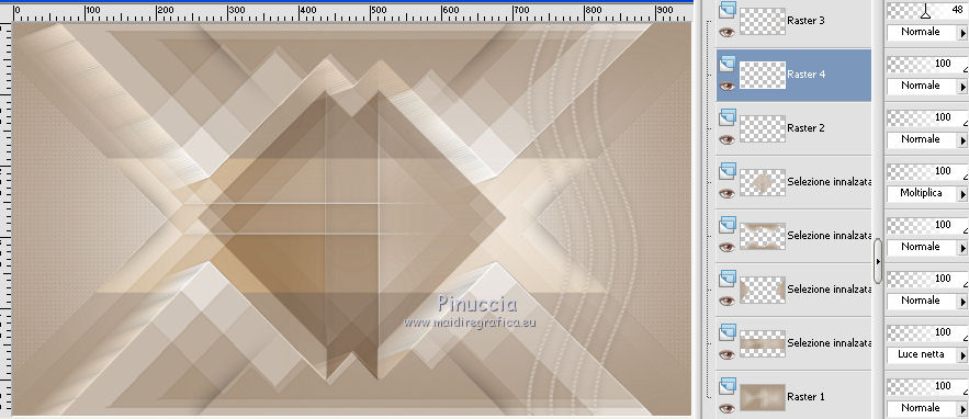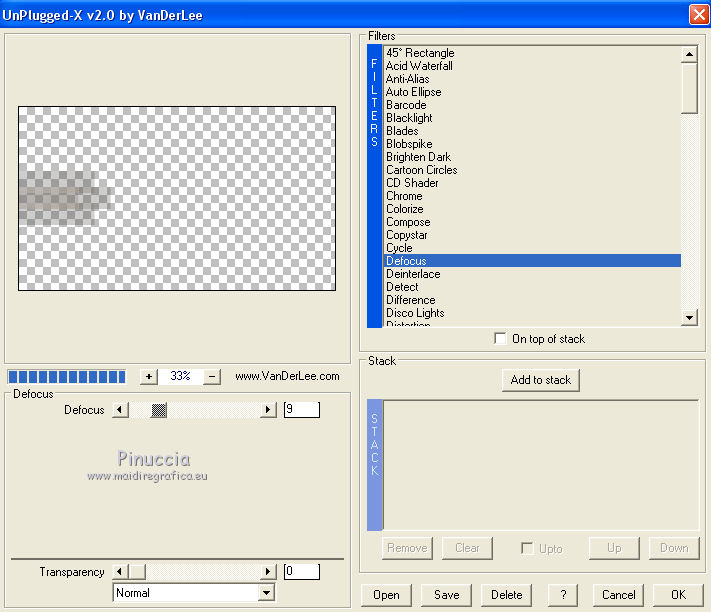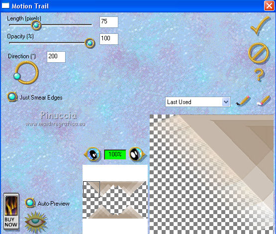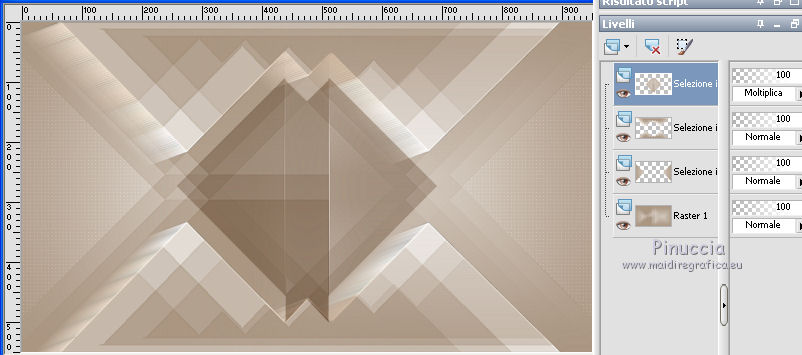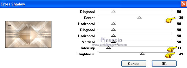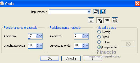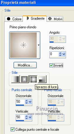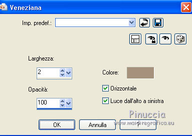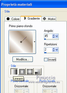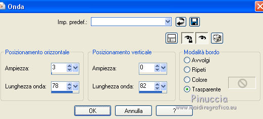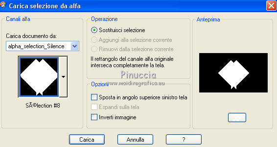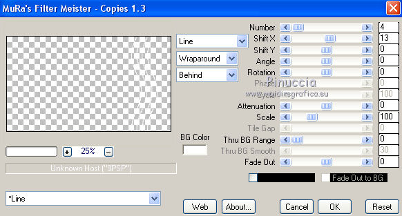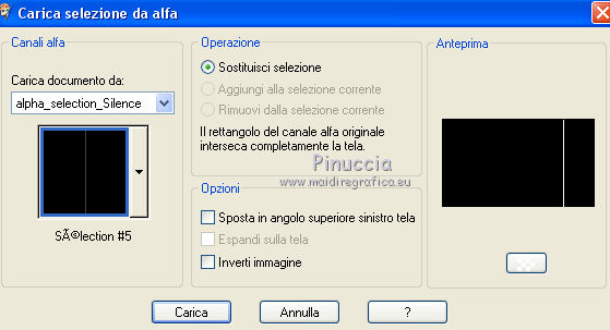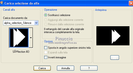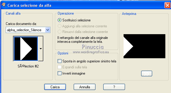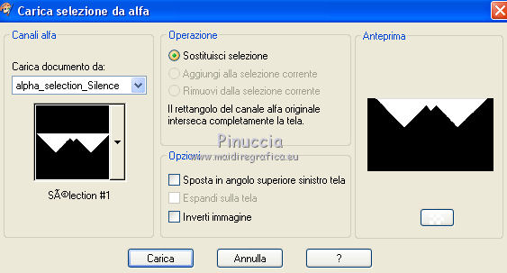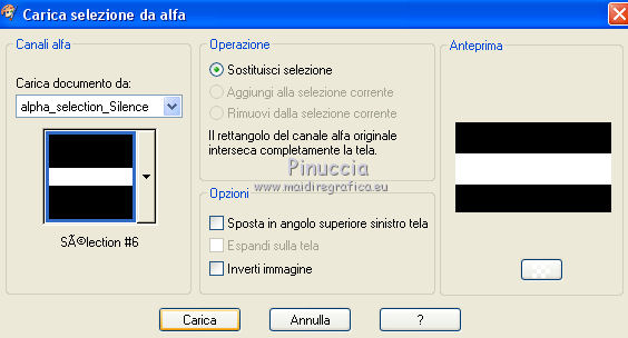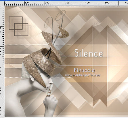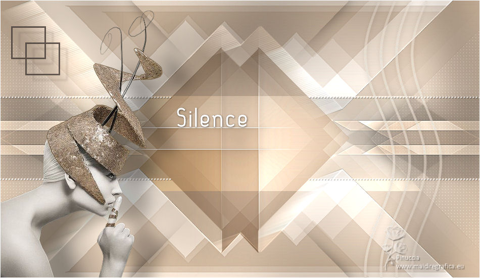 qui puoi trovare qualche risposta ai tuoi dubbi. Se l'argomento che ti interessa non è presente, ti prego di segnalarmelo. Questo tutorial è stato creato con PSP2019 e tradotto con PSPX, ma può essere realizzato anche con le altre versioni di PSP. Dalla versione X4, il comando Immagine>Rifletti è stato sostituito con Immagine>Capovolgi in orizzontale, e il comando Immagine>Capovolgi con Immagine>Capovolgi in verticale. Nelle versioni X5 e X6, le funzioni sono state migliorate rendendo disponibile il menu Oggetti. Con la nuova versione X7, sono tornati Rifletti>Capovolgi, ma con nuove varianti. Vedi la scheda sull'argomento qui Le vostre versioniOccorrente: Materiale qui Grazie Yoka per il tube. Il resto del materiale è di Crealine. (in questa pagina trovi i links ai siti dei creatori del materiale usato nei tutorial) Filtri: se hai problemi con i filtri, consulta la mia sezione filtri qui Filters Unlimited 2.0 qui &<Bkg Designer sf10I> - Cruncher (da importare in Unlimited) qui &<Bkg Designer sf10III> - SE Shiver (da importare in Unlimited) qui Graphics Plus - Cross Shadow qui Simple - Pizza Slice Mirror qui Eye Candy 3.1 - Motion Trail qui Carolaine and Sensibility - CS-LDots qui Mura's Meister - Copies qui VanDerLee - Unplugged-X qui I filtri Graphics Plus e Simple si possono usare da soli o importati in Filters Unlimited (come fare vedi qui) Se un filtro fornito appare con questa icona ![]() non esitare a cambiare modalità di miscelatura e opacità secondo i colori utilizzati. Nelle ultime versioni di PSP non c'è il gradiente di primo piano/sfondo (Corel_06_029) Puoi usare i gradienti delle versioni precedenti. Trovi qui i gradienti Corel X. ![]() Metti il pennello nella cartella Pennelli. Attenzione, il pennello è composto da due files che non devono essere separati. Vedi gli appunti sui pennelli qui Imposta il colore di primo piano con #a6917c, e il colore di sfondo con #ffffff. ![]() Passa il colore di primo piano a Gradiente di primo piano/sfondo, stile Sprazzo di luce. ![]() 1. Apri alpha_Silence. Finestra>Duplica o sulla tastiera maiuscola+D per fare una copia. ![]() Chiudi l'originale. La copia, che sarà la base del tuo lavoro, non è vuota, ma contiene le selezioni salvate sul canale alfa. Riempi l'immagine trasparente con il gradiente.2. Regola>Sfocatura>Sfocatura gaussiana - raggio 30. ![]() 3. Effetti>Plugins>Simple - Pizza Slice Mirror. Modifica>Ripeti Pizza Slice Mirror. 4. Effetti>Plugins>Filters Unlimited 2.0 - &<Bkg Designer sf10I> - Cruncher, con i settaggi standard. ![]() 5. Regola>Messa a fuoco>Accentua messa a fuoco. 6. Selezione>Carica/Salva selezione>Carica selezione da canale alfa. La selezione #1 è subito disponibile. Devi soltanto cliccare Carica. ![]() Selezione>Innalza selezione a livello. Selezione>Deseleziona. 7. Effetti>Plugins>Filters Unlimited 2.0 - &<Bkg Designer sfo10III> - SE Shiver. ![]() 8. Regola>Messa a fuoco>Accentua messa a fuoco. 9. Livelli>Duplica. Immagine>Capovolgi. Livelli>Unisci>Unisci giù. 10. Effetti>Plugins>Eye Candy 3.1. - Motion Trail. ![]() 11. Attiva il livello Raster 1. Selezione>Carica/Salva selezione>Carica selezione da canale alfa. Apri il menu delle selezioni e carica la selezione #2. ![]() Selezione>Innalza selezione a livello. Selezione>Deseleziona. 12. Effetti>Plugins>Carolaine and Sensibility - CS-LDots, con i settaggi standard. ![]() 13. Livelli>Duplica. Immagine>Rifletti. Livelli>Unisci>Unisci giù. 14. Attiva nuovamente il livello Raster 1. Selezione>Carica/Salva selezione>Carica selezione da canale alfa. Apri il menu delle selezioni e carica la selezione #3. ![]() Selezione>Innalza selezione a livello. Selezione>Deseleziona. Livelli>Disponi>Porta in alto. 15. Livelli>Duplica. Immagine>Rifletti. Livelli>Unisci>Unisci giù. Cambia la modalità di miscelatura di questo livello in Moltiplica. ![]() 16. Livelli>Nuovo livello raster. Selezione>Carica/Salva selezione>Carica selezione da canale alfa. Apri il menu delle selezioni e carica la selezione #4. ![]() 17. Riempi la selezione con il colore bianco di sfondo #ffffff (tasto destro).(ingrandisci se necessario, per vedere meglio).Selezione>Deseleziona. 18. Effetti>Effetti 3D>Sfalsa ombra, colore nero. ![]() Regola>Messa a fuoco>Metti a fuoco. 19. Effetti>Effetti di distorsione>Vento - da sinistra, intensità 100. ![]() 20. Livelli>Nuovolivello raster. Selezione>Carica/Salva selezione>Carica selezione da canale alfa. Apri il menu delle selezioni e carica la selezione #5. ![]() Riempi la selezione con il colore bianco di sfondo #ffffff (tasto destro).Selezione>Deseleziona. 21. Effetti>Effetti di distorsione>Onda. ![]() 22. Effetti>Plugins>Mura's Meister - Copies. ![]() 23. Effetti>Effetti 3D>Sfalsa ombra, con i settaggi precedenti. Abbassa l'opacità di questo livello al 48%. 24. Effetti>Effetti di trama>Veneziana. ![]() 25. Attiva ancora il livello inferiore, Raster 1. Selezione>Carica/Salva selezione>Carica selezione da canale alfa. Apri il menu delle selezioni e carica la selezione #6. ![]() Selezione>Innalza selezione a livello. Selezione>Deseleziona. Cambia la modalità di miscelatura di questo livello in Luce netta. 26. Attiva il livello superiore. Apri il tube déco_Silence_1 e vai a Modifica>Copia. Torna al tuo lavoro e vai a Modifica>Incolla come nuovo livello. Livelli>Disponi>Sposta giù. ![]() 27. Rimani posizionato sul livello Raster 4 (Déco_silence_1). Livelli>Nuovo livello raster. Cambia i settaggi del gradiente, stile Lineare. ![]() 28. Selezione>Carica/Salva selezione>Carica selezione da canale alfa. Apri il menu delle selezioni e carica la selezione #7. ![]() Riempi la selezione con il gradiente.29. Regola>Sfocatura>Sfocatura gaussiana - raggio 30. ![]() Selezione>Deseleziona. 30. Effetti>Plugins>VanDerLee - Unplugged-X - Defocus ![]() 31. Cambia la modalità di miscelatura di questo livello in Luce netta. 32. Livelli>Duplica. Immagine>Rifletti. Livelli>Unisci>Unisci giù. 33. Effetti>Effetti di distorsione>Onda. ![]() 34. Regola>Messa a fuoco>Acc