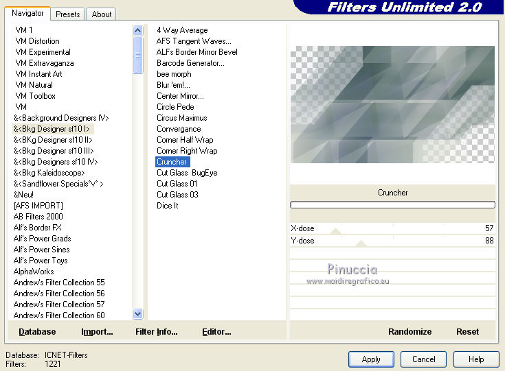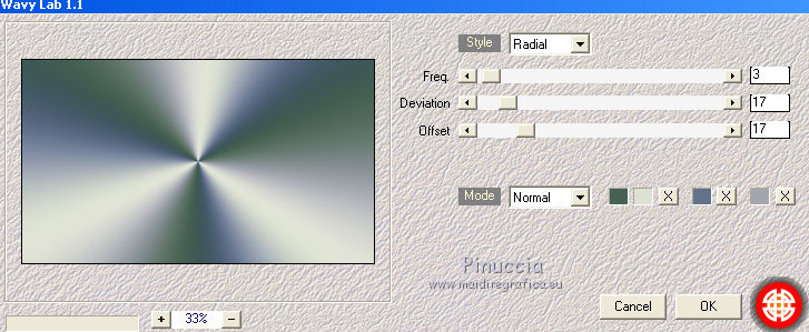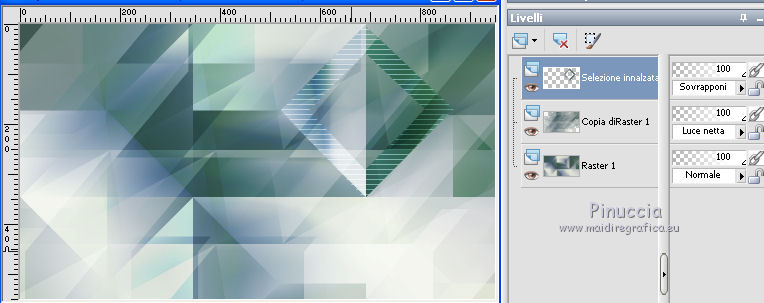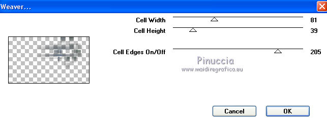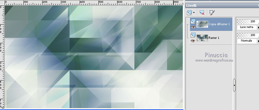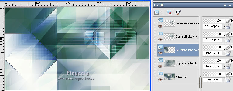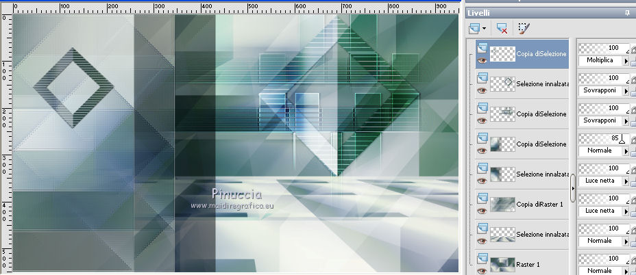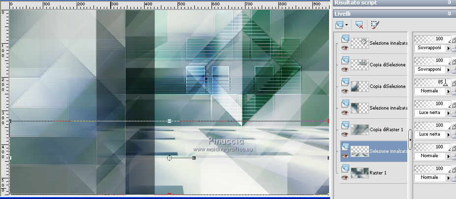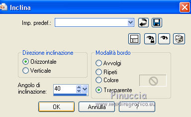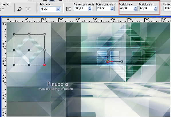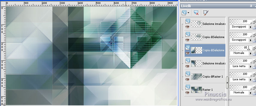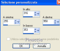 qui puoi trovare qualche risposta ai tuoi dubbi. Se l'argomento che ti interessa non è presente, ti prego di segnalarmelo. Questo tutorial è stato creato con PSP2020 e tradotto con PSPX, ma può essere realizzato anche con le altre versioni di PSP. Dalla versione X4, il comando Immagine>Rifletti è stato sostituito con Immagine>Capovolgi in orizzontale, e il comando Immagine>Capovolgi con Immagine>Capovolgi in verticale. Nelle versioni X5 e X6, le funzioni sono state migliorate rendendo disponibile il menu Oggetti. Con la nuova versione X7, sono tornati Rifletti>Capovolgi, ma con nuove varianti. Vedi la scheda sull'argomento qui Le vostre versioni Occorrente: Materiale qui Per i tubes e la maschera grazie Syl e Narah. (in questa pagina trovi i links ai siti dei creatori di tubes) Filtri: se hai problemi con i filtri, consulta la mia sezione filtri qui Filters Unlimited 2.0 qui Mehdi - Wavy Lab 1.1. qui Mehdi - Sorting Tiles qui &<Bkg Designer sf10I> - Cruncher (da importare in Unlimited) qui &<Bkg Designer sf10II> - DIS Refractor 1 (da importare in Unlimited) qui Toadies - Weaver qui Ap Innovations - Lines SilverLining qui VanDerLee - Unplugged-X qui Graphics Plus - Cross Shadow qui Mura's Meister - Perspective Tiling qui Alien Skin Eye Candy 5 Impact - Glass, Perspective Shadow qui I filtri Toadies e Graphics Plus si possono usare da soli o importati in Filters Unlimited (come fare vedi qui) Se un filtro fornito appare con questa icona ![]() non esitare a cambiare modalità di miscelatura e opacità secondo i colori utilizzati. Apri la maschera in PSP e minimizzala con il resto del materiale. 1. Imposta il colore di primo piano con il colore 1 #dce1d2, e il colore di sfondo con il colore 2 #476253. ![]() scegli quattro colori dal tuo tube se stai utilizzando altri colori 2. Apri Alpha_selection. Finestra>Duplica, o sulla tastiera maiuscola+D, per fare una copia. Chiudi l'originale. La copia, che sarà la base del tuo lavoro non è vuota, ma contiene le selezioni salvate sul canale alfa. Effetti>Plugins>Mehdi - Wavy Lab 1.1. Questo filtro crea gradienti con i colori della paletta: il primo è il colore di sfondo, il secondo quello di primo piano; cambia gli ultimi due colori creati dal filtro: il terzo con il colore 3 #64738c e il quarto con il colore 4 #a2a7ad ![]() Effetti>Plugins>Mehdi - Sorting Tiles ![]() Ripeti Effetti>Plugins>Mehdi - Sorting Tiles, Crossed selezionato ![]() 3. Livelli>Duplica. Effetti>Effetti geometrici>Inclina. ![]() Effetti>Plugins>Filters Unlimited 2.0 - &<Bkg Designer sf10I> - Cruncher. ![]() Cambia la modalità di miscelatura di questo livello in Luce netta, o secondo i tuoi colori, e adatta l'opacità se necessario. ![]() 4. Attiva il livello di sfondo. Selezione>Carica/Salva selezione>Carica selezione da canale alfa. La selezione sélection#1 è subito disponibile. Devi soltanto cliccare Carica. ![]() Selezione>Innalza selezione a livello. Livelli>Disponi>Porta in alto. Selezione>Modifica>Contrai - 40 pixels. Premi sulla tastiera il tasto CANC ![]() Selezione>Deseleziona. Effetti>Plugins>AP Lines - Lines SilverLining. ![]() Cambia la modalità di miscelatura di questo livello in Sovrapponi, o secondo i tuoi colori. ![]() Effetti>Effetti 3D>Sfalsa ombra. ![]() 5. Livelli>Duplica. Effetti>Plugins>Toadies - Weaver. ![]() Effetti>Effetti di bordo>Aumenta di più. Livelli>Disponi>Sposta giù. Livelli>Duplica. Livelli>Unisci>Unisci giù. 6. Attiva il livello inferiore. Selezione>Carica/Salva selezione>Carica selezione da canale alfa. Apri il menu delle selezioni e carica la selezione #2. ![]() Selezione>Innalza selezione a livello. Selezione>Deseleziona. Livelli>Disponi>Sposta su. Effetti>Plugins>Filters Unlimited 2.0 - &<Bkg Designer sf10II> - DIS Refractor 1. ![]() Effetti>Effetti di bordo>Aumenta. Cambia la modalità di miscelatura di questo livello in Luce netta, o secondo i tuoi colori. ![]() Effetti>Plugins>VanDerLee - Unplugged-X - Defocus ![]() Livelli>Duplica. Immagine>Capovolgi. Riporta la modalità di miscelatura di questo livello a Normale, e abbassa l'opacità all'85%. ![]() 7. Attiva il livello di sfondo. Selezione>Carica/Salva selezione>Carica selezione da canale alfa. Apri il menu delle selezioni e carica la selezione #3. ![]() Selezione>Innalza selezione a livello. Selezione>Deseleziona. Effetti>Plugins>Mura's Meister - Perspective Tiling. ![]() Attiva lo strumento Selezione ![]() (non importa il tipo di selezione impostato, perchè con la selezione personalizzata si ottiene sempre un rettangolo) clicca sull'icona Selezione personalizzata ![]() e imposta i seguenti settaggi. ![]() Premi sulla tastiera il tasto CANC ![]() Selezione>Deseleziona. 8. Dovresti avere questo ![]() 9. Attiva il livello superiore (selezione innalzata). Livelli>Duplica. Immagine>Ridimensiona, al 50%, tutti i livelli non selezionato. Premi sulla tastiera il tasto K per attivare lo strumento Puntatore ![]() e imposta Posizione X: 40,00 e Posizione Y: 69,00. ![]() Cambia la modalità di miscelatura di questo livello in Moltiplica. ![]() Effetti>Effetti 3D>Sfalsa ombra, con i settaggi precedenti. 10. Attiva il livello inferiore. Apri il tube SvB 1051 Beauty, cancella la firma e vai a Modifica>Copia. Torna al tuo lavoro e vai a Modifica>Incolla come nuovo livello. se usi un tuo tube, deve misurare 555 pixels di altezza Sposta il tube a sinistra,o attiva lo strumento Puntatore ![]() e imposta Posizione X: 200,00 e Posizione Y: -3,00 ![]() Abbassa l'opacità di questo livello al 48%. ![]() 11. Imposta il colore di primo piano con il colore 3 #64738c. Attiva il livello superiore. Livelli>Nuovo livello raster. Riempi il livello con il colore di primo piano.Livelli>Nuovo livello maschera>Da immagine. Apri il menu sotto la finestra di origine e vedrai la lista dei files aperti. Seleziona la maschera Narah_mask_0609 ![]() Livelli>Unisci>Unisci gruppo. Regola>Messa a fuoco>Accentua messa a fuoco. Livelli>Disponi>Sposta giù. Rimani posizionato sul livello della maschera. Attiva lo st