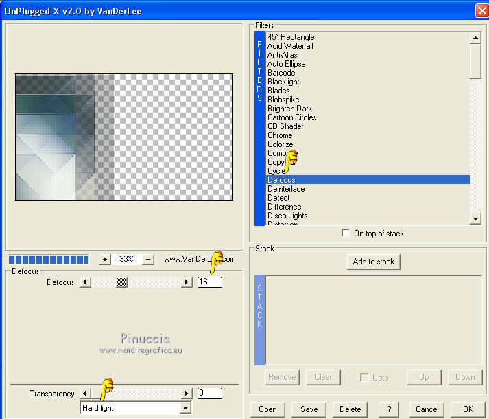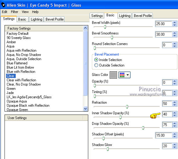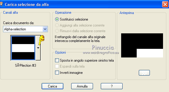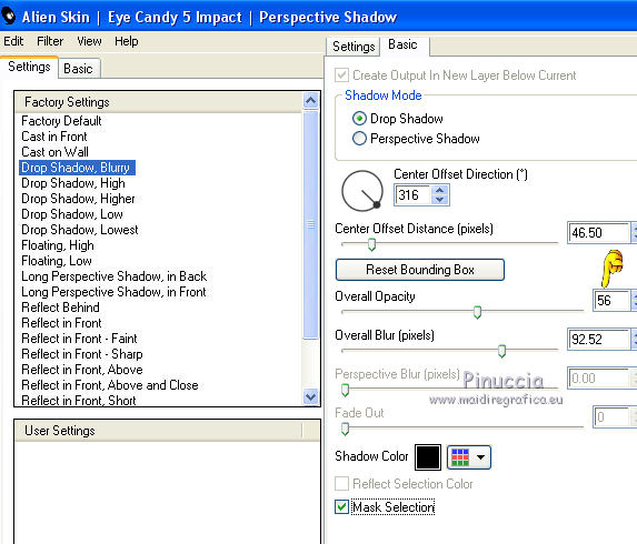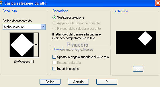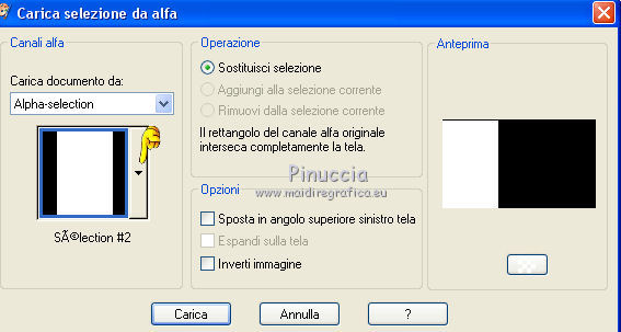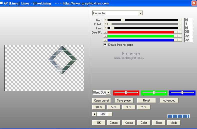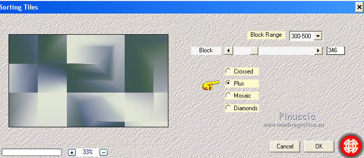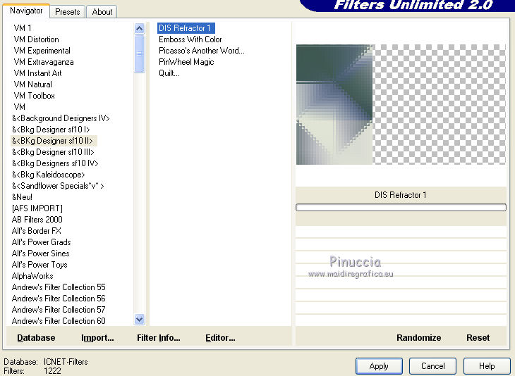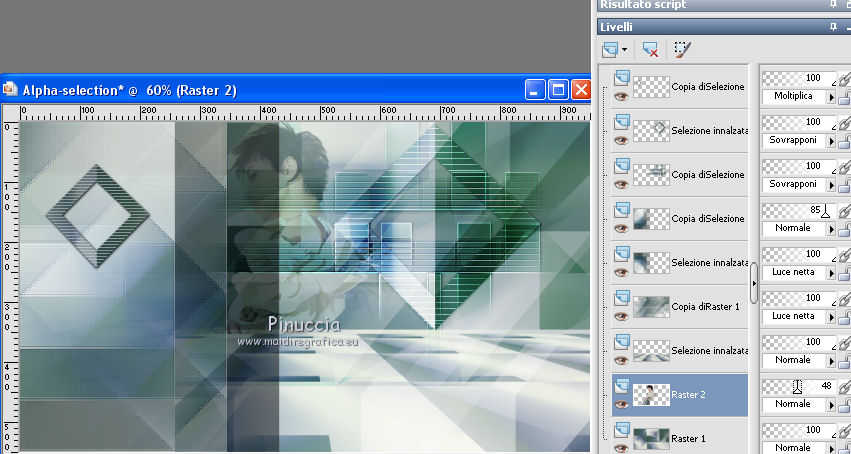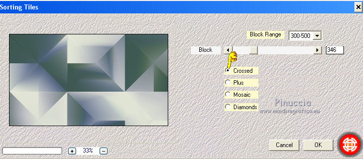 qui puoi trovare qualche risposta ai tuoi dubbi. Se l'argomento che ti interessa non è presente, ti prego di segnalarmelo. Questo tutorial è stato creato con PSP2020 e tradotto con PSPX, ma può essere realizzato anche con le altre versioni di PSP. Dalla versione X4, il comando Immagine>Rifletti è stato sostituito con Immagine>Capovolgi in orizzontale, e il comando Immagine>Capovolgi con Immagine>Capovolgi in verticale. Nelle versioni X5 e X6, le funzioni sono state migliorate rendendo disponibile il menu Oggetti. Con la nuova versione X7, sono tornati Rifletti>Capovolgi, ma con nuove varianti. Vedi la scheda sull'argomento qui Le vostre versioni Occorrente: Materiale qui Per i tubes e la maschera grazie Syl e Narah. (in questa pagina trovi i links ai siti dei creatori di tubes) Filtri: se hai problemi con i filtri, consulta la mia sezione filtri qui Filters Unlimited 2.0 qui Mehdi - Wavy Lab 1.1. qui Mehdi - Sorting Tiles qui &<Bkg Designer sf10I> - Cruncher (da importare in Unlimited) qui &<Bkg Designer sf10II> - DIS Refractor 1 (da importare in Unlimited) qui Toadies - Weaver qui Ap Innovations - Lines SilverLining qui VanDerLee - Unplugged-X qui Graphics Plus - Cross Shadow qui Mura's Meister - Perspective Tiling qui Alien Skin Eye Candy 5 Impact - Glass, Perspective Shadow qui I filtri Toadies e Graphics Plus si possono usare da soli o importati in Filters Unlimited (come fare vedi qui) Se un filtro fornito appare con questa icona ![]() non esitare a cambiare modalità di miscelatura e opacità secondo i colori utilizzati. Apri la maschera in PSP e minimizzala con il resto del materiale. 1. Imposta il colore di primo piano con il colore 1 #dce1d2, e il colore di sfondo con il colore 2 #476253. ![]() scegli quattro colori dal tuo tube se stai utilizzando altri colori 2. Apri Alpha_selection. Finestra>Duplica, o sulla tastiera maiuscola+D, per fare una copia. Chiudi l'originale. La copia, che sarà la base del tuo lavoro non è vuota, ma contiene le selezioni salvate sul canale alfa. Effetti>Plugins>Mehdi - Wavy Lab 1.1. Questo filtro crea gradienti con i colori della paletta: il primo è il colore di sfondo, il secondo quello di primo piano; cambia gli ultimi due colori creati dal filtro: il terzo con il colore 3 #64738c e il quarto con il colore 4 #a2a7ad ![]() Effetti>Plugins>Mehdi - Sorting Tiles ![]() Ripeti Effetti>Plugins>Mehdi - Sorting Tiles, Crossed selezionato ![]() 3. Livelli>Duplica. Effetti>Effetti geometrici>Inclina. ![]() Effetti>Plugins>Filters Unlimited 2.0 - &<Bkg Designer sf10I> - Cruncher. ![]() Cambia la modalità di miscelatura di questo livello in Luce netta, o secondo i tuoi colori, e adatta l'opacità se necessario. ![]() 4. Attiva il livello di sfondo. Selezione>Carica/Salva selezione>Carica selezione da canale alfa. La selezione sélection#1 è subito disponibile. Devi soltanto cliccare Carica. ![]() Selezione>Innalza selezione a livello. Livelli>Disponi>Porta in alto. Selezione>Modifica>Contrai - 40 pixels. Premi sulla tastiera il tasto CANC ![]() Selezione>Deseleziona. Effetti>Plugins>AP Lines - Lines SilverLining. ![]() Cambia la modalità di miscelatura di questo livello in Sovrapponi, o secondo i tuoi colori. ![]() Effetti>Effetti 3D>Sfalsa ombra. ![]() 5. Livelli>Duplica. Effetti>Plugins>Toadies - Weaver. ![]() Effetti>Effetti di bordo>Aumenta di più. Livelli>Disponi>Sposta giù. Livelli>Duplica. Livelli>Unisci>Unisci giù. 6. Attiva il livello inferiore. Selezione>Carica/Salva selezione>Carica selezione da canale alfa. Apri il menu delle selezioni e carica la selezione #2. ![]() Selezione>Innalza selezione a livello. Selezione>Deseleziona. Livelli>Disponi>Sposta su. Effetti>Plugins>Filters Unlimited 2.0 - &<Bkg Designer sf10II> - DIS Refractor 1. ![]() Effetti>Effetti di bordo>Aumenta. Cambia la modalità di miscelatura di questo livello in Luce netta, o secondo i tuoi colori. ![]() Effetti>Plugins>VanDerLee - Unplugged-X - Defocus ![]() Livelli>Duplica. Immagine>Capovolgi. Riporta la modalità di miscelatura di questo livello a Normale, e abbassa l'opacità all'85%. ![]() 7. Attiva il livello di sfondo. Selezione>Carica/Salva selezione>Carica selezione da canale alfa. Apri il menu delle selezioni e carica la selezione #3. ![]() Selezione>Innalza selezione a livello. Selezione>Deseleziona. Effetti>Plugins>Mura's Meister - Perspective Tiling. ![]() Attiva lo strumento Selezione ![]() (non importa il tipo di selezione impostato, perchè con la selezione personalizzata si ottiene sempre un rettangolo) clicca sull'icona Selezione personalizzata ![]() e imposta i seguenti settaggi. ![]() Premi sulla tastiera il tasto CANC ![]() Selezione>Deseleziona. 8. Dovresti avere questo ![]() 9. Attiva il livello superiore (selezione innalzata). Livelli>Duplica. Immagine>Ridimensiona, al 50%, tutti i livelli non selezionato. Premi sulla tastiera il tasto K per attivare lo strumento Puntatore ![]() e imposta Posizione X: 40,00 e Posizione Y: 69,00. ![]() Cambia la modalità di miscelatura di questo livello in Moltiplica. ![]() Effetti>Effetti 3D>Sfalsa ombra, con i settaggi precedenti. 10. Attiva il livello inferiore. Apri il tube SvB 1051 Beauty, cancella la firma e vai a Modifica>Copia. Torna al tuo lavoro e vai a Modifica>Incolla come nuovo livello. se usi un tuo tube, deve misurare 555 pixels di altezza Sposta il tube a sinistra,o attiva lo strumento Puntatore ![]() e imposta Posizione X: 200,00 e Posizione Y: -3,00 ![]() Abbassa l'opacità di questo livello al 48%. ![]() 11. Imposta il colore di primo piano con il colore 3 #64738c. Attiva il livello superiore. Livelli>Nuovo livello raster. Riempi il livello con il colore di primo piano.Livelli>Nuovo livello maschera>Da immagine. Apri il menu sotto la finestra di origine e vedrai la lista dei files aperti. Seleziona la maschera Narah_mask_0609 ![]() Livelli>Unisci>Unisci gruppo. Regola>Messa a fuoco>Accentua messa a fuoco. Livelli>Disponi>Sposta giù. Rimani posizionato sul livello della maschera. Attiva lo st