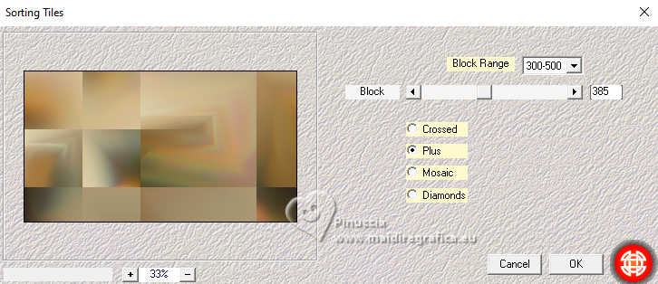 qui puoi trovare qualche risposta ai tuoi dubbi. Se l'argomento che ti interessa non è presente, ti prego di segnalarmelo. Questo tutorial è stato creato con PSP2022 e tradotto con PSPX9, PSP2020 e PSP2022, ma può essere realizzato anche con le altre versioni di PSP. Dalla versione X4, il comando Immagine>Rifletti è stato sostituito con Immagine>Capovolgi in orizzontale, e il comando Immagine>Capovolgi con Immagine>Capovolgi in verticale. Nelle versioni X5 e X6, le funzioni sono state migliorate rendendo disponibile il menu Oggetti. Con la nuova versione X7, sono tornati Rifletti>Capovolgi, ma con nuove varianti. Vedi la scheda sull'argomento qui Le vostre versioniOccorrente: Materiale qui Per il tube grazie Renée. Il resto del materiale è di Crealine (in questa pagina trovi i links ai siti dei creatori del materiale usato nei tutorial) Filtri: se hai problemi con i filtri, consulta la mia sezione filtri qui Filters Unlimited 2.0 qui &<Background Designers IV> - sf10 Slice N Dice (da importare in Unlimited) qui &<Bkg Kaleidoscope> - @Mirrored & Scaled (da importare in Unlimited) qui Mehdi - Wavy Lab 1.1. qui Mehdi - Sorting Tile qui Graphics Plus - Cross Shadow qui Xero - Fritillary qui Alf's Border FX - Border Fade III qui Filter Factory Gallery A - Pool Shadow qui Alien Skin Eye Candy 5 Impact - Glass qui Adjust - Variations qui I filtri Graphics Plus e Alf's Border FX si possono usare da soli o importati in Filters Unlimited (come fare vedi qui) Se un filtro fornito appare con questa icona ![]() non esitare a cambiare modalità di miscelatura e opacità secondo i colori utilizzati. Metti il preset Cliccando sul file una o due volte (a seconda delle tue impostazioni), automaticamente il preset si installerà nella cartella corretta. perchè uno o due clic vedi qui ![]() Apri la maschera in PSP e minimizzala con il resto del materiale. Colori utilizzati ![]() Imposta il colore di primo piano con il colore 2 #c17619, e il colore di sfondo con il colore 1 #e1ddb7. ![]() 1. Apri Alpha-Univers.©crealine. Finestra>Duplica, o sulla tastiera maiuscola+D, per fare una copia ![]() Chiudi l'originale. La copia, che sarà la base del tuo lavoro, non è vuota, ma contiene le selezioni salvate sul canale alfa. Effetti>Plugins>Mehdi - Wavy Lab 1.1. questo filtro lavora con i colori della paletta: il primo è il colore di sfondo, il secondo quello di primo piano; cambia gli ultimi due colori creati dal filtro: il terzo con il colore 3 #b68c62 e il quarto con il colore 4 #131311. ![]() per facilitare la "lettura" imposta nuovamente il colore di primo piano con il colore 1 #e1ddb7 e il colore di sfondo con il colore 2 #c17619 ![]() Regola>Sfocatura>Sfocatura radiale. ![]() Effetti>Effetti di immagine>Motivo unico. ![]() Effetti>Effetti di bordo>Aumenta. 2. Effetti>Plugins>Mehdi - Sorting Tiles. ![]() Effetti>Effetti di bordo>Aumenta. 3. Livelli>Duplica. Effetti>Plugins>Filters Unlimited 2.0 - &<Background Designers IV> - sf10Slice N Dice ![]() Cambia la modalità di miscelatura di questo livello in Sovrapponi, o altro, e abbassa l'opacità al 60%. ![]() 4. Livelli>Nuovo livello raster. Riempi il livello con il colore di primo piano #e1ddb7.Livelli>Nuovo livello maschera>da immagine. Apri il menu sotto la finestra di origine e vedrai la lista dei files aperti. Seleziona la maschera Narah_mask_0340 ![]() Effetti>Effetti di bordo>Aumenta. Livelli>Unisci>Unisci gruppo. Sposta la maschera a destraStrumento Puntatore ![]() Posizione X: 196,00 - Posizione Y: 0,00. ![]() Cambia la modalità di miscelatura di questo livello in Luminanza, o Filtra. ![]() 5. Attiva il livello Copia di Raster 1. Selezione>Carica/Salva selezione>Carica selezione da canale alfa. La selezione sélection #1 è subito disponibile. Devi soltanto cliccare Carica. ![]() Selezione>Innalza selezione a livello. Selezione>Deseleziona. Effetti>Effetti 3D>Sfalsa ombra, colore 3 #b68c62, ombra su nuovo livello selezionato. ![]() non dimenticare di deselezionare ombra su nuovo livello alla prossima applicazione Rimani posizionato sul livello dell'ombra. Effetti>Plugins>GraphicsPlus - Cross Shadow, con i settaggi standard. ![]() Attiva nuovamente il livello della selezione. Cambia la modalità di miscelatura di questo livello in Moltiplica. ![]() 6. Attiva nuovamente il livello Copia di Raster 1. Selezione>Carica/Salva selezione>Carica selezione da canale alfa. Apri il menu delle selezioni e carica la selezione sélection #2. ![]() Selezione>Innalza selezione a livello. Selezione>Modifica>Contrai - 50 pixels. ![]() Effetti>Effetti 3D>Sfalsa ombra, colore nero. ![]() Selezione>Deseleziona. Effetti>Plugins>Filters Unlimited 2.0 - &<Bkg Kaleidoscope> - @Mirrored & Scaled. ![]() con la versione di Unlimited 2.3. la parte bianca avrà il colore del tuo colore di sfondo ![]() Effetti>Effetti 3D>Sfalsa ombra, con i settaggi precedenti. Attiva lo strumento Bacchetta magica , tolleranza o sfumatura 0,![]() Clicca sul colore unito (bianco nel mio esempio con Unlimited 2.0 e con il colore di sfondo nell'esempio con Unlimited 2.3) e sul piccolo triangolo in basso a sinistra. ![]() se il tuo colore unito è il bianco, prima di continuare, riempi la selezione con il colore di sfondoEffetti>Plugins>Xero - Fritillary ![]() Regola>Messa a fuoco>Metti a fuoco. Selezione>Modifica>Contrai - 20 pixels. Premi sulla tastiera il tasto CANC ![]() Selezione>Deseleziona. 7. Attiva il livello di sfondo Raster 1. Effetti>Plugins>Alf's Border FX - Border Fade III. ![]() Effetti>Plugins>Graphics Plus - Cross Shadows (nel mio secondo esempio non l'ho applicato) ![]() 8. Attiva il livello superiore. Apri il tube del paesaggio mist-univers-@crealinegraphic ![]() Modifica>Copia. Torna al tuo lavoro e vai a Modifica>Incolla come nuovo livello. Immagine>Ridimensiona, all'80%, tutti i livelli non selezionato. Immagine>Rifletti>Rifletti orizzontalmente. Attiva lo strumento Puntatore ![]() Posizione X: 335,00 - Posizione Y: -132,00 ![]() Abbassa l'opacità di questo livello al 60%