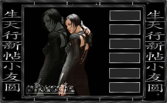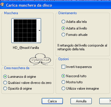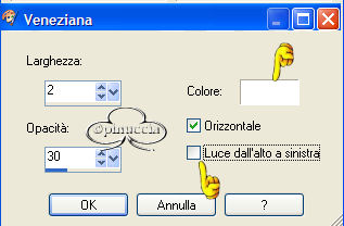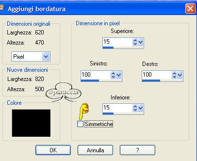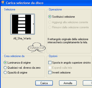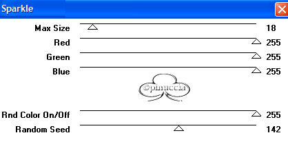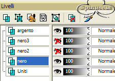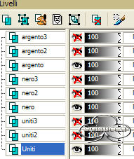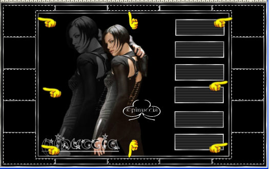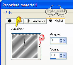 qui puoi trovare qualche risposta ai tuoi dubbi. Se l'argomento che ti interessa non è presente, ti prego di segnalarmelo. Occorrente: Materiale qui Filtri: VM Natural Sparkle Graphics Plus qui Animation Shop qui 1. Apri una nuova immagine NERA 600 x 450 pixels. Apri il tube Mtm-photos 34-Charlize Theron-small e vai a Modifica>copia. Torna alla tua immagine e vai a Modifica>Incolla>incolla come nuovo livello. Spostalo sulla sinistra (vedi l'esempio della tag finale).Nella paletta dei livelli cambia la modalità di miscelatura in Luminanza (esistente) e abbassa l'opacità al 40%. 2. Incolla nuovamente l'immagine: Modifica>Incolla>Incolla come nuovo livello. Immagine>Ridimensiona, dell'85%, tutti i livelli non selezionato: ![]() Sposta il secondo tube addossato al primo:![]() 3. Livelli>Unisci>Unisci visibile. 4. Immagine>Aggiungi bordatura, 2 pixels, simmetriche, con il colore bianco. Seleziona il bordo con la bacchetta magica , tolleranza e sfumatura 0.Riempi il bordo con il Motivo Argento (nello zip: kvmsilver).Apri il file in PSP e minimizzalo nella tua area di lavoro. Clicca sulla freccetta indicata dalla manina rossa per aprire il menu, e troverai il file nella lista dei motivi disponibili. ![]() Regola>Messa a fuoco>Metti a fuoco. Selezione>Nessuna selezione. Immagine>Aggiungi bordatura, 6 pixels, simmetriche, con il colore nero. Immagine>Aggiungi bordatura, 2 pixels, simmetriche, con il colore bianco. Seleziona il bordo con la bacchetta magica , tolleranza e sfumatura 0.Riempi il bordo con il Motivo Argento.Regola>Messa a fuoco>Metti a fuoco. Selezione>Nessuna selezione. 5. Immagine>Aggiungi bordatura, simmetriche non selezionato, con i seguenti valori: ![]() Seleziona il bordo con la bacchetta magica ![]() Livelli>Nuovo livellor raster. Riempi la selezione con il Motivo Argento.6. Livelli>Carica/Salva maschera>Carica maschera da disco: Cerca e carica la maschera HD_©maskVanilla: ![]() Livelli>Unisci>Unisci gruppo. Regola>Messa a fuoco>Metti a fuoco. 7. Livelli>Unisci visibile. Ripeti i tre bordi simmetrici del passo 4. 8. Imposta il colore di sfondo su nero, e il colore di primo piano sul Motivo argento. Attiva lo strumento Testo .Cerca un bel font e imposta Crea come vettore, pennellata 1. Io ho aggiunto una sottolineatura al testo. La dimensione del carattere dipende dalla lunghezza del tuo nome. Scrivi il tuo nome sotto il tube, ma non andare troppo a destra, perchè lo spazio sarà necessario per l'animazione. Livelli>Converti in livello raster. Effetti>Plugins>Graphics Plus /Cross Shadow, con i settaggi standard: ![]() 9. Immagine>Ridimensiona, a 650 pixels di larghezza. Livelli>Unisci>Unisci visiile. 10. Livelli>Nuovo livello raster. Selezione>Carica/Salva selezione>Carica selezione da disco. Cerca e carica la Selezione All_She_Wants: ![]() Riempi la selezione con il Motivo Argento.Selezione>Modifica>Contrai, di 2 pixels. Premi sulla tastiera il tasto CANC. Selezione>Nessuna selezione. Regola>Messa a fuoco>Metti a fuoco. 11. Con la bacchetta magica clicca nei rettangoli.Livelli>Nuovo livello raster. Riempi le selezioni con il colore nero.Nella paletta dei livelli sposta questo livello (i rettangoli riempiti di nero) sotto il livello delle cornici argento. Mantieni selezionato. Duplica il livello due volte e posizionati sul livello più basso. Rinomina i tre livelli nero1, nero2, nero3. Chiudi i due livelli superiori e posizionati sul più basso. ![]() 12. Effetti>Effetti di trama>Veneziana, con i seguenti settaggi: ![]() Mantieni sempre selezionato. Chiudi il livello nero 1 e attiva il livello nero 2. Ripeti l'Effetto Veneziana, ma portando la larghezza a 3. Chiudi il livello nero 2 e attiva il livello nero 3. Ripeti l'Effetto Veneziana, portando la larghezza a 4. 13. Selezione>Nessuna selezione. Duplica due volte il livello delle cornici in argento. 14. Attiva il livello inferiore (livello uniti) Attiva la bacchetta magica e seleziona i piccoli box, come si vede nella schermata sotto:![]() Duplica questo livello due volte. Chiudi i duplicati e posizionati sul livello inferiore. ![]() 15. Effetti>Plugins>VM Natural, Sparkle: ![]() Attiva il secondo livello e ripeti l'Effetto Sparkle, portando il valore "Max Size" a 32. Attiva il terzo livello e ripeti l'Effetto Sparkle, portando il valore "Max Size" a 12. 16. Selezione>Nessuna selezione. 17. Nascondi tutti i livelli eccetti i livelli uniti 1, nero 1 e argento 1. Livelli>Unisci>Unisci visibile. Nascondi questo livello e attiva i livelli uniti 2, nero 2 e argento 2. Livelli>Unisci>Unisci visibile. Nascondi questo livello e attiva i livelli uniti 3, nero 3 e argento 3. Livelli>Unisci>Unisci visibile. 18. Salva in formato psp. 19. Apri Animation Shop. Apri l'animazione fornita con il tutorial (text.mng). Clicca sul primo fotogramma per selezionarlo e vai a Modifica>Seleziona tutto e poi Modifica>Copia. Apri il file che hai appena salvato. Clicca sul primo fotogramma per selezionarlo e vai a Modifica>Seleziona tutto e quindi Modifica>Incolla>Incolla nel fotogramma selezionato. Posiziona il testo sulla striscia di sinistra. Ripeti Modifica>Incolla>Incolla nel fotogramma selezionato per inserire l'animazione anche sulla striscia di destra. Se non sei soddisfatto della posizione, vai a Modifica>Annulla incolla e ripeti l'operazione. Per controllare il risultato, clicca su Visualizza ![]() Per finire, dovrai regolare la velocità dell'animazione. Animazione>proprietà fotogramma e imposta la velocità a 18. Salva in formato gif. ![]() Se hai problemi o dubbi, o trovi un link non funzionante, o anche soltanto per un saluto, scrivimi. Ottobre 2006 |