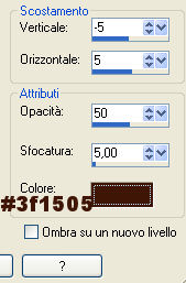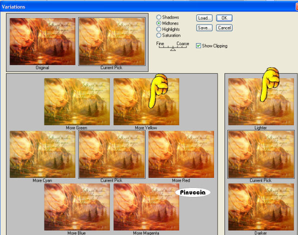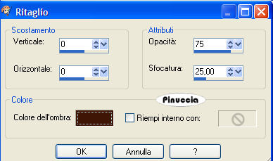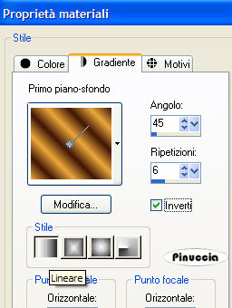 qui puoi trovare qualche risposta ai tuoi dubbi. Se l'argomento che ti interessa non è presente, ti prego di segnalarmelo. Occorrente: Materiale qui Tube di Angel Epiphanie: Jessica_Simpson_MistedFace1 Le immagini: "Riverhouse" di Donald Rust e "Vacher_endless_dream" di Christophe Vacher Animazione: Sparkling.mng Pennello: SkyOfHoney Font a scelta Filtri: Penta.com qui Adjust qui 1. Apri una nuova immagine trasparente 700 x500 pixels. Seleziona tutto. Apri l'immagine "Riverhouse(c)DonaldRusty" e vai a Modifica>Copia. Torna al tuo lavoro e vai a Modifica>Incolla>Incolla nella selezione. 2. Livelli>Nuovo livello raster. Mantieni selezionato. Apri l'immagine "vacher_endless_dream" e vai a Modifica>Copia. Torna al tuo lavoro e vai a Modifica>Incolla>Incolla nella selezione. Selezione>Nessuna selezione. Immagine>Rifletti. Nella paletta dei livelli cambia la modalità di miscelatura in Luce Netta e abbassa l'opacità al 60%. 3. Livelli>unisci>Unisci visibile. 4. Apri il tube jessica-simpson_MistedFace1 e vai a Modifica>Copia. Torna al tuo lavoro e vai a Modifica>Incolla>incolla come nuovo livello. Spostalo a sinistra.Nella paletta dei livelli cambia la modalità di miscelatura in Luce netta e abbassa l'opacità al 70%. 5. Livelli>unisci>Unisci visibile. Livelli>Nuovo livello raster. Riempi il nuovo livello con il colore #823237.Nella paletta dei livelli cambia la modalità di miscelatura di questo livello in Luce diffusa e abbassa l'opacità al 75%. 6. Livelli>unisci>Unisci visibile. 7. Livelli>nuovo livello raster. Riempi il livello con il colore #823237.Attiva lo strumento Pennello ![]() e cerca il pennello di testo SkyOfHoney. Applicalo in basso a destra. Nella paletta dei livelli cambia la modalità di miscelatura in Luminanza (Esistente). 8. Livelli>Unisci>Unisci visibile. 9. Effetti>Plugins>Adjust / Variation. Clicca una volta More Yellow e due volte Lighter. Quindi clicca ok. ![]() ![]() 10. Immagine>Aggiungi bordatura, 2 pixels, simmetriche, con il colore #3f1505. Immagine>Aggiungi bordatura, 2 pixels, simmetriche, con il colore #eba83b. Immagine>Aggiungi bordatura, 2 pixels, simmetriche, con il colore #3f1505. Immagine>Aggiungi bordatura, 40 pixels, simmetriche, con il colore bianco. Seleziona il bordo con la bacchetta magica ![]() Tolleranza e sfumatura 0. Con i colori che hai usato finora crea un gradiente di primo piano/sfondo con i seguenti settaggi: ![]() Riempi il bordo con questo gradiente.11. Effetti>Plugins>Penta.com / Color Dot, con i settaggi standard. ![]() Regola>Messa a fuoco>Metti a fuoco. 12. Selezione>Inverti. Effetti>Effetti 3D>Ritaglio, con i seguenti settaggi, colore #f1505. ![]() 10. Immagine>Aggiungi bordatura, 2 pixels, simmetriche, con il colore #3f1505. Immagine>Aggiungi bordatura, 2 pixels, simmetriche, con il colore #eba83b. Immagine>Aggiungi bordatura, 2 pixels, simmetriche, con il colore #3f1505. 13. Imposta colore di primo piano e di sfondo con #eba83b. Attiva lo strumento Testo ![]() e scegli un bel font, stile vettore. Scrivi il tuo testo nell'angolo in basso a sinistra. Livelli>Converti in livello raster. Effetti>Effetti 3D>Sfalsa ombra, con i seguenti settaggi, colore #3f1505. ![]() 14. Aggiungi il tuo watermark. Livelli>Unisci>Unisci tutto. Immagine>Ridimensiona, a 650 pixels di larghezza. Se non vuoi animare il tuo blend, hai finito. Salva in formato jpg. ![]() ![]() Per creare l'animazione. Copia l'immagine: Modifica>Copia. Apri Animation Shop. Clicca in un punto vuoto della tua area di lavoro con il tasto destro del mouse. Clicca su Incolla come nuova animazione. ![]() Apri Sparkling.mng. Vedrai che è composta da 4 fotogrammi. Per creare l'animazione anche la tua tag dovrà essere composta da 4 fotogrammi. Ritorna alla tag e vai a Modifica>Duplica, e ripeti finchè non avrai ottenuti i fotogrammi necessari. Attiva nuovamente Sparkling.mng. Clicca sul primo fotogramma per selezionarlo e vai a Modifica>Seleziona tutto. Quindi Modifica>Copia. Riattiva la tag. Clicca sul primo fotogramma per selezionarlo e vai a Modifica>Seleziona tutto. Quindi Modifica>Incolla>Incolla nel fotogramma selezionato. Se non sei soddisfatto della posizione torna indietro con Modifica>Annulla incolla e ripeti. Per controllare il risultato clicca su Visualizza ![]() Ripeti se vuoi applicare l'animazione su altri punti della tag. Quando hai finito, cambia la velocità dei fotogrammi: Animazione>Proprietà fotogramma e imposta la velocità a 15. ![]() Salva in formato gif. ![]() Se hai problemi o dubbi, o trovi un link non funzionante, o anche soltanto per un saluto, scrivimi. Settembre 2006 |