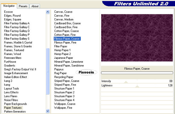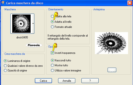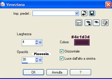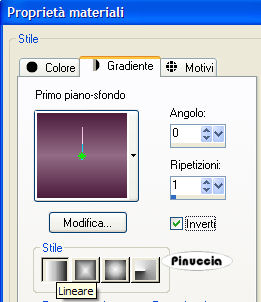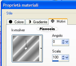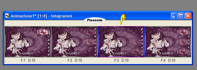 qui puoi trovare qualche risposta ai tuoi dubbi. Se l'argomento che ti interessa non è presente, ti prego di segnalarmelo. Occorrente: Materiale qui Metti la maschera dmsk0495 nella cartella Maschere di PSP. Apri i font e minimizzali nella tua area di lavoro. Li troverai nella lista dei font disponibili quando ti servirà. Apri il motivo argento kvmsilver e minimizzalo nella tua area di lavoro. Lo troverai nella lista dei Motivi disponibili, quando ti servirà. Filtri: Filters Unlimited qui Graphics Plus qui 1. Apri una nuova immagine trasparente 600 x 400 pixels. 2. Imposta il colore di primo piano con #936b86, e il colore di sfondo con #4c1d3d. Riempi l'immagine trasparente con il colore chiaro di primo piano.3. Effetti>Plugins>Filters Unlimited - Paper Textures, Fibrous Paper Fine, con i settaggi standard. ![]() 4. Livelli>Nuovo livello raster. Riempi il nuovo livello con il colore scuro di sfondo.Effetti>Plugins>Filters Unlimited, Paper Textures Fibrous Paper Coarse, con i settaggi standard. ![]() 5. Livelli>Carica/Salva maschera>Carica maschera da disco. Cerca e carica la maschera dmsk0495: ![]() Livelli>Unisci>Unisci gruppo. ![]() 6. Apri il tube Vanity Aurore e vai a Modifica>Copia. Torna al tuo lavoro e vai a Modifica>Incolla>Incolla come nuovo livello. Immagine>Ridimensiona, al 70%, ricampionamento bicubica, tutti i livelli non selezionato. ![]() Immagine>Rifletti. Effetti>Effetti 3D>Sfalsa ombra: ![]() ![]() 7. Attiva lo strumento Selezione , rettangolo,e disegna un rettangolo in basso a destra. Livelli>Nuovo livello raster. Con i colori impostati come colore di primo piano e sfondo, crea un Gradiente con i seguenti settaggi: ![]() Riempi la selezione con questo gradiente.![]() 8. Apri il tube 008 _(Flowers) e vai a Modifica>Copia. Torna al tuo lavoro e vai a Modifica>Incolla>Incolla nella selezione. 9. Selezione>Modifica>Contrai, di 3 pixels. Selezione>Inverti. Selezione>Mobile. Selezione>Immobilizza. Livelli>Nuovo livello raster. Passa il colore di primo piano su Motivi, e seleziona il motivo argento kvmsilver. ![]() Riempi la selezione con questo motivo.Effetti>Plugins>Graphics Plus - Cross Shadow, con i settaggi standard. ![]() Ripeti l'Effetto Cross Shadow. Mantieni selezionato. Effetti>Effetti 3D>Sfalsa ombra: ![]() Selezione>Nessuna selezione. 10. Attiva il livello con il fiore (Raster 3). Effetti>Effetti di trama>Veneziana, con il colore scuro di sfondo: ![]() 11. Attiva il livello superiore. Livelli>Unisci>Unisci giù. Effetti>effetti 3D>Sfalsa ombra, con i settaggi usati al passo 9. 12. Immagine>Ridimensiona, all'80%, bicubica, tutti i livelli non selezionato. ![]() Sposta l'immagine in alto a destra.![]() 13. Selezione>Seleziona tutto. Selezione>Modifica>Contrai, di 4 pixels. Selezione>Inverti. Livelli>Nuovo livello raster. Riempi con il motivo argento.Effetti>Plugins>Graphics Plus - Cross Shadow, con i settaggi standard, 2 volte. Effetti>Effetti 3D>Sfalsa, con i settaggi usati al passo 9. Selezione>Nessuna selezione. 14. Chiudi i livelli con l'immagine del fiore. 15. Attiva lo strumento Testo ![]() Scegli un colore chiaro dall'immagine e impostalo come colore di sfondo. Chiudi il colore di primo piano. (Ti trovi sul livello con il bordo). Io ho scelto il font Chick (fai attenzione a impostare la direzione verticale) ![]() Scrivi il tuo nome a destra, dove c'è l'immagine dei fiori. Livelli>Converti in livello raster. 16. Effetti>Plugins>Filters Unlimited - Paper Texture, e scegli a tuo piacimento una trama. Effetti>Effetti 3D>Sfalsa ombra, con i settaggi precedenti, 2 volte. ![]() 17. Attiva nuovamente lo strumento Testo ![]() imposta il colore di sfondo con il motivo argento, il colore di primo piano sempre chiuso. Attenzione, ricordati di reimpostare la direzione orizzontale. Io ho usato il font Monika, dimensione 60. la dimensione del test dipenderà dalla lunghezza del tuo nome e anche dalla versione di PSP che stai usando. I pixels di PSP 9 non corrispondono ai pixels di PSP X. Su queste differenze vedi alcuni appunti in fondo a questa pagina Scrivi il tuo nome sulla tag. Livelli>Converti in livello raster. Effetti>Plugins>Graphics Plus - Cross Shadow, con i settaggi standard, due volte. Effetti>Effetti 3D>Sfalsa ombra: ![]() 18. Il livello del fiore è ancora chiuso. Livelli>Unisci>Unisci visibile. Se vuoi, questo è il momento di aggiungere il tuo watermark. 19. Adesso puoi rendere nuovamente visibile il livello del fiore. Livelli>Duplica, 2 volte. Sistema i livelli duplicati uno sotto l'altro. 21. Abbassa l'opacità del livello centrale al 70%, e quella dell'ultimo livello al 50%. ![]() RImani sempre posizionato sul livello inferiore (Uniti). Chiudi i livelli dei due duplicati. ![]() 22. Modifica>Copia unione. Apri Animation Shop. Clicca con il tasto destro del mouse sullo spazio vuoto e Incolla come nuova animazione. ![]() Ritorna in PSP. Chiudi il primo livello del fiore e apri il primo duplicato. ![]() Modifica>Copia. In Animation Shop: Modifica>Incolla>Incolla dopo il fotograma corrente. Ancora in Psp: chiudi il primo duplicato e apri il secondo: ![]() In Animation Shop: Modifica>Incolla>Incolla dopo il fotogramma corrente. Torna ancora una volta in PSP e apri tutti i livelli. Modifica>Copia Unione. In Animation Shop: Modifica>Incolla>Incolla dopo il fotogramma corrente. A questo punto la tua animazione è composta da quattro fotogrammi. Clicca sul fotogramma 3 per selezionarlo. Attenzione, soltanto questo deve avere la cornice blu. ![]() per avere una migliore visione dell'insieme dei fotogrammi, riducili usando la rotellina del mouse Modifica>Copia. Clicca sull'ultimo fotogramma (ricorda: soltanto questo fotogramma deve avere la cornice blu), il numero 4, e vai a Modifica>Incolla>Incolla dopo il fotogramma corrente. Adesso clicca sul fotogramma n. 2. Modifica>Copia. Clicca sull'ultimo fotogramma, che adesso sarà il numero 5 e vai a Modifica>Incolla>Incolla dopo il fotogramma selezionato. Per finire, clicca sul primo fotogramma e vai a Modifica>Copia.