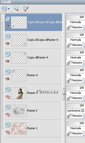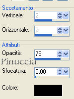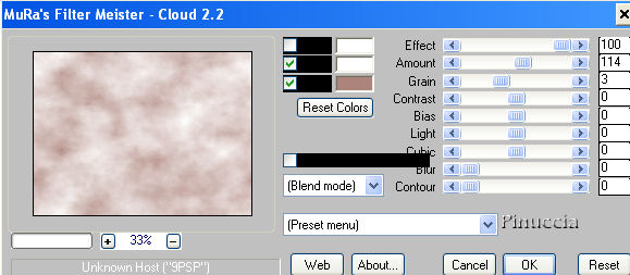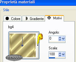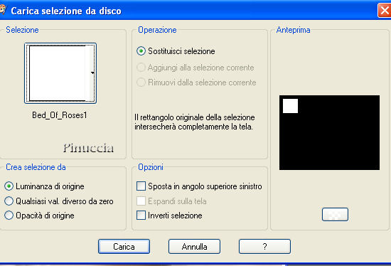 qui puoi trovare qualche risposta ai tuoi dubbi. Se l'argomento che ti interessa non è presente, ti prego di segnalarmelo. Occorrente: Materiale qui Nello zip trovi: i tubes White_Rose_Misted di Angels Epiphany, SS_1344_Misted di Suzi, e WhiteRoseLady di Silvie, l'animazione ConstallationHeart.mng. un motivo Oro: bg4.bmp, la selezione Bed_of_Roses1 Filtro: Mura's Meister qui 1. Apri una nuova immagine trasparemte 600 x 450 pixels. Imposta il colore di primo piano con il bianco (#ffffff), e il colore di sfondo con #ad847b. 2. Effetti>Plugins>Mura's Meister - Cloud: ![]() 3. Selezione>Seleziona tutto. Livelli>Nuovo livello raster. Apri il tube White_Rose_Misted e vai a Modifica>Copia. Torna al tuo lavoro e vai a Modifica>Incolla>Incolla nella selezione. Selezione>Nessuna selezione. Cambia la modalità di miscelatura di questo livello in Luminanza (esistente). 4. Apri il tube di Suzi SS_1344_Misted e vai a Modifica>Copia. Torna al tuo lavoro e vai aModifica>Incolla>Incolla come nuovo livello. Immagine>Ridimensiona: ![]() Sposta il tube un po' più a destra.![]() 5. Livelli>Nuovo livello raster. Con i due colori impostati all'inizio passa il colore di sfondo a gradiente di primo piano/sfondo, con i seguenti settaggi: ![]() Apri il Motivo oro e minimizzalo. Imposta il colore di primo piano a Motivi. ![]() Clicca sulla freccetta a fianco del box e seleziona il motivo Oro. Selezione>Carica/Salva selezione>Carica selezione da disco: cerca e carica la selezione Bed_Of_Roses1. ![]() Riempi la selezione con il Motivo Oro.Selezione>Modifica>Contrai, di 2 pixels. Riempi con il gradiente(essendo impostato come colore di sfondo, devi cliccare con il tasto destro del mouse). Livelli>Nuovo livello raster. Mantieni selezionato. Apri il tube di Silvia "WhiteRoseLady" e vai a Modifica>Copia. Torna al tuo lavoro e vai a Modifica>Incolla>Incolla nella selezione. 6. Livelli>Unisci>Unisci giù. Selezione>Nessuna selezione. Effetti>Effetti 3d>Sfalsa ombra: ![]() 7. Livelli>Duplica. Immagine>Rifletti. Livelli>Duplica. Sposta l'immagine nell'angolo in basso a destra.Livelli>Duplica. Immagine>Rifletti. 8. Chiudi i livelli 1,2,3. Posizionati su uno degli altri 4 livelli. ![]() Livelli>Unisci>Unisci visibile. Livelli>Duplica. Immagine>Ridimensiona: ![]() Apri i livelli inferiori. In una volta sola puoi fare: Livelli>Visualizza>Tutto. ![]() 9. Livelli>Unisci>Unisci tutto. Selezione>Seleziona tutto. Livelli>Nuovo livello raster. Riempi con il Motivo oro.Selezione>Modifica>Contrai, di 2 pixels. Riempi con il gradiente.Selezione>Modifica>Contrai, di 3 pixels. Riempi con il Motivo oro.Selezione>Modifica>Contrai, di 2 pixels. Premi sulla tastiera il tasto CANC. Selezione>Nessuna selezione. Livelli>Unisci>Unisci tutto. 10. Livelli>Duplica. Immagine>Ridimensiona: ![]() Sposta l'immagine nell'angolo in basso a sinistra.Effetti>Effetti 3D>Sfalsa ombra, con gli stessi settaggi del passo 6. Livelli>Unisci>Unisci tutto. 11. Chiudi il colore di primo piano e imposta il colore di sfondo con il Motivo Oro. Attiva lo strumento Testo , cerca un bel font,crea come vettore, e scrivi il tuo nome sull'immagine. Livelli>Converti in livello raster. Regola>Messa a fuoco>Metti a fuoco. Effetti>Effetti 3D>Sfalsa ombra, con i settaggi precedenti. Livelli>Unisci>Unisci tutto. Aggiungi il tuo watermark. ![]() 12. Modifica>Copia. Apri Animation Shop. Clicca con il tasto destro del mouse sullo spazio vuoto e Incolla come nuova animazione. ![]() Livelli>Duplica e ripeti finchè la tua immagine non avrà 21 fotogrammi. Clicca sul primo fotogramma per selezionarlo e vai a Modifica>Selezione tutto. Apri l'animazione fornita con il tutorial: ConstellationHeart.mng. Clicca sul primo fotogramma per selezionarlo e vai a Modifica>Seleziona tutto e poi Modifica>Copia. Attiva la tua immagine e vai a Modifica>Incolla>Incolla nel fotogramma selezionato. Di tutta l'animazione vedrai soltanto la piccola parte indicata nella schermata sotto. Per posizionare il cuore dietro la donna, più o meno questa è la posizione della parte che vedi: ![]() Quando sei certo di aver trovato la posizione corretta, rilascia il tasto del mouse. Per controllare il risultato clicca su Visualizza ![]() Se non sei soddisfatto, vai a Modifica>Annulla Incolla e ripeti l'operazione. Quando hai finito, salva in formato gif. ![]() Se hai problemi o dubbi, o trovi un link non funzionante, o anche soltanto per un saluto, scrivimi. Gennaio 2007 |