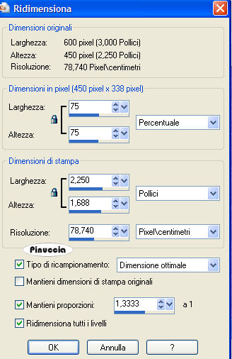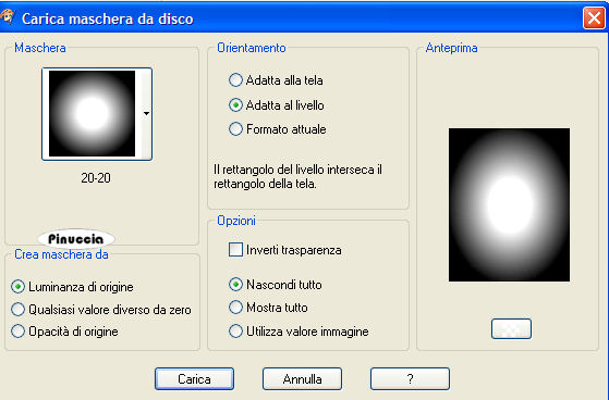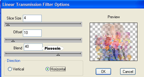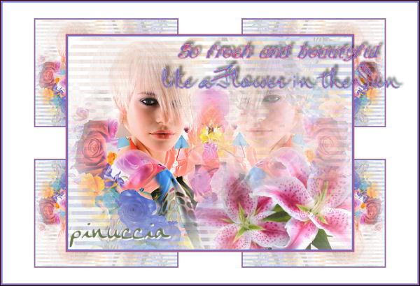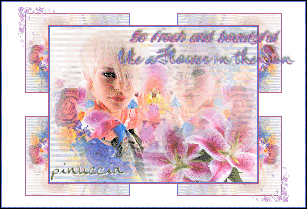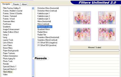 qui puoi trovare qualche risposta ai tuoi dubbi. Se l'argomento che ti interessa non è presente, ti prego di segnalarmelo. Occorrente: Materiale qui Nello zip trovi: Tubes: Mtm_Lady_Colors and flowers 1, rw-stargazerlilies e il tube di testo Flower_in_the_sun. le animazioni Blooming_Corner1.mng e Blooming_Corner2.mng. Ti occorre inoltre un font a scelta e la maschera 20/20 qui 1. Apri una nuova immagine BIANCA 600 x 450 pixels. Apri il tube "Mtm_Lady_Colors and flowers 1" e vai a Modifica>Copia. Torna alla tua immagine bianca e vai a Modifica>Incolla>Incolla come nuovo livello. 2. Effetti>Plugins>Dsb Flux - Linear Transmission: ![]() Livelli>Duplica. Immagine>Rifletti. Immagine>Capovolgi. Sposta i due livelli in modo che si intreccino.Fai attenzione che non si veda alcun vuoto bianco. Livelli>Unisci>Unisci giù. Abbassa l'opacità di questo livello al 25%. ![]() 3. Modifica>Incolla>Incolla come nuovo livello (il tube è ancora in memoria). 4. Livelli>Carica/Salva maschera>Carica maschera da disco: cerca e carica la maschera 20-20: ![]() Livelli>Unisci>Unisci gruppo. Sposta il tube a sinistra.5. Livelli>Duplica. Immagine>Rifletti. Abbassa l'opacità di questo livello al 40%. 6. Apri il tube "rw-stargazerlilies" e vai a Modifica>Copia. Torna al tuo lavoro e vai a Modifica>Incolla>Incolla come nuovo livello. Immagine>Ridimensiona, al 60%, bicubica, tutti i livelli non selezionato: ![]() Sposta il tube nell'angolo in basso a destra.7. Livelli>Carica/Salva maschera>Carica maschera da disco: cerca e carica la maschera 20-20: ![]() Livelli>Unisci>Unisci gruppo. Abbassa l'opacità di questo livello all'80%. ![]() ![]() 8. Livelli>Unisci>Unisci visibile. 9. Immagine>Ridimensiona, al 75%, ricampionamento ottimale, tutti i livelli non selezionato. ![]() Regola>Messa a fuoco>Metti a fuoco. Immagine>Aggiungi bordatura, 2 pixels, simmetriche, con il colore #6776c8. Immagine>Aggiungi bordatura, 2 pixels, simmetriche, con il colore #ba5b83. 10. Immagine>Dimensione tela: ![]() ![]() 11. Clicca con la bacchetta magica sul bordo bianco per selezionarlo.Effetti>Plugins>Filters Unlimited - Tile and Mirror - Mirrored Scaled. ![]() Selezione>Nessuna selezione. ![]() 12. Immagine>Aggiungi bordatura, 2 pixels, simmetriche, con il colore #6776c8. Immagine>Aggiungi bordatura, 2 pixels, simmetriche, con il colore #ba5b83. 13. Selezione>Seleziona tutto. Selezione>Modifica>Contrai, di 4 pixels. Selezione>Inverti. Effetti>Plugins>Bordermania - Frame #2: ![]() Selezione>Nessuna selezione. 14. Apri il tube di testo Flower_in_the_sun e vai a Modifica>Copia. Torna al tuo lavoro e vai a Modifica>Incolla>Incolla come nuovo livello. Spostalo come nel mio esempio.15. Aggiungi il tuo watermark. 16. Attiva lo strumento Testo ![]() e seleziona un bel testo, crea come vettore. Imposta il colore di sfondo con un colore scuro e chiudi il colore di primo piano. Scrivi il tuo nome. Livelli>Converti in livello raster. Effetti>Effetti 3D>Sfalsa ombra: ![]() Ripeti l'Effetto Sfalsa ombra. Livelli>Unisci>Unisci tutto. 17. Immagine>Ridimensiona, a 600 pixels di larghezza. 18. Se non vuoi animare la tag, hai finito. Salva in formato jpg. ![]() Animazione Modifica>Copia. Apri Animation Shop. Clicca con il tasto destro del mouse sullo spazio vuoto e Incolla come nuova animazione. ![]() Modifica>Duplica e ripeti finchè non avrai ottenuto 10 fotogrammi. Clicca sul primo fotogramma per selezionarlo e vai a Modifica>Seleziona tutto. Apri l'animazione Blooming_Corner1.mng. Clicca sul primo fotogramma per selezionarlo e vai a Modifica>Seleziona tutto e poi Modifica>Copia. Torna alla tua tag e vai a Modifica>Incolla>Incolla nel fotogramma selezionato. Posiziona l'animazione nell'angolo in alto a sinistra e, quando sei certo di aver trovato la posizione corretta, rilascia il tasto del mouse. Per controllare il risultato clicca su Visualizza ![]() Ricorda che se non sei soddisfatto puoi annullare con Modifica>Annulla Incolla, oppure cliccando sull'icona relativa nella barra superiore ![]() Apri l'animazione Blooming_Corner2.mng e ripeti gli stessi passaggi, ma posizionando l'angolo in basso a destra. Quando hai finito: Animazione>Proprietà fotogramma, e imposta la velocità a 15. ![]() Salva in formato gif. ![]() Se hai problemi o dubbi, o trovi un link non funzionante, o anche soltanto per un saluto, scrivimi. 17 Febbraio 2007 |