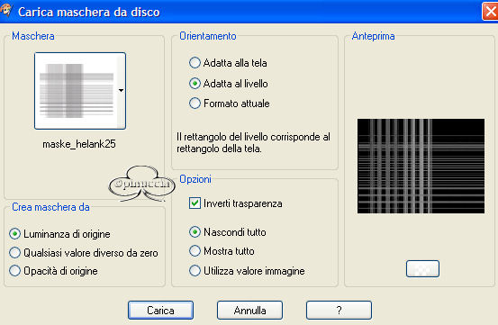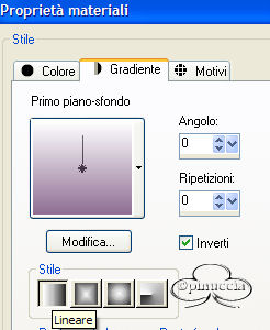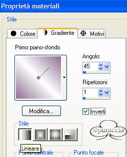 qui puoi trovare qualche risposta ai tuoi dubbi. Se l'argomento che ti interessa non è presente, ti prego di segnalarmelo. Occorrente: Materiale qui Tubes: 180706_Snowball_TD di Ann e il tube di un fiore. la selezione Blue_Eyes1 (mettila nella cartella Selezioni), la maschera maske_helank25 (mettila nella cartella Maschere), il pennello di testo Blue_Eyes Text e il font D Filtri: Graphics Plus qui FM Tile Tools qui Xero qui Ann ha concesso il dowload dei suoi tubes soltanto per uso personale. Non potete usarli per i vostri tutorial. Non cambiate il nome del file e non cancellate il livello del copyright. 1. Apri una nuova immagine trasparente 600x450 pixels. Imposta il colore di primo piano con #feffff, e il colore di sfondo con #8f6e93. Crea un gradiente di primo piano/sfondo, con i seguenti settaggi: ![]() Riempi l'immagine con questo gradiente.2. Livelli>Nuovo livello raster. Riempi con il colore scuro di sfondo.(ricorda: per riempire con il colore di sfondo devi clicca con il tasto destro del mouse). 3. Livelli>Carica/Salva maschera>Carica maschera da disco: cerca e carica la maschera Maske-helank25: ![]() ![]() Livelli>Unisci>Unisci gruppo. 4. Livelli>Unisci>Unisci visibile. Effetti>Plugins>FM Tile Tools - Blend emboss, con i settaggi standard: ![]() 5. Livelli>Nuovo livello raster. Attiva lo strumento Selezione ![]() e traccia una selezione sul lato destro dell'immagine, in modo che prenda metà del blend. ![]() Cambia il settaggio del gradiente, togliendo la spunta a "Inverti" e riempi la selezione con il gradiente.6. Apri il tube di Ann 180706_Snowball_TD e vai a Modifica>Copia. Torna al tuo lavoro e vai a Modifica>Incolla>Incolla nella selezione. Selezione>Nessuna selezione. 7. Livelli>Nuovo livello raster. Selezione>Carica/Salva selezione>Carica selezione da disco: cerca e carica la selezione Blue_Eyes1: ![]() Ancora una volta cambia i settaggi del gradiente: ![]() Riempi le stelle con questo gradiente.Effetti>Effetti 3D>Sfalsa ombra, con i seguenti settaggi, colore #622e4d: ![]() Ripeti l'Effetto Sfalsa ombra. ![]() 8. Attiva il livello con il tube della donna. Apri il tube del fiore e vai a Modifica>Copia. Torna al tuo lavoro e vai a Modifica>Incolla>Incolla come nuovo livello. Cambia la modalità di miscelatura di questo livello in Luminanza (esistente) e abbassa l'opacità al 60%. Spostalo nell'angolo in basso a sinistra.