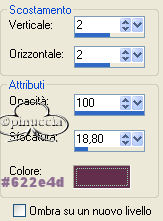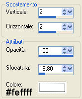 ![]() 9. Livelli>Unisci>Unisci visibile. 10. Passa il colore scuro di sfondo a colore di primo piano e chiudi il colore di sfondo. Attiva lo strumento Testo e seleziona il font D (Drakon),Crea come vettore, pennellata 3, dimensione 60, e scrivi il tuo testo in alto al centro del blend. Livelli>Converti in livello raster. Effetti>Effetti 3D>Sfalsa ombra, con i settaggi precedenti, ma con il colore chiaro di primo piano #feffff. ![]() ![]() Ripeti l'Effetto Sfalsa ombra. 11. Livelli>Nuovo livello raster. Attiva lo strumento Pennello ![]() e cerca il pennello Blue_Eyes Text, dimensione 210 Imposta il colore di primo piano con #8f6e93 e applica il pennello in basso a sinistra del blend. Effetti>Effetti 3D>Sfalsa ombra, con gli stessi settaggi usati per il testo, e ripeti una seconda e una terza volta. 12. Livelli>Unisci>Unisci tutto. 13. Effetti>Plugins>Xero - Porcelain: ![]() 14. Immagine>Aggiungi bordatura, 2 pixels, simmetriche, con il colore scuro. Immagine>Aggiungi bordatura, 8 pixels, simmetriche, con il colore bianco. Clicca sul bordo bianco con la Bacchetta magica (Sfumatura e tolleranza 0),Riempi con l'ultimo gradiente utilizzato.Effetti>Plugins>Graphics Plus - Cross Shadow, settaggi standard: ![]() Ripeti l'Effetto Cross Shadow. Effetti>Effetti 3D>Sfalsa ombra, con i settaggi precedenti. Ripeti l'Effetto Sfalsa ombra, ma cambiando verticale e orizzontale a -2. Selezione>Nessuna selezione. Immagine>Aggiungi bordatura, 2 pixels, simmetriche, con il colore scuro. Aggiungi la tua firma o il tuo watermark e salva in formato jpg. ![]() Se hai problemi o dubbi, o trovi un link non funzionante, o anche soltanto per un saluto, scrivimi. Gennaio 2007 |