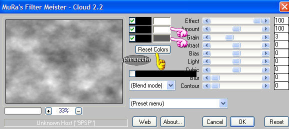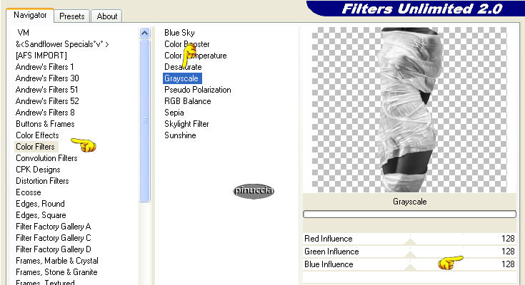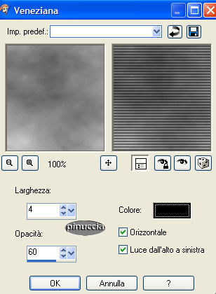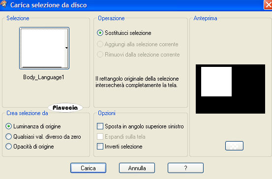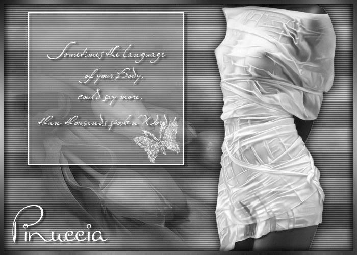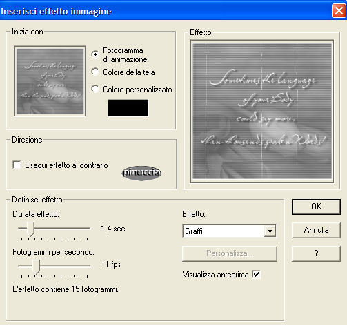 qui puoi trovare qualche risposta ai tuoi dubbi. Se l'argomento che ti interessa non è presente, ti prego di segnalarmelo. Occorrente: Materiale qui I tubes: "@nn_140906_SpecialColl_Body_TD", "black_tulips" e il file di testo "text_tube_body_language", la selezione "Body_Language1", e l'animazione "Butterflying.mng". Ann concede soltanto l'uso personale dei suoi tubes. Non potete usarlo per i vostri tutorial. Non cambiate il nome e non cancellate il livello del copyright. Filtri: Filters Unlimited qui Mura's Meister qui Graphics Plus qui 1. Apri una nuova immagine trasparente 700 x 500 pixels. Apri il tube @nn_140906_SpecialColl_Body_TD e vai a Modifica>Copia, e Modifica>Incolla>Incolla come nuova immagine. 2. Effetti>Plugins>Filters Unlimeted - Color Filters - Grayscale, settaggi standard: ![]() Minimizza questa immagine per il momento. 3. Imposta il colore di primo piano su bianco (#ffffff) e il colore di sfondo su #5d5d5d. Posizionati sul livello di sfondo (quello trasparente). Effetti>Plugins>Mura's Meister - Cloud: ![]() (fai attenzione: questo filtro lavora con i colori impostati nella paletta dei colori: nel tuo caso, bianco e 5d5d5d, ma se tu hai già usato il filtro in precedenza, tiene sempre in memoria i primi colori utilizzati. Quindi ti consiglio di controllare sempre la paletta (manina rossa). In ogni caso, cliccando su Reset colors, imposta automaticamente quelli scelti per questo lavoro). 4. Effetti>Effetti di trama>Veneziana: ![]() Apri il tube Black_tulips e vai a Modifica>Copia. Torna al tuo lavoro e vai a Modifica>Incolla>Incolla come nuovo livello. Spostalo nell'angolo in basso a sinistra.Attiva il tube Special_Body di @ann che hai messo da parte prima e vai a Modifica>Copia. Torna al tuo lavoro e vai a Modifica>Incolla>Incolla come nuovo livello. Spostalo sulla destra.![]() Effetti>Effetti 3D>Sfalsa ombra: ![]() 5. Livelli>Nuovo livello raster. Selezione>Carica/Salva selezione>Carica selezione da disco. Cerca e carica la selezione Body_Language1. ![]() Riempi con il colore bianco.Livelli>Nuovo livello raster. Riempi nuovamente con il bianco.Selezione>Modifica>Contrai, di 2 pixels, premi sulla tastiera il tasto CANC. Nella paletta dei livelli attiva il livello il livello immediatamente sotto (la prima selezione) e abbassa l'opacità al 35%. Chiudi i 3 livelli sottostanti. Livelli>Unisci>Unisci visibile. Selezione>Nessuna selezione. 6. Effetti>Effetti 3D>Sfalsa ombra: ![]() ![]() Apri tutti i livelli e rimani posizionato sul livello uniti. Attiva il tube di testo Body_language e vai a Modifica>Copia. Torna al tuo lavoro e vai a Modifica>Incolla>Incolla come nuovo livello. Sposta il testo sulla selezione.Effetti>Effetti 3D>Sfalsa ombra, con i settaggi precedenti: ![]() 7. Livelli>Unisci>Unisci visibile. Selezione>Seleziona tutto. Selezione>Modifica>Contrai, di 8 pixels. Selezione>Inverti. Regola>Sfocatura>Sfocatura gaussiana, raggio 40. ![]() 8. Mantieni selezionato. Effetti>Plugins>GraphicsPlus - Cross Shadow, settaggi standard. ![]() Effetti>Effetti 3D>Sfalsa ombra: ![]() Ripeti l'effetto Sfalsa ombra, ma cambiando verticale e orizzontale a -2. Selezione>Nessuna selezione. 9. Imposta il colore di sfondo con il bianco e chiudi il colore di primo piano. Attiva lo strumento Testo , scegli un bel font, crea come vettoree scrivi il tuo testo sotto l'immagine. Livelli>Converti in livello raster. Effetti>Effetti 3D>Sfalsa ombra: ![]() 10. Carica nuovamente la selezione Body_Language1: Selezione>Carica/Salva selezione>Carica selezione da disco. Modifica>Copia. Apri Animation Shop. Clicca con il tasto destro del mouse sullo spazio vuoto e Incolla come nuova animazione. Effetti>Inserisci effetto immagine, Graffi, con i seguenti settaggi: ![]() 11. Torna in PSP e annulla la selezione: Modifica>Annulla carica selezione da disco. Modifica>Copia. Torna in Animation Shop, clicca con il tasto destro del mouse sullo spazio vuoto e Incolla come nuova animazione. Clicca con il tasto destro sull'immagine e Duplica, finchè non avrai ottenuto 16 fotogrammi. 12. Modifica>Seleziona tutto. Attiva l'immagine con l'Effetto graffi e vai a Modifica>Seleziona tutto, e poi Modifica>Copia. Riprendi l'immagine principale e vai a Modifica>Incolla>Incolla nel fotogramma selezionato. Trova la posizione corretta e, quando sei sicuro, rilascia il tasto del mouse. 13. Apri adesso l'animazione Butterflying.mng. Modifica>Seleziona tutto e poi Modifica>Copia. Ritorna al tuo lavoro e vai a Modifica>Incolla>Incolla nel fotogramma selezionato. Posiziona la farfalla e, quando hai trovato la posizione corretta, rilascia il tasto del mouse. Ricorda che puoi controllare il risultato cliccando su Visualizza ![]() e che se non sei soddisfatto puoi tornare indietro con Modifica>Annulla e ripetere l'operazione. 14. Se vuoi ridimensionare l'immagine: Modifica>Seleziona tutto. Animazione>Ridimensiona animazione, a 600 pixels di larghezza, dimensioni ottimali. ![]() ![]() Se hai problemi o dubbi, o trovi un link non funzionante, o anche soltanto per un saluto, scrivimi. Dicembre 2006 |