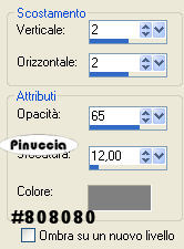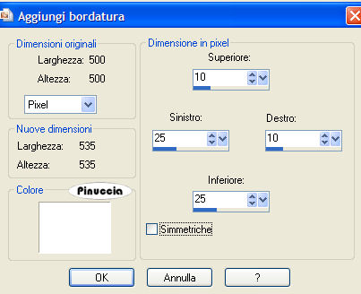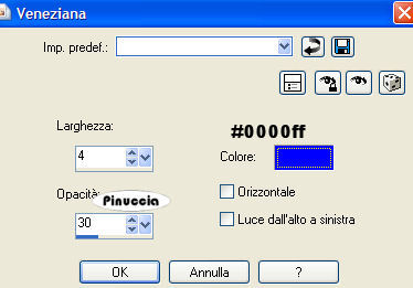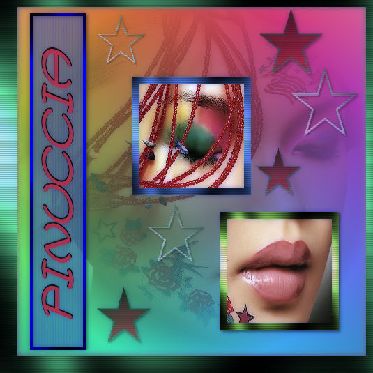 qui puoi trovare qualche risposta ai tuoi dubbi. Se l'argomento che ti interessa non è presente, ti prego di segnalarmelo. Occorrente: Materiale qui Filtri: Filters Unlimited 2.0 qui Xero qui Graphics Plus qui Metti la maschera nella cartella Maschere. Apri il font e minimizzalo nella tua area di lavoro. Lo troverai nella lista dei font disponibili quando userai lo strumento Testo. 1. Apri una nuova immagine trasparente 500 x 500 pixels. 2. Imposta il colore di primo piano con #d9e6ee, e il colore di sfondo con #383a37. Passa il colore di primo piano a Gradiente di primo piano/sfondo, stile lineare: ![]() Riempi l'immagine trasparente con questo gradiente.3. Effetti>Plugins>Filters Unlimited - Color Effects - Channel Rotation: ![]() ![]() 4. Apri l'immagine TattooFace. Fai una copia con shift+D e mettila da parte. Continua sull'originale. Livelli>Carica/Salva maschera>Carica maschera da disco: cerca e carica la maschera 20-20: ![]() Livelli>Unisci>Unisci gruppo. Modifica>Copia. 5. Torna al tuo lavoro. Selezione>Seleziona tutto. Livelli>Nuovo livello raster. Modifica>Incolla>Incolla nella selezione. Cambia la modalità di miscelatura di questo livello in Moltiplica, e abbassa l'opacità al 60%. Livelli>Unisci>Unisci visibile. ![]() 6. Attiva lo strumento Selezione , rettangolo,e traccia un rettangolo sul lato sinistro della tag. Livelli>Nuovo livello raster. Riempi il nuovo livello con #5083e5.Effetti>Effetti di trama>Veneziana: ![]() Abbassa l'opacità di questo livello al 50%. 7. Selezione>Modifica>Contrai, di 4 pixels. Selezione>Inverti. Selezione>Mobile. Selezione>Immobilizza. Livelli>Nuovo livello raster. Riempi con #0000c0.Effetti>Plugins>Graphics Plus - Cross Shadow, con i settaggi standard: ![]() Ripeti l'Effetto Cross Shadow. Chiudi il livello di sfondo. Livelli>Unisci>Unisci visibile. Effetti>Effetti 3D>Sfalsa ombra: ![]() ![]() 8. Attiva la copia dell'immagine che hai messa da parte prima. Attiva lo strumento Selezione , rettangolo.Traccia una selezione delle labbra. Modifica>Copia. 9. Apri una nuova immagine trasparente 150 x 150 pixels. Selezione>Seleziona tutto. Modifica>Incolla>Incolla nella selezione. Selezione>Nessuna selezione. Immagine>Aggiungi bordatura, 10 pixels, simmetriche, con il colore bianco. Seleziona il bordo con la bacchetta magica ,e riempilo con #7ec557. Effetti>Plugins>Graphics Plus - Cross Shadow, settaggi standard. Ripeti l'Effetto Cross Shadow. Effetti>Effetti di trama>Veneziana: ![]() Selezione>Nessuna selezione. ![]() Modifica>Copia. Attiva il tuo lavoro e vai a Modifica>Incolla>Incolla come nuovo livello. Effetti>Effetti 3D>Sfalsa ombra, con i settaggi usati al passo 7. 10. Ritorna alla copia dell'immagine. Selezione>Nessuna selezione (per togliere la selezione alle labbra). Seleziona un'altra parte dell'immagine e ripeti gli stessi passaggi del punto 9, tranne il riempimento del bordo che sarà con il colore #5380e6.![]() 11. Sposta le due piccole immagini in modo che coprano l'occhio e le labbra dell'immagine principale.Livelli>Unisci>Unisci visibile. 12. Attiva il tube Stern1 e vai a Modifica>Copia. Torna al tuo lavoro e vai a Modifica>Incolla>Incolla come nuovo livello. Posiziona la stella dove preferisci.Effetti>Plugins>Graphics Plus - Cross Shadow, con i settaggi standard. Ripeti, se vuoi, l'Effetto Cross Shadow. Effetti>Effetti 3D>Sfalsa ombra, con i settaggi usati al punto 7. Apri il tube Stern2 e vai a Modifica>Copia. Torna al tuo lavoro e vai a Modifica>Incolla>Incolla come nuovo livello. Effetti>Plugins>Graphics Plus - Cross Shadow, con i settaggi standard. Ripeti, se vuoi, l'Effetto Cross Shadow. Effetti>Effetti 3D>Sfalsa ombra, con i settaggi usati al punto 7. Duplica le stelle quante volte vuoi e distribuiscile sulla tag. Ridimensionane alcune all'85%, ricampionamento bicubica, tutti i livelli non selezionato. Nascondi il livello di sfondo e unisci i livelli delle stelle: Livelli>Unisci>Unisci visibile. Sei posizionato sul livello uniti: Effetti>Effetti di trama>Veneziana, con i settaggi del punto 9. ![]() Abbassa l'opacità di questo livello al 72%. 13. Livelli>Unisci>Unisci visibile. 14. Attiva lo strumento Testo ![]() Io ho usato il font Zirkel, corsivo. Colore di primo piano chiuso. Colore di sfondo #c53350. Scrivi il tuo testo o il tuo nome sulla striscia. Immagine>Ruota>Ruota per gradi, 90 gradi a sinistra. ![]() Livelli>Converti in livello raster. Effetti>Plugins>Graphics Plus - Cross Shadow, con i settaggi standard. Effetti>Effetti 3D>Sfalsa ombra: ![]() Ripeti l'Effetto Sfalsa ombra, ma cambiando verticale e orizzontale a -1. Livelli>Unisci>Unisci tutto. ![]() 15. Immagine>Aggiungi bordatura, con il colore bianco, simmetriche non selezionato: ![]() Seleziona il bordo con la bacchetta magica ![]() e riempilo con il colore #49969.Effetti>Plugins>Graphics Plus - Cross Shadow, con i settaggi standard. Ripeti l'Effetto Cross Shadow. Effetti>Effetti di trama>Veneziana, con gli stessi settaggi del passo 9. Effetti>Effetti 3D>Sfalsa ombra: ![]() Ripeti l'Effetto Sfalsa ombra, ma cambiando verticale e orizzontale a -2. Selezione>Nessuna selezione. 16. Effetti>Plugins>Xero - Porcelain, con i settaggi standard. ![]() 17. Immagine>Aggiungi bordatura, 450 pixels di larghezza. ![]() Se hai problemi o dubbi, o trovi un link non funzionante, o anche soltanto per un saluto, scrivimi. 3 Aprile 2007 |