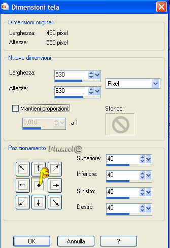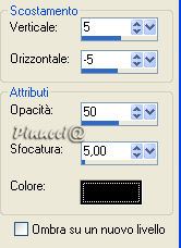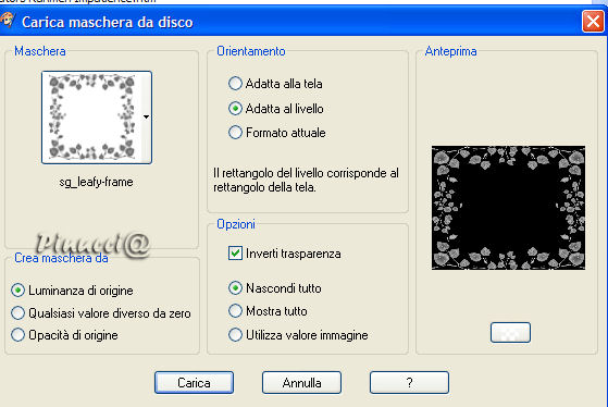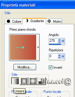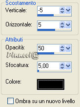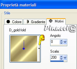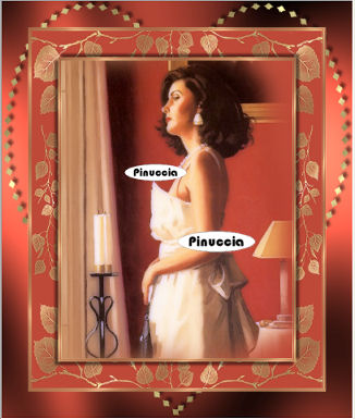 qui puoi trovare qualche risposta ai tuoi dubbi. Se l'argomento che ti interessa non è presente, ti prego di segnalarmelo. Occorrente: Materiale qui Nello zip trovi: il tube DaisyWeb_JackVettriano_OneMomentInTime il motivo oro GoldFold la maschera sg_leafy-frame (mettila nella tua cartella maschere), Filtro Graphics Plus qui Daisy ha concesso soltanto l'uso personale dei suoi tubes. Non puoi usarli per i tuoi tutorial. Non cambiare il nome del file e non cancellare il livello del copyright. 1. Apri una nuova immagine trasparente 350 x 450 pixels. Imposta il colore di primo piano con #c88d64, e il colore di sfondo con #bf4939. Passa il colore di primo piano a Gradiente di primo piano/sfondo: ![]() Riempi l'immagine con questo gradiente.2. Apri il tube DaisyWeb_JackVettriano_OneMomentInTime e vai a Modifica>Copia. Torna al tuo lavoro e vai a Modifica>Incolla come nuovo livello. 3. Livelli>Unisci>Unisci tutto. 4. Immagine>Aggiungi bordatura, 1 pixel, simmetriche, con un colore qualsiasi, purchè non sia presente nell'immagine. Seleziona il bordo con la bacchetta magica ![]() (tolleranza e sfumatura a 0). Apri il motivo oro che hai trovato nello zip e minimizzalo. Passa il colore di primo piano a Motivi. Apri il menu cliccando sulla freccia a fianco del box e troverai il motivo nella lista. Selezionalo con i seguenti settaggi: ![]() Riempi la selezione con questo motivo.Selezione>Deseleziona. Immagine>Aggiungi bordatura, 1 pixel, simmetriche, con un colore scuro preso dall'immagine. Io ho usato #bf4939. Immagine>Aggiungi bordatura, 1 pixel, simmetriche, con un colore qualsiasi, purchè non presente nell'immagine. Seleziona il bordo con la bacchetta magica ![]() e riempilo con il motivo oro.Immagine>Aggiungi bordatura, 1 pixel, simmetriche, con il colore scuro. Immagine>Aggiungi bordatura, 1 pixel, simmetriche, con un colore qualsiasi, purchè non presente nell'immagine. Seleziona il bordo con la bacchetta magica ![]() e riempilo con il motivo oro.5. Immagine>Aggiungi bordatura, 40 pixels, simmetriche, con il colore scuro. Seleziona il bordo con la bacchetta magica ![]() Livelli>Nuovo livello raster. Riempi con il motivo oro.Livelli>Carica/salva maschera>Carica maschera da disco: cerca e seleziona la maschera sg_leafy-frame: ![]() Livelli>Unisci>Unisci gruppo. Regola>Messa a fuoco>Metti a fuoco, 2 volte. 6. Selezione>Inverti. Effetti>Effetti 3d>Sfalsa ombra: ![]() Ripeti l'Effetto Sfalsa ombra, ma invertendo i valori verticale e orizzontale: ![]() 7. Selezione>Deseleziona. Livelli>Unisci>Unisci tutto. . 8. Ripeti il passo 4. 9. Livelli>Innalza livello di sfondo. Immagine>Dimensione tela. ![]() Livelli>Nuovo livello raster. Riempi con il colore scuro di sfondo.Effetti>Plugins>Graphics Plus - Cross Shadow, con i settaggi standard. ![]() Livelli>Disponi>Sposta giù. Rimani sul livello inferiore. Attiva lo strumento Forme predefinite , e scegli la forma di un cuore,crea come vettore selezionato, stile linea rombi, larghezza 8 pixels. Chiudi il colore di sfondo e imposta il colore di primo piano sul motivo oro. Disegna un cuore per tutta la larghezza dell'immagine. ![]() Livelli>Converti in livello raster. Effetti>Effetti 3D>Sfalsa ombra: ![]() 10. Livelli>Unisci>Unisci tutto. Ripeti il passo 4. 11. Ripeti i passi 5, 6 e 7. 12. Immagine>Aggiungi bordatura, 4 pixels, simmetriche, con un colore qualsiasi, purchè non presente nell'immagine. Seleziona il bordo con la bacchetta magica ![]() e riempilo con il motivo oro.Immagine>Aggiungi bordatura, 2 pixels, simmetriche, con il colore scuro. Immagine>Aggiungi bordatura, 4 pixels, simmetriche, con un colore qualsiasi, purchè non presente nell'immagine. Seleziona il bordo con la bacchetta magica ![]() e riempilo con il motivo oro.13. Apri il tube di un angolo a tua scelta e vai a Modifica>Copia. Torna al tuo lavoro e vai a Modifica>Incolla come nuovo livello. Spostalo nell'angolo in alto a sinistra.Effetti>Effetti 3D>Sfalsa ombra, con i settaggi del passo 9. Livelli>Duplica. Immagine>Rifletti. Immagine>Capovolgi. Non dimenticare di aggiungere il tuo nome o il tuo watermark. Immagine>Ridimensiona, a 600 pixels di altezza. Salva in formato jpg. ![]() Se hai problemi o dubbi, o trovi un link non funzionante, o anche soltanto per dirmi che ti è piaciuto, scrivimi. 5 Marzo 2007 |