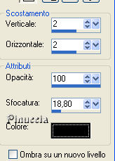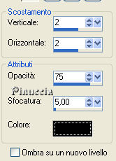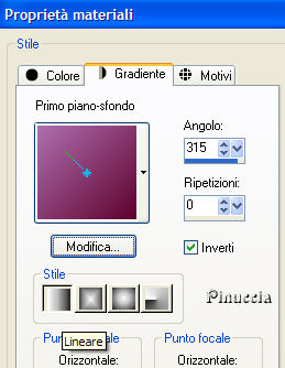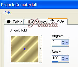 qui puoi trovare qualche risposta ai tuoi dubbi. Se l'argomento che ti interessa non è presente, ti prego di segnalarmelo. Occorrente: ../../materiale qui Metti la Forma (PresetShape) nella cartella Forme predefinite di PSP. Filtri: Dsb.flux Linear Transmission qui Xero qui Daisy ha concesso l'uso solo personale del suo tube. Non usatelo per altri tutorial. Non cancellate il livello del nome e non rimuovete il livello del copyright. 1. Apri una nuova immagine trasparente 550 x 400 pixels. Imposta il colore di primo piano con #ae6eaf, e il colore di sfondo con #5f032e. Passa il colore di primo piano a Gradiente di primo piano/sfondo, con i seguenti settaggi: ![]() Riempi l'immagine con questo gradiente.2. Effetti>Plugins>Dsb Flux - Linear Transmission: ![]() 3. Apri il tube Orchid e vai a Modifica>Copia. Torna al tuo lavoro e vai a Modifica>Incolla>Incolla come nuovo livello. Nella paletta dei livelli cambia la modalità di miscelatura in Sovrapponi e abbassa l'opacità al 60%. 4. Attiva il livello inferiore. Clicca sulla freccia tra le caselle dei materiali per passare il gradiente a colore di sfondo. Imposta il colore di primo piano su Motivi e seleziona il motivo oro "D-GoldFoldGoldtextur" ![]() Attiva lo strumento Forme predefinite , vettore selezionato, mantieni stile non selezionatolarghezza 2 pixels. Cerca la forma Tutorial Ballerina e tracciala sull'immagine. ![]() Livelli>Converti in livello raster. Effetti>Effetti 3D>Sfalsa ombra, con i seguenti settaggi: ![]() 5. Attiva il livello superiore. Apri il tube DaisyWeb_SweetBallet-01 e vai a Modifica>Copia. Torna al tuo lavoro e vai a Modifica>Incolla>Incolla come nuovo livello. Immagine>Ridimensiona, del 70%, tutti i livelli non selezionato. ![]() Spostalo a sinistra.Livelli>Duplica. Livelli>Unisci>Unisci giù. 6. Livelli>Duplica. Immagine>Rifletti. Attiva il livello della prima ballerina. Cambia la modalità di miscelatura in Luce netta. Attiva il livello superiore della ballerina. Cambia la modalità di miscelatura in Luminanza (esistente), e abbassa l'opacità al 60%. 7. Livelli>Unisci>Unisci visibile. ![]() 8. Passa il colore di sfondo sul motivo Goldtextur. Chiudi il colore di primo piano. Attiva lo strumento Testo ![]() Cerca un bel font, come vettore, scrivi un testo e posizionalo tra le braccia delle ballerine. Livelli>Converti in livello raster. Effetti>Effetti 3D>Sfalsa ombra, con i seguenti settaggi: ![]() Cerca un altro bel testo, scrivi il tuo nome e posizionalo tra i piedi delle ballerine. Livelli>Converti in livello raster. Effetti>Effetti 3D>Sfalsa ombra, con i settaggi precedenti. Livelli>Unisci>unisci visibile. 10. Effetti>Plugins>Xero - Porcelain, con i settaggi standard. ![]() Non dimenticare il tuo watermark, e salva in formato jpg. ![]() Se hai problemi o dubbi, o trovi un link non funzionante, o anche soltanto per un saluto, scrivimi. Novembre 2006 |