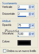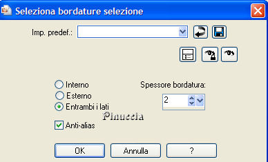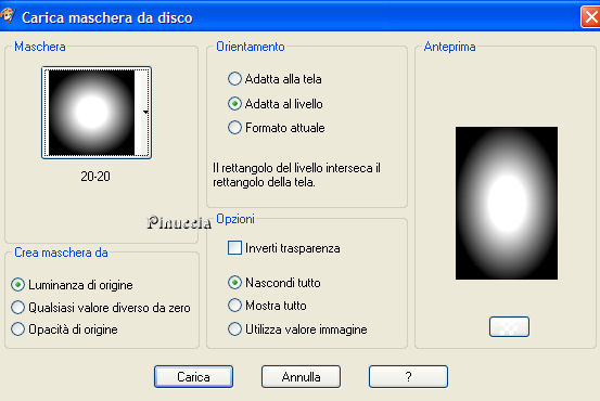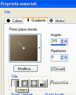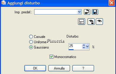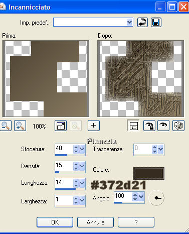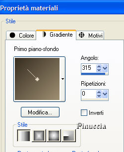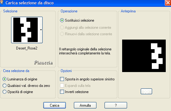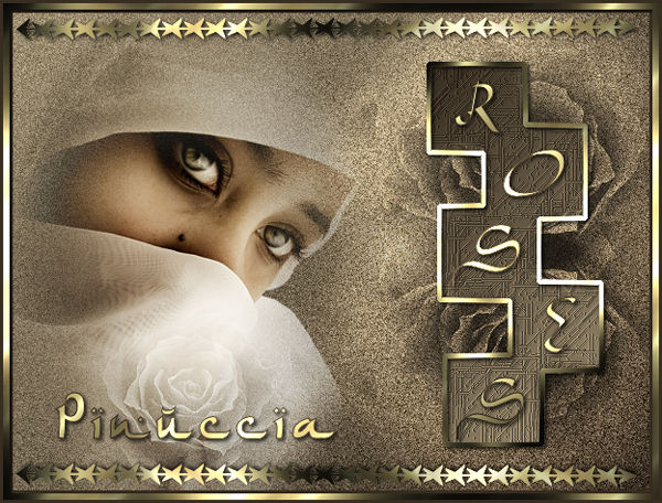 qui puoi trovare qualche risposta ai tuoi dubbi. Se l'argomento che ti interessa non è presente, ti prego di segnalarmelo. Occorrente: Materiale qui Nello zip trovi: il tube di Brigitte Mtm_Face 75-Impression-FR-1 August 2006; il tube di Patry Mists_06_Rose_15, le selezioni Desert_Rose1 und 2 (mettile nella cartella Selezioni di PSP), la maschera 20/20 (mettila nella cartella maschere di PSP), un motivo Oro (aprilo e minimizzalo nella tua area di lavoro, lo troverai disponibile nella lista dei motivi quando ne avrai bisogno), i fonts Aladdineine e ArabDances (aprili e minimizzali: li troverai nella lista dei font disponibili quando ti serviranno). Filtro Graphics Plus qui Patry e Brigitte hanno concesso i loro tubes soltanto per uso personale. Non puoi usarli per i tuoi tutorial. Non cambiare il nome del tube e non cancellare il livello del copyright. 1. Apri una nuova immagine trasparente 600 x 450 pixels. Imposta il colore di primo piano con #9e8f72, e il colore di sfondo con #372d21. Passa il colore di primo piano a Gradiente di primo piano/sfondo, con i seguenti settaggi: ![]() 2. Riempi l'immagine con questo gradiente.Regola>Aggiungi/Rimuovi disturbo>Aggiungi disturbo: ![]() ![]() 3. Apri il tube di Brigitte Mtm_Face 75-Impression-FR-1 August 2006 e vai a Modifica>Copia. Torna al tuo lavoro e vai a Modifica>Incolla>Incolla come nuovo livello. Sposta il tube a sinistra.4. Livelli>Carica/Salva maschera>Carica maschera da disco: cerca e carica la maschera 20-20, con i seguenti settaggi: ![]() Livelli>Unisci>Unisci gruppo. 5. Livelli>Nuovo livello raster. Livelli>Carica/Salva selezione>Carica selezione da disco: cerca e carica la selezione Desert_Rose1: ![]() 6. Imposta il colore di primo piano a Motivi, e seleziona il Motivo oro. Riempi la selezione con il motivo oro.7. Effetti>Plugins>Graphics Plus, Cross Shadow, con i settaggi standard. ![]() Ripeti l'Effetto Cross Shadow. Effetti>Effetti 3D>Sfalsa ombra, con i seguenti settaggi: ![]() Selezione>Nessuna selezione. Livelli>Duplica. Immagine>Capovolgi. 9. Livelli>Unisci>Unisci visibile. ![]() 10. Livelli>Nuovo livello raster. Selezione>Carica/Salva selezione>Carica selezione da disco, cerca e carica la selezione Desert_rose2. ![]() Imposta nuovamente il colore di primo piano su Gradiente e togli la spunta a Inverti. ![]() Riempi la selezione con questo gradiente.11. Effetti>Effetti di trama>Incannicciato, con i seguenti settaggi, e il colore scuro di sfondo. ![]() 12. Selezione>Modifica>Seleziona bordature selezione: ![]() Livelli>Nuovo livello raster. Riempi con il motivo oro.13. Effetti>Plugins>Cross Shadow, con i settaggi standard, 2 volte. Effetti>Effetti 3D>Sfalsa ombra, con i settaggi del passo 7. ![]() 14. Selezione>Nessuna selezione. Livelli>Unisci>Unisci giù. ![]() 15. Imposta il colore di sfondo con il motivo oro, e il colore di primo piano con il colore scuro #372d21. Attiva lo strumento Testo , font Aladdin,dimensione 48, crea come Vettore, pennellata 1. Scrivi ogni lettera della parola Roses nei piccoli riquadri. Per ogni lettera: Livelli>Converti in livello raster. Effetti>Plugins>Graphics Plus - Cross Shadow, settaggi standard. Effetti>Effetti 3D>Sfalsa ombra, con i settaggi precedenti. 16. Livelli>Unisci>Unisci giù, quattro volte, finchè il testo non sarà in un unico livello. ![]() 17. Attiva il livello inferiore. Apri il tube PatryMists_06_Rose_15 e vai a Modifica>Copia. Torna al tuo lavoro e vai a Modifica>Incolla>Incolla come nuovo livello. Spostalo sotto la forma con il testo.Cambia la modalità di miscelatura di questo livello in Sovrapponi. Livelli>Duplica. Immagine>Capovolgi. ![]() 18. Attiva il primo livello della rosa (Raster 3) e ancora una volta Livelli>Duplica. Immagine>Ridimensiona, al 70%, ricampionamento bicubica, tutti i livelli non selezionato. ![]() Immagine>Rifletti. Sposta questa rosa sul velo del tube della donna.Abbassa l'opacità di questo livello al 60%. ![]() ![]() 19. Livelli>Unisci>Unisci visibile. Attiva lo strumento Testo ,colore di sfondo impostato sul motivo oro, e il colore di primo piano impostato con il colore scuro #372d21. Font ArabDances, crea come vettore, dimensione a seconda della lunghezza del tuo nome. Scrivi il testo e posizionalo. Livelli>converti in livello raster. Effetti>Plugins>Graphics Plus, Cross Shadow, settaggi standard. Effetti>Effetti 3D>Sfalsa ombra, con i settaggi precedenti. Livelli>Unisci>Unisci tutto. 20. Immagine>Aggiungi bordatura, 3 pixels, simmetriche, con il colore scuro di sfondo: #372d21. Immagine>Aggiungi bordatura, 6 pixels, simmetriche, con il colore bianco. Seleziona il bordo con la bacchetta magica (sfumatura e tolleranza 0).Riempi la selezione con il motivo oro.Effetti>Plugins>Graphics Plus, Cross Shadow, con i settaggi standard, due volte. Effetti>Effetti 3D>Sfalsa ombra, con i settaggi precedenti. Selezione>Nessuna selezione. Immagine>Aggiungi bordatura, 3 pixels, simmetriche, con il colore scuro #372d21. Aggiungi, se vuoi, il tuo watermark. Immagine>Ridimensiona, a 600 pixels di larghezza e salva in formato jpg. ![]() Se hai problemi o dubbi, o trovi un link non funzionante, o anche soltanto per un saluto, scrivimi. 21 Marzo 2007 |