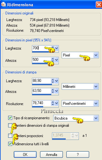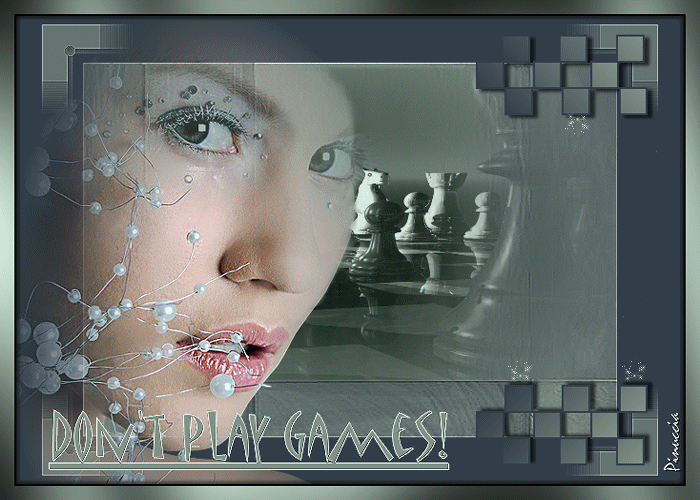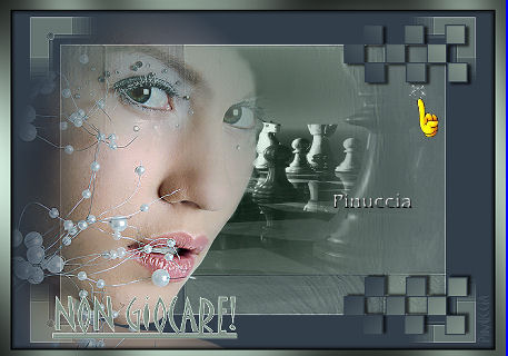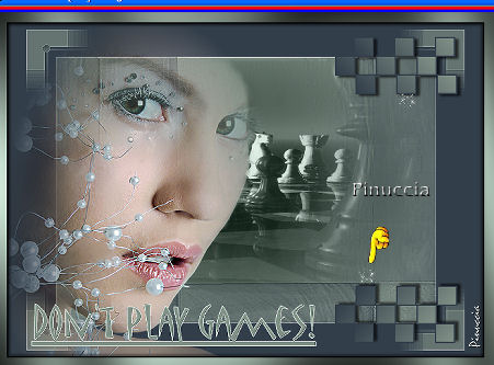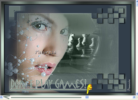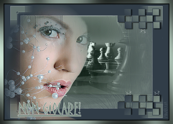qui puoi trovare qualche risposta ai tuoi dubbi. Se l'argomento che ti interessa non è presente, ti prego di segnalarmelo. Occorrente: Materiale qui Metti la maschera nella cartella Maschere. Metti la selezione nella cartella Selezioni. Importa il pennello in PSP. Il tube fornito con il tutorial è di Angel Epiphany è concesso per un uso personale. Non puoi utilizzarlo per i tuoi tutorial. Non modificare il nome e non cancellare il livello del copyright. Filtro Graphics Plus qui 1. Apri una nuova immagine trasparente 700 x 500 pixels. Imposta il colore di primo piano con un colore chiaro preso dal tube "Chessboard" e un colore scuro come colore di sfondo. Riempi l'immagine con il colore di primo piano.Livelli>Carica/salva maschera>Carica maschera da disco. Cerca e carica la maschera MD-mask-205: ![]() Livelli>Unisci>Unisci gruppo. 2. Livelli>Nuovo livello raster. Riempi il nuovo livello con il colore scuro di sfondo.Livelli>Disponi>Sposta giù. Attiva il livello superiore (quello della maschera). Immagine>Ridimensiona: ![]() Effetti>Effetti di bordo>Aumenta. 3. Attiva nuovamente il livello inferiore. Livelli>Nuovo livello raster. Attiva lo strumento Pennello. Cerca e seleziona il pennello prettyedge-kris e applicalo con il colore chiaro di primo piano nell'angolo in alto a sinistra. Effetti>Effetti di bordo>Aumenta. 4. Livelli>Duplica. Immagine>Rifletti. Livelli>Duplica. Immagine>Capovolgi. Livelli>Duplica. Immagine>Rifletti. Adesso avrai il pennello in ogni angolo dell'immagine: ![]() 5. Attiva ancora il livello della Maschera. Selezione>Seleziona tutto. Selezione>Mobile. Selezione>Immobilizza. Livelli>Nuovo livello raster. Apri il tube Chessboard e vai a Modifica>Copia. Torna al tuo lavoro e vai a Modifica>Incolla>Incolla nella selezione. Nella paletta dei livelli cambia la modalità di miscelatura in Luminanza (esistente). Selezione>Nessuna selezione. 6. Apri il tube Clmsface020a100 e vai a Modifica>Copia. Modifica>Incolla>Incolla come nuova immagine e chiudi l'originale. Livelli>Carica/Salva maschera>Carica maschera da disco. Cerca e carica la maschera 20-20: ![]() Livelli>Unisci>Unisci gruppo. Modifica>Copia. Torna al tuo lavoro e vai a Modifica>Incolla>Incolla come nuovo livello. Immagine>Ridimensiona: ![]() Spostalo a sinistra.7. Attiva il livello con il tube Chessborad - dovrebbe trovarsi sotto il livello del tube della donna. Attiva lo strumento Gomma con questi settaggi:![]() e cancella i segni del tube dal viso della donna. ![]() Livelli>Unisci>Unisci visibile. 8. Con i colori scelti all'inizio, passa il colore di primo piano a Gradiente, lineare: ![]() Livelli>Nuovo livello raster. Selezione>Carica/Salva selezione>Carica selezione da disco: Cerca e carica la selezione SEL Datei Dont_Play_Games1: ![]() Riempi la selezione con il colore scuro di sfondo.Selezione>Modifica>Contrai, di 2 pixels. Riempi la selezione con il gradiente.Selezione>Nessuna selezione. Effetti>Effetti 3D>Sfalsa ombra, con i seguenti settaggi: ![]() 9. Livelli>Duplica. Sposta questo livello sotto il precedente, sfalsando i quadretti.Nuovamente Livelli>Duplica. Spostalo allo stesso modo del precedente.![]() Chiudi tutti i livelli, tranne questi tre livelli superiori. Livelli>Unisci>Unisci visibile. Adesso puoi riaprire tutti i livelli: per fare più velocemente vai a Livelli>Visualizza>Tutto. Livelli>Duplica. Immagine>Capovolgi. Livelli>Unisci>Unisci tutto. ![]() 10. Passa a colore di sfondo il colore chiaro scelto come colore di primo piano. Attiva lo strumento Testo e scegli un bel font.Io ho selezionato la sottolineatura e crea come vettore. Scrivi il testo e posizionalo. Livelli>Converti in livello raster. Effetti>Effetti 3D>Sfalsa ombra, con il colore #c0c0c0. ![]() Effetti>Effetti di bordo>Aumenta. 11. Immagine>Aggiungi bordatura, 2 pixels, simmetriche, con il colore nero (#000000). Immagine>Aggiungi bordatura, 15 pixels, simmetriche, con il colore bianco (#ffffff). Attiva lo strumento Bacchetta magica , sfumatura e tolleranza 0,e seleziona il bordo bianco. Riempi il bordo con il colore chiaro.Mantieni selezionato. Effetti>Plugins>Graphics Plus - Cross Shadow, con i settaggi standard. ![]() Effetti>Effetti 3D>Sfalsa ombra, con i seguenti settaggi: ![]() Ripeti l'Effetto Sfalsa ombra, ma invertendo i valori verticali e orizzontale. ![]() Selezione>Nessuna selezione. 12. Aggiungi la tua firma o il tuo watermark. Livelli>Unisci>Unisci tutto. Immagine>Ridimensiona, a 700 x 500 pixels, mantieni proporzioni non selezionato: ![]() ![]() Modifica>Copia. Apri Animation Shop: Clicca con il tasto destro del mouse sullo spazio vuoto e Incolla come nuova animazione. ![]() Modifica>Duplica e ripeti finchè non avrai ottenuto una animazione con 18 fotogrammi. Premi sul cursore con il tasto sinistro del mouse e trascinalo fino al primo fotogramma. ![]() (Questo è importante, perchè se rimani dove ti trovi dopo aver duplicato i fotogrammi, l'animazione non riuscirà). Clicca sul primo fotogramma per selezionarlo. Il fotogramma deve diventare blu. Se non diventa blu vuol dire che non è selezionato. ![]() Modifica>Seleziona tutto. Apri adesso l'animazione fornita nello zip con il tutorial: Arrow_dont_play.mng. Clicca sul primo fotogramma per selezionarlo. Modifica>Seleziona tutto. Modifica>Copia. Ritorna al tuo lavoro e vai a Modifica>Incolla>Incolla nel fotogramma selezionato. Vedrai apparire l'animazione che si sposterà ad ogni movimento del mouse. Posizionala nello spazio vuoto sotto il quadretto centrale e, quando sei certo della posizione corretta, clicca con il tasto sinistro del mouse. ![]() Ritorna all'animazione della freccia. I fotogrammi dovrebbero essere ancora selezionati tutti. Animazione>Capovolgi. Modifica>Copia. Ritorna al tuo lavoro e vai a Modifica>Incolla>Incolla nel fotogramma selezionato. Posiziona la freccia nello spazio vuoto sopra il quadretto in basso a sinistra. ![]() Ripeti Modifica>Incolla>Incolla nel fotogramma selezionato e posizionala nell'altro quadratino a destra. Avrai così - al 