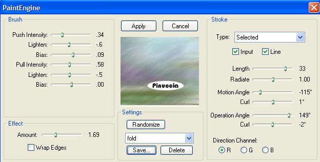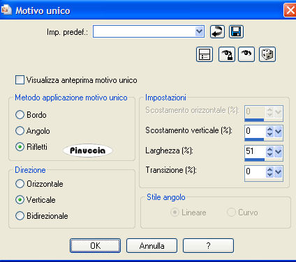 qui puoi trovare qualche risposta ai tuoi dubbi. Se l'argomento che ti interessa non è presente, ti prego di segnalarmelo. Occorrente: Una bella immagine con uno scenario fantasia, la mia viene dal sito di http://rustyrust.dreamg8.com Rusty Rust Per favore, non togliere il copyright dell'artista. Il tube autumnbeauty_jolovesdogs che trovi qui è di JoLuvsDogs Filtri: Fantastic Machine - Paint Engine qui Flaming Pear - Aetherize qui Bordermania qui Xero - Porcelain qui 1. Apri la tua immagine. Duplicala con shift+D e minimizza la copia, che ti servirà più tardi. 2. Immagine>Ridimensiona, con i seguenti settaggi: ![]() 3. Effetti>Effetti di distorsione>Vento, da sinistra, intensità 100. ![]() Effetti>Effetti di distorsione, da destra, intensità 100. ![]() 4. Effetti>Plugins>Fantastic Machine - Paint Engine: ![]() Se non hai questo preset nel filtro, copia esattamente le impostazioni dell'esempio, oppure, se vuoi, puoi giocare e sperimentare altri settaggi. ![]() 5. Regola>Messa a fuoco>Metti a fuoco. Effetti>Effetti di immagine>Motivo unico: ![]() 6. Attiva la copia dell'immagine. 7. Immagine>Ridimensiona, con i seguenti settaggi: ![]() Scegli dall'immagine un colore chiaro come colore di primo piano e un colore scuro come colore di sfondo. Immagine>Aggiungi bordatura, 2 pixels, simmetriche, con il colore scuro. Immagine>Aggiungi bordatura, 2 pixels, simmetriche, con il colore chiaro. Immagine>Aggiungi bordatura, 2 pixels, simmetriche, con il colore scuro. 8. Selezione>Seleziona tutto. Selezione>Modifica>Contrai, di 6 pixels. Selezione>Inverti. Effetti>Plugins>Bordermania - Frame #2: ![]() Selezione>Nessuna selezione. 9. Modifica>Copia. Attiva adesso l'immagine più grande e vai a Modifica>Incolla>Incolla come nuovo livello. Sposta l'immagine a destra, un po' in alto.![]() Effetti>Effetti 3D>Sfalsa ombra: ![]() 10. Apri il tube autumnbeauty_jolovesdogs e vai a Modifica>Copia. Torna al tuo lavoro e vai a Modifica>Incolla>Incolla come nuovo livello. Spostala a sinistra.Cambia la modalità di miscelatura di questo livello in Luminanza (esistente), e abbassa l'opacità al 60%. ![]() 11. Livelli>Unisci>Unisci visibile. Effetti>Plugins>Flaming Pear Aetherize: Il settaggio dipende dall'immagine che stai usando. Eventualmente, nel caso avessi bisogno di regolare i settaggi per adattarli alla tua immagine, tieni presente che lo scopo di questo filtro è di rafforzare i colori dell'immagine. ![]() ![]() 12. Effetti>Plugins>Xero - Porcelain: ![]() 13. Immagine>Aggiungi bordatura, 2 pixels, simmetriche, con il colore scuro. Immagine>Aggiungi bordatura, 2 pixels, simmetriche, con il colore chiaro. Immagine>Aggiungi bordatura, 2 pixels, simmetriche, con il colore scuro. 8. Selezione>Seleziona tutto. Selezione>Modifica>Contrai, di 6 pixels. Selezione>Inverti. Effetti>Plugins>Bordermania - Frame #2: ![]() Selezione>Nessuna selezione. ![]() 14. Aggiungi il tuo watermark su un nuovo livello. Livelli>Unisci>Unisci visibile. 15. Inverti i colori nella paletta dei materiali, in modo che il colore chiaro passi a colore di sfondo. Chiudi il colore di primo piano. Attiva lo strumento Testo , scegli un font, crea come vettore,(io ho scelto il font standard di Windows Vivaldi), scrivi il tuo testo e posizionalo in basso a sinistra. Livelli>Converti in livello raster. 16. Duplica 2 volte il livello del testo. 17. Chiudi i livelli delle copie e attiva il livello originale. ![]() Regola>Aggiungi/Rimuovi disturbo>Aggiungi disturbo: ![]() Modifica>Copia Unione. Apri Animation Shop. Clicca con il tasto destro del mouse sullo spazio vuoto e Incolla come nuova animazione. Ritorna in PSP. Chiudi il livello del testo e attiva la prima copia. ![]() Regola>Aggiungi/Rimuovi disturbo>Aggiungi disturbo: ![]() Modifica>Copia Unione. In Animation Shop: Modifica>Incolla>Incolla dopo il fotogramma corrente. Ancora una volta in PSP. Chiudi la prima copia del livello di testo e attiva la seconda copia. ![]() Regola>Aggiungi/Rimuovi disturbo/aggiungi disturbo: ![]() Modifica>Copia Unione. Ancora in Animation Shop: Modifica>Incolla>Incolla dopo il fotogramma corrente. La tua animazione è pronta. Clicca sul primo fotogramma per selezionarlo e vai a Modifica>Seleziona tutto. Animazione>Proprietà fotogramma, e imposta la velocità a 15. ![]() Salva in formato gif. ![]() Se hai problemi o dubbi, o trovi un link non funzionante, o anche soltanto per un saluto, scrivimi. 5 Luglio 2007 |