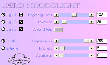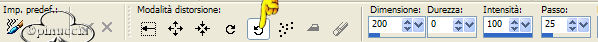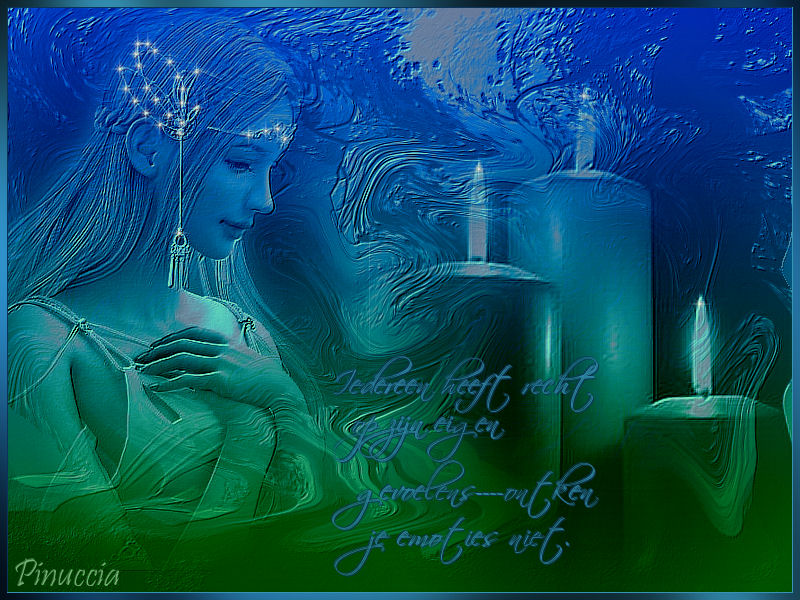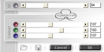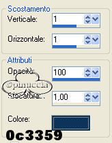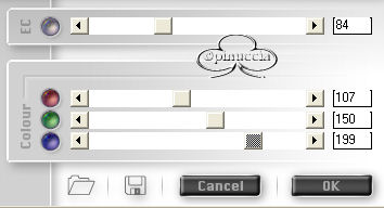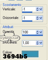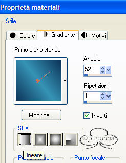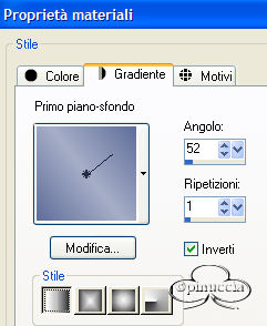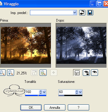 qui puoi trovare qualche risposta ai tuoi dubbi. Se l'argomento che ti interessa non è presente, ti prego di segnalarmelo. Occorrente: Materiale qui nello zip: i tubes "Fairy" e "Kerze1"; l'immagine "Woods"; il pennello "Emoties"; l'ornamento "Star" Metti il Pennello nella cartella Pennelli. se hai problemi con i pennelli vedi qui Metti l'ornamento nella cartella Ornamenti. Filtri: Graphics Plus qui Xero qui FM Tile Tools qui Fotomatic Skygrad qui 1. Apri una nuova immagine trasparente 800 x 600 pixels. Selezione>Seleziona tutto. Apri l'immagine Bild Woods e vai a Modifica>Copia. Torna al tuo lavoro e vai a Modifica>Incolla>Incolla nella selezione. Regola>Saturazione e Tonalità>Viraggio: ![]() ![]() 2. Livelli>Nuovo livello raster. Imposta il colore di primo piano con #a6aec7, e il colore di sfondo con #5f6d99. Passa il colore di primo piano a Gradiente di primo piano/sfondo, con i seguenti settaggi: ![]() Riempi il livello con questo gradiente.Livelli>Disponi>Sposta giù. 3. Attiva il livello superiore con l'immagine del Bosco. Attiva lo strumento Pennello distorsione ![]() ![]() "gira" l'immagine da sinistra a destra per ottenere qualcosa di simile a questo: ![]() Abbassa l'opacità di questo livello al 44%. Livelli>Unisci>Unisci visibile. 4. Copia il tube della fata e vai a Modifica>Copia. Torna al tuo lavoro e vai a Modifica>Incolla>Incolla come nuovo livello. Spostalo sul lato sinistro.![]() Cambia la modalità di miscelatura di questo livello in Luminanza (esistente). 5. Attiva il tube delle candele e vai a Modifica>Copia. Torna al tuo lavoro e vai a Modifica>Incolla>Incolla come nuovo livello. Spostalo a destra, in basso.Cambia la modalità di miscelatura in Luminanza (Esistente). ![]() 6. Livelli>Unisci>Unisci visibile. Effetti>Plugins>FM Tile Tools - Blend Emboss, con i settaggi standard. ![]() Ripeti l'Effetto Blend Emboss. Effetti>Plugins>Fotomatic Sky Grad: ![]() Immagine>Capovolgi. Effetti>Plugins>Fotomatic>Skygrad: ![]() ![]() 7. Immagine>Capovolgi. Effetti>Plugins>Xero - Moodlight: ![]() Imposta il colore di primo piano con #3694b5, e il colore di sfondo con #0c3359. Passa il colore di primo piano a gradiente di primo piano/sfondo, con i seguenti settaggi: ![]() Livelli>Nuovo livello raster. Selezione>Seleziona tutto. Riempi con il gradiente.Selezione>Modifica>Contrai, di 7 pixels. Premi sulla tastiera il tasto CANC. Selezione>Inverti. 8. Effetti>Plugins>Graphics Plus - Cross Shadow, con i settaggi standard: ![]() Effetti>Effetti 3D>Sfalsa ombra, con i seguenti settaggi, colore #0c3359. ![]() Ripeti l'Effetto Sfalsa ombra, ma cambiando verticale e orizzontale a -1 e il colore con #3694b5: ![]() Selezione>Nessuna selezione. 9. Livelli>Nuovo livello raster. Attiva lo strumento Pennello ![]() cerca e seleziona il pennello "emoties" e applicalo con il con il colore di primo piano #3694b5. Clicca più volte per renderlo più visibile. Effetti>Effetti 3D>Sfalsa ombra, con gli stessi settaggi del passo 8, e con il colore #0c3359. ![]() Ripeti l'Effetto Sfalsa ombra, ma cambiando verticale e orizzontale a - 10. Aggiungi il tuo nome o il tuo watermark in un nuovo livello. Livelli>Unisci>Unisci visibile. 11. Livelli>Nuovo livello raster. Attiva lo strumento Ornamento ,seleziona la stella (che hai trovato nello zip), dimensione 20, e applicala intorno all'acconciatura della fata. Vedi l'esempio della tag finale. Regola>Messa a fuoco>Metti a fuoco. Livelli>Unisci>Unisci tutto. Salva in formato jpg. ![]() Se hai problemi o dubbi, o trovi un link non funzionante, o anche soltanto per un saluto, scrivimi. Gennaio 2007 |