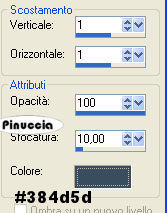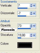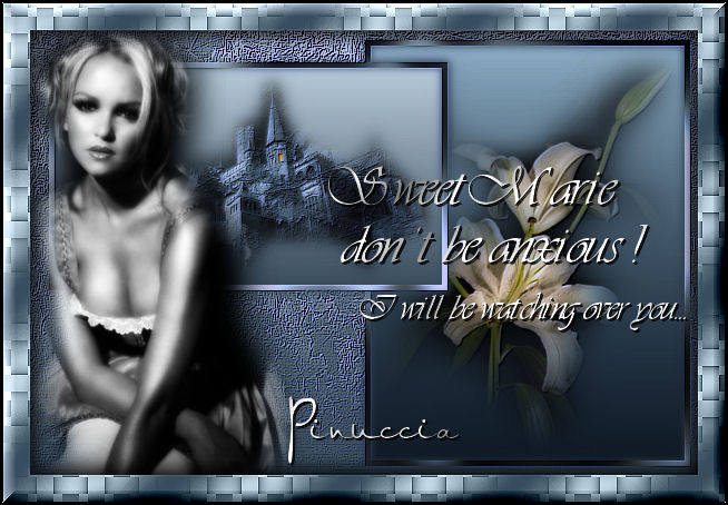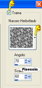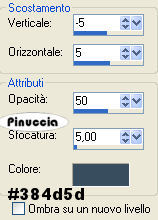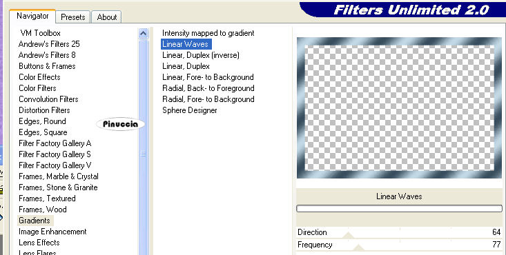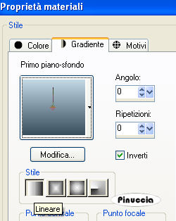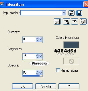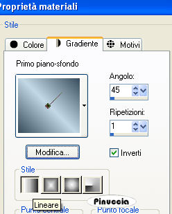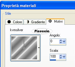 qui puoi trovare qualche risposta ai tuoi dubbi. Se l'argomento che ti interessa non è presente, ti prego di segnalarmelo. Occorrente: Materiale qui Metti la trama Nasses Herbstlaub nella cartella Trame di PSP. Apri il motivo argento kwm silver e minimizzalo nella tua area di lavoro. Lo troverai nella lista dei motivi disponibili, quando ti servirà. Filtri: Filters Unlimited qui FM Tile Tools qui Xero qui Graphics Plus qui Bordermania qui Patry ha concesso soltanto l'uso personale dei suoi tubes. Non puoi usarli per i tuoi tutorials. Non cambiare il nome del file e non cancellare il livello del copyright. 1. Apri una nuova immagine trasparente 600 x 400 pixels. Imposta il colore di primo piano con #c4d9e6, e il colore di sfondo con #384d5d. Passa il colore di primo piano a Gradiente di primo piano/sfondo: ![]() Riempi l'immagine trasparente con questo gradiente.2. Imposta il colore di sfondo spuntando la casella Trame. Apri il menù, cliccando sulla freccia a fianco del box e seleziona la trama Nasses Herbstlaub, con i seguenti settaggi: ![]() 3. Livelli>Nuovo livello raster. Riempi con il colore di sfondo impostato con la trama.per riempire con il colore di sfondo, devi cliccare con il tasto destro del mouse. Abbassa l'opacità di questo livello al 50%. 4. Livelli>Unisci>Unisci visibile. Effetti>Effetti di bordo>Aumenta di più. 5. Effetti>Plugins>FM Tile Tools - Blend Emboss, con i settaggi standard. ![]() ![]() 6. Attiva lo strumento Selezione , rettangolo,e disegna un rettangolo allungato sul lato destro. Livelli>Nuovo livello raster. Riempi la selezione con il gradiente.![]() 7. Attiva il tube PartyMists_06_Flowers, e vai a Modifica>Copia. Torna al tuo lavoro e vai a Modifica>Incolla>Incolla nella selezione. ![]() Mantieni selezionato. Livelli>Duplica. Cambia la modalità di miscelatura del livello superiore in Moltiplica, e quella del livello inferiore in Luminanza (esistente). ![]() Chiudi il livello dello sfondo e posizionati su uno degli altri livelli. Livelli>Unisci>Unisci visibile. Puoi rendere nuovamente visibile il livello di sfondo. 9. Attiva il livello superiore. Selezione>Modifica>Contrai, di 5 pixels. Selezione>Inverti. Selezione>Mobile. Selezione>Immobilizza. Livelli>Nuovo livello raster. Cambia i settaggi del gradiente: ![]() Riempi la selezione del bordo con questo gradiente.Effetti>Plugins>Graphics Plus - Cross Shadow, con i settaggi standard. ![]() Ripeti l'Effetto Cross Shadow. Mantieni selezionato. Effetti>Effetti 3D>sfalsa ombra, con i seguenti settaggi, con il colore scuro di sfondo (#384d5d). ![]() Selezione>Nessuna selezione. Livelli>Unisci>Unisci giù. Ripeti: Effetti>Effetti 3D>Sfalsa ombra, con i settaggi precedenti. ![]() 10. Attiva nuovamente lo strumento Selezione , rettangolo,e disegna un rettangolo sul lato sinistro. Livelli>Nuovo livello raster. Riempi con il primo gradiente.11. Apri il tube PatryMists_Goth 54, e vai a Modifica>Copia. Torna al tuo lavoro e vai a Modifica>Incolla>Incolla nella selezione. ![]() Ripeti tutto il passo 9. ![]() 12. Livelli>Unisci>Unisci visibile. Effetti>Plugins>FM Tile Tools - Blend Emboss, con i settaggi standard. Effetti>Plugins>Xero - Porcelain, con i settaggi standard. ![]() 13. Apri il tube PatryMists_06_Goth53, e vai a Modifica>Copia. Torna al tuo lavoro e vai a Modifica>Incolla>Incolla come nuovo livello. Cambia la modalità di miscelatura di questo livello in Luminanza (esistente). Livelli>Duplica, 2 volte (fai questo perchè il tube abbia una migliore visibilità). Chiudi il livello di sfondo e posizionati su uno dei tre livelli del tube. Livelli>Unisci>Unisci visibile. 14. Rendi nuovamente visibile il livello di sfondo e sposta il tube a sinistra, vicino al bordo.Effetti>Effetti 3D>Sfalsa ombra, con i seguenti settaggi, con il colore scuro di sfondo. ![]() Livelli>Unisci>Unisci visibile. 15. Immagine>Dimensione tela: ![]() Clicca con la bacchetta magica sul bordo trasparente.Livelli>Nuovo livello raster. Riempi con il gradiente del passo 9.16. Effetti>Plugins>Filters Unlimited - Gradients - Linear Waves, con i settaggi standard. ![]() Mantieni selezionato. Effetti>Effetti di trama>Intessitura, imposta il colore scuro di sfondo come colore intessitura: ![]() 17. Effetti>Plugins>Bordermania - Frame #2: ![]() 18. Effetti>Effetti 3D>sfalsa ombra, con i seguenti settaggi, colore nero: ![]() Ripeti l'Effetto Sfalsa ombra, invertendo i valori verticale e orizzontale: ![]() Regola>Messa a fuoco>Metti a fuoco. Selezione>Nessuna selezione. 19. Imposta il colore di sfondo su Motivi, e seleziona il motivo argento kvm silver: ![]() Attiva lo strumento Testo , scegli un font, crea come vettore, e scrivi il testo che preferisci.Io ho scritto il testo in tre righe, per seguire l'esempio del tutorial originale, ma tu puoi scrivere quello che vuoi. Livelli>Converti in livello raster. Effetti>Plugins>Graphics Plus - Cross Shadow, con i settaggi standard. Effetti>Effetti 3D>Sfalsa ombra, con i seguenti settaggi, colore nero - 2 volte. ![]() Aggiungi il tuo nome alla tag. Livelli>Unisci>Unisci visibile. Livelli>Nuovo livello raster. Applica il tuo watermark su questo livello (se vuoi). Livelli>Unisci>Unisci tutto. Immagine>Aggiungi bordatura, 2 pixels, simmetriche, con il colore nero. 20. Immagine>Ridimensiona, a 580 pixels di larghezza. ![]() Se hai problemi o dubbi, o trovi un link non funzionante, o anche soltanto per un saluto, scrivimi. 12 Giugno 2007 |
