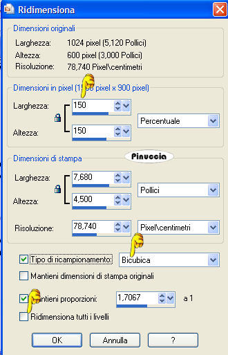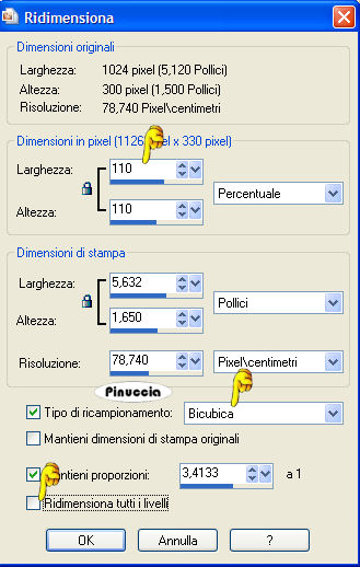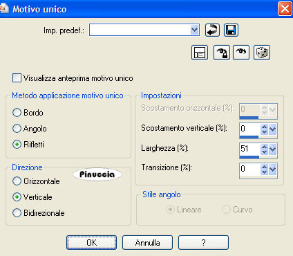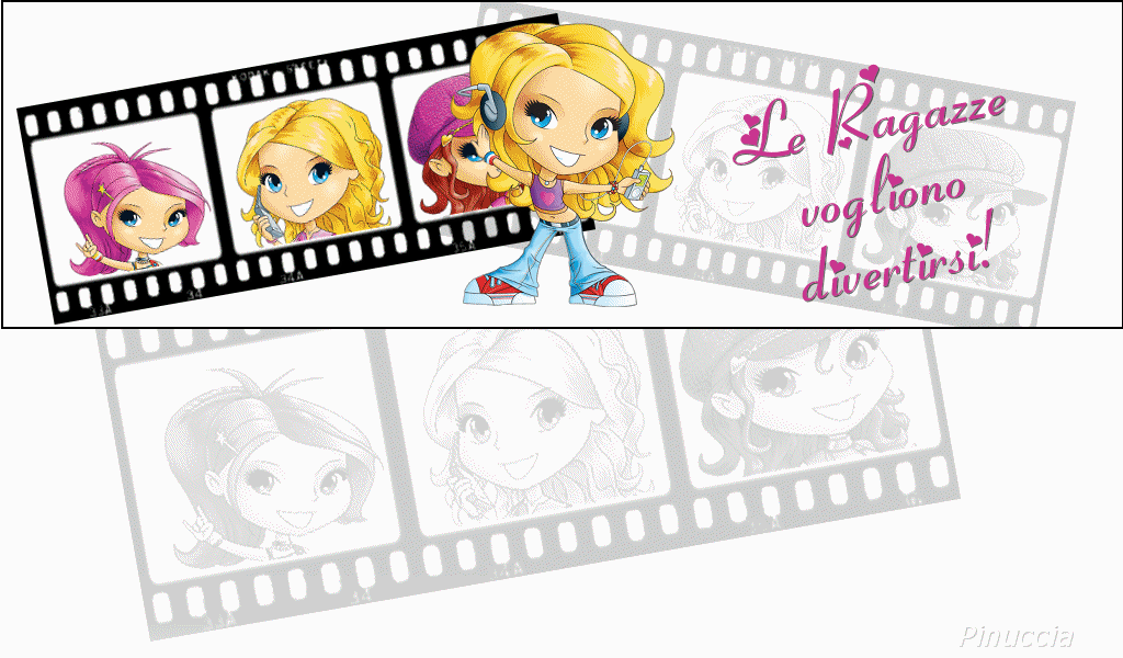 qui puoi trovare qualche risposta ai tuoi dubbi. Se l'argomento che ti interessa non è presente, ti prego di segnalarmelo. Occorrente: Materiale qui 4 Tubes delle ragazze di Mulligan, e il tube Film-stripe di Angel Epiphanie. 1. Apri una nuova immagine trasparente 1024 x 300 pixels. Riempi l'immagine trasparente con il colore bianco.Apri il file "Filmstreifen" e vai a Modifica>Copia. Torna al tuo lavoro e vai a Modifica>Incolla>Incolla come nuovo livello. Attiva lo strumento Bacchetta magica :![]() clicca all'interno dei fotogrammi per selezionarli. ![]() Livelli>Nuovo livello raster. Riempi il nuovo livello con il bianco.Non vedrai differenze, ma se controlli nella paletta dei livelli vedrai l'effetto del riempimento all'interno delle caselle selezionate. ![]() Livelli>Disponi>Sposta giù. Attiva il livello superiore. Livelli>Unisci>Unisci giù. Selezione>Nessuna selezione. 2. Clicca ora con la bacchetta magica sulla prima casella della striscia.Livelli>Nuovo livello raster. Attiva il tube di una delle ragazze di Mulligan. non usare il tube DancingGirl. Questo sarà utilizzato per ultimo. Con lo strumento Selezione , impostato a rettangolo,seleziona la testa della ragazza. ![]() Modifica>Copia. Torna al tuo lavoro e vai a Modifica>Incolla>Incolla nella selezione. Selezione>Nessuna selezione. Regola>Messa a fuoco>Metti a fuoco. Livelli>Unisci>Unisci giù. ![]() 3. Ripeti il punto 2, con altri due tubes e per le altre due caselle del film. Adesso la striscia è completa. 4. Modifica>Copia e poi Modifica>Incolla>Incolla come nuova immagine e minimizza l'immagine per il momento. ![]() 5. Torna al tuo lavoro (1024x400). Duplica il livello con la striscia del film e chiudi il livello duplicato. Attiva il livello originale. ![]() Immagine>Ridimensiona, con i seguenti settaggi: ![]() Cambia la modalità di miscelatura di questo livello in Luminanza (esistente) e abbassa l'opacità al 20%. Immagine>Ruota>Ruota per gradi, ![]() Sposta la striscia a destra.6. Attiva il livello superiore e rendilo nuovamente visibile. Immagine>Ruota>Ruota per gradi, a sinistra, con gli stessi settaggi. ![]() Sposta la striscia a sinistra.Di nuovo Regola>Messa a fuoco>Metti a fuoco. Livelli>Unisci>Unisci visibile. ![]() 7. Apri il tube della ragazza con il walkman "Dancing girl" e vai a Modifica>Copia. Torna al tuo lavoro e vai a Modifica>Incolla>Incolla come nuovo livello. Immagine>Ridimensiona, al 70%, bicubica, tutti i livelli non selezionato. ![]() Livelli>Duplica. Immagine>Rifletti. Sistema il duplicato in modo che i piedi dei due livelli si trovino il più possibile nella medesima posizione.![]() 8. Scegli un bel colore dalla tua immagine e impostalo come colore di sfondo. Chiudi il colore di primo piano. Attiva lo strumento Testo , crea come vettore,scegli un font, scrivi un testo e posizionalo. Quando sei soddisfatto: Livelli>Converti in livello raster. Immagine>Ruota>Ruota per gradi, 10 gradi a sinistra. ![]() Se ti sembra necessario, applica al testo un leggero Effetto Sfalsa ombra. 9. Attiva il livello inferiore. ![]() Selezione>Seleziona tutto. Selezione>Modifica>Contrai, di 2 pixels. Selezione>Inverti. Riempi con il nero.Selezione>Nessuna selezione. 10. Apri una nuova immagine trasparente 1024 x 600 pixels, e riempila con il bianco.Apri nuovamente il tube della pellicola "Filmstreifen" e vai a Modifica>Copia. Torna all'immagine bianca e vai a Modifica>Incolla>Incolla come nuovo livello. Immagine>Ridimensiona, al 150%, tutti i livelli non selezionato: ![]() Immagine>ruota>Ruota per gradi, 10 gradi a sinistra. ![]() Cambia la modalità di miscelatura di questo livello in Luminanza (Esistente), e abbassa l'opacità al 20%. Sposta la pellicola in basso.Livelli>Unisci>Unisci tutto e aggiungi il tuo watermark. Effetti>Effetti di immagine>Motivo unico: ![]() non preoccuparti per il risultato dell'Effetto, i segni che vedrai in alto tra poco saranno nascosti. ![]() Modifica>Copia. Apri Animation Shop. Clicca con il tasto destro del mouse e Incolla come nuova animazione. ![]() Livelli>Duplica. Adesso avrai un'animazione composta da due fotogrammi. Per una migliore visualizzazione, usa la rotellina del mouse: portala indietro per rimpicciolire l'immagine. ![]() Modifica>Seleziona tutto, e minimizzala per il momento. 11. Torna in PSP. Nella paletta dei livelli mantieni chiuso il livello della copia del tube Walkman. ![]() Modifica>Copia unione. Torna in Animation Shop. Clicca con il tasto destro del mouse sullo spazio vuoto e Incolla come nuova animazione. Ancora in PSP. Chiudi il livello del tube originale e apri il livello del duplicato. ![]() Modifica>Copia unione. In Animation Shop Modifica>Incolla>Incolla dopo il fotogramma corrente. Clicca sul primo fotogramma e vai a Modifica>Seleziona tutto e poi Modifica>Copia. Attiva la prima animazione (che hai già selezionato) e vai a Modifica>Incolla>Incolla nel fotogramma corrente. Cerca la posizione corretta e quando l'hai trovata rilascia il tasto del mouse. Potresti avere difficoltà a centrare esattamente l'immagine nel fotogramma. Se dopo aver rilasciato il tasto del mouse, ti accorgi che qualcosa non va, vai a Modifica>Annulla incolla e ripeti. Quando sei soddisfatto: Animazione>Proprietà fotogramma, e imposta la velocità a 50. ![]() Salva in formato gif. |
