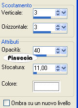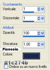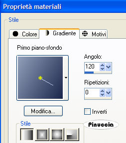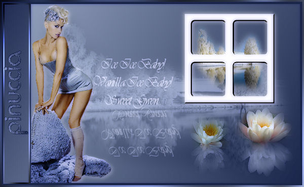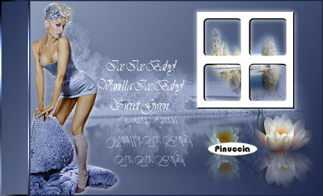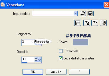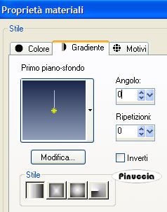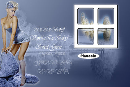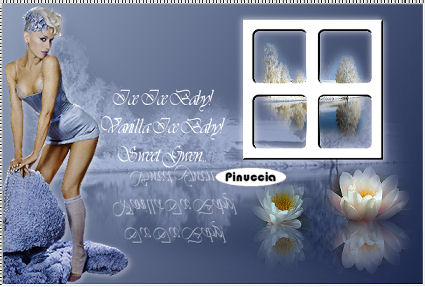 qui puoi trovare qualche risposta ai tuoi dubbi. Se l'argomento che ti interessa non è presente, ti prego di segnalarmelo. Occorrente: Materiale qui Metti il pennello nella cartella dei pennelli. Se hai problemi con i pennelli vedi qui Filtri: Graphics Plus qui Xero qui 1. Apri una nuova immagine trasparente 600 x 400 pixels. Imposta il colore di primo piano con #919fba, e il colore di sfondo con #1c274b. Passa il colore di primo piano a Gradiente di primo piano/sfondo: ![]() Riempi l'immagine trasparente con questo gradiente.2. Selezione>Seleziona tutto. Livelli>Nuovo livello raster. Copia il tube WinterSea e vai a Modifica>Copia. Torna al tuo lavoro e vai a Modifica>Incolla>Incolla nella selezione. Cambia la modalità di miscelatura di questo livello in Luminanza (esistente) e abbassa l'opacità al 50%. Selezione>Nessuna selezione. ![]() 3. Apri il tube Gwen e vai a Modifica>Copia. Torna al tuo lavoro e vai a Modifica>Incolla>Incolla come nuovo livello. Spostalo a sinistra.Effetti>Effetti 3D>Sfalsa ombra: ![]() ![]() 4. Apri il tube Window e vai a Modifica>Copia. Torna al tuo lavoro e vai a Modifica>Incolla>Incolla come nuovo livello. Spostalo sul lato destro, un po' in alto.![]() Attiva lo strumento Bacchetta magica e clicca all'interno delle finestre.Selezione>Modifica>Espandi, di 1 pixel. Copia nuovamente il tube WinterSea. Livelli>Nuovo livello raster. Modifica>Incolla>Incolla nella selezione. Selezione>Nessuna selezione. Livelli>Unisci>Unisci giù. ![]() Effetti>Effetti 2D>Sfalsa ombra, con i settaggi precedenti. Ripeti l'Effetto Sfalsa ombra, ma cambiando verticale e orizzontale a -3. 5. Livelli>Nuovo livello raster. Attiva lo strumento Pennello ![]() cerca e selezione il pennello Vanilla Ice, applicalo con il colore bianco tra il tube della donna e la finestra. ![]() Livelli>Duplica. Immagine>Capovolgi. Sposta i due pennelli, in modo che sembrino riflessi.Abbassa l'opacità del livello duplicato al 48%. ![]() 6. Apri il Tube Waterflower1 e vai a Modifica>Copia. Torna al tuo lavoro e vai a Modifica>Incolla>Incolla come nuovo livello. Livelli>Duplica. Immagine>Rifletti. sposta entrambi i tubes uno contro l'altro, in modo che sembrino riflessi.Cambia la modalità di miscelatura del duplicato in Luminanza (Esistente), e abbassa l'opacità al 42%. Apri il tube Waterflower2 e vai a Modifica>Copia. Torna al tuo lavoro e vai a Modifica>Incolla>Incolla come nuovo livello. Livelli>Duplica. Immagine>Rifletti. Sposta i tubes come hai fatto con il precedente, in modo che sembrino riflessi.Cambia la modalità di miscelatura del duplicato in Luminanza (esistente). e abbassa l'opacità al 42%. ![]() 7. Livelli>Unisci>Unisci tutto. Immagine>Aggiungi bordatura, 2 pixels, simmetriche, con il colore scuro di sfondo. Immagine>Aggiungi bordatura, con il colore bianco, simmetriche non selezionato. ![]() Seleziona il bordo con la bacchetta magica ![]() e riempilo con il gradiente.Livelli>Nuovo livello raster. Riempi con il colore di sfondo.Effetti>Effetti di trama>Veneziana: ![]() Selezione>Modifica>Contrai, di 3 pixels. Selezione>Inverti. Selezione>mobile. Selezione>immobilizza. Livelli>Nuovo livello raster. Riempi con il gradiente.2 volte: Effetti>Plugins>Graphics Plus, Cross Shadow, settaggi standard. ![]() Abbassa l'opacità del livello con l'Effetto Veneziana al 50%. Selezione>Nessuna selezione. Livelli>Unisci>Unisci tutto. ![]() 8. Immagine>Aggiungi bordatura, 3 pixels, simmetriche, con il colore scuro di sfondo. Immagine>Aggiungi bordatura, 4 pixels, simmetriche, con il colore bianco. Seleziona il bordo con la bacchetta magica ![]() e riempilo con il gradiente.Effetti>Plugins>Graphics Plus - Cross Shadow, settaggi standard. Selezione>Nessuna selezione. 9. Imposta il colore di sfondo su Gradiente, con le seguenti impostazioni: ![]() Chiudi il colore di primo piano. Attiva lo strumento Testo ,io ho usato Rondalo, dimensione 48, corsivo. La dimensione dipende dalla lunghezza del testo e dalla versione di PSP che stai usando. Scrivi il tuo nome. Livelli>Converti in livello raster. Regola>Aggiungi/Rimuovi disturbo/Aggiungi disturbo: ![]() Effetti>Effetti 3D>Sfalsa ombra: ![]() Ripeti l'Effetto Sfalsa ombra, ma cambiando verticale e orizzontale a - 1. 10. Livelli>Unisci>Unisci tutto. Effetti>Plugins>Xero - Porcelain, con i settaggi standard. ![]() Aggiungi, se vuoi, il tuo watermark. Immagine>Ridimensiona, a 550 pixels di larghezza e salva in formato jpg. ![]() Se hai problemi o dubbi, o trovi un link non funzionante, o anche soltanto per un saluto, scrivimi. 21 Marzo 2007 |